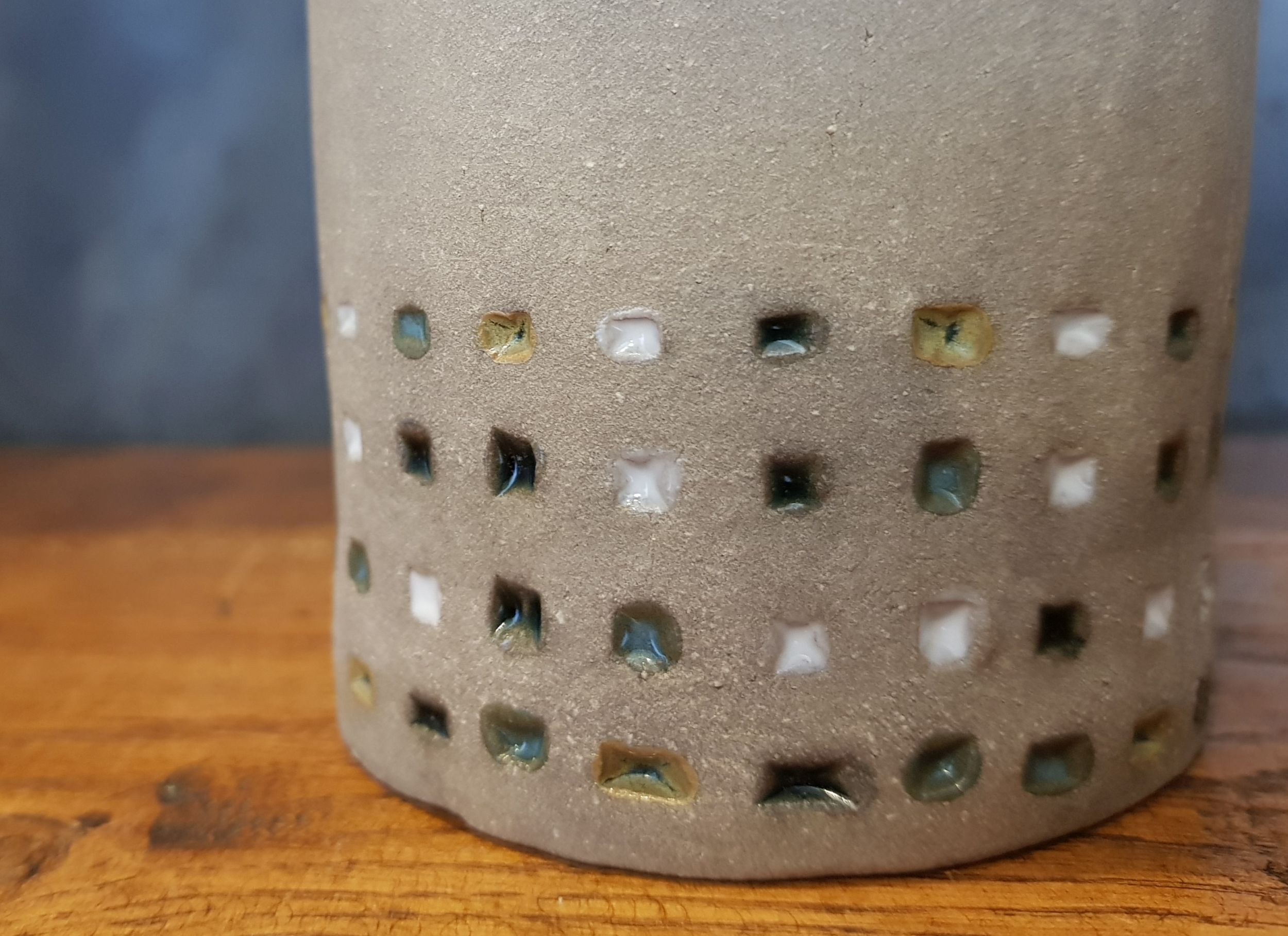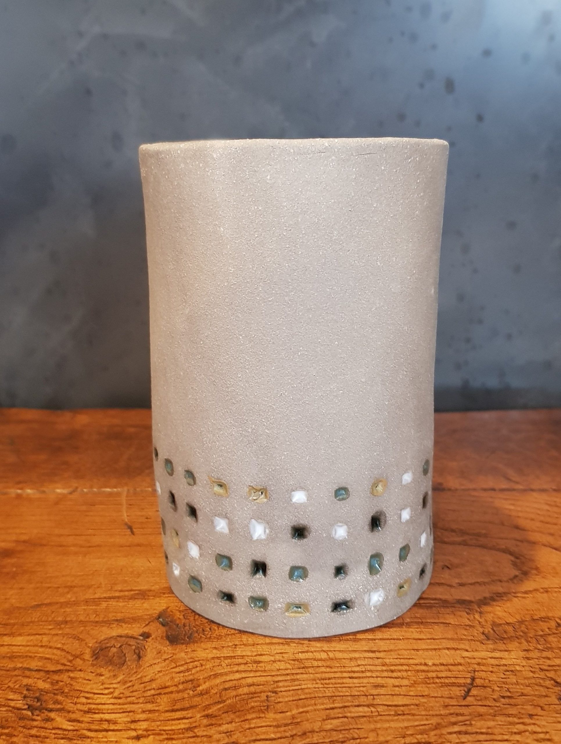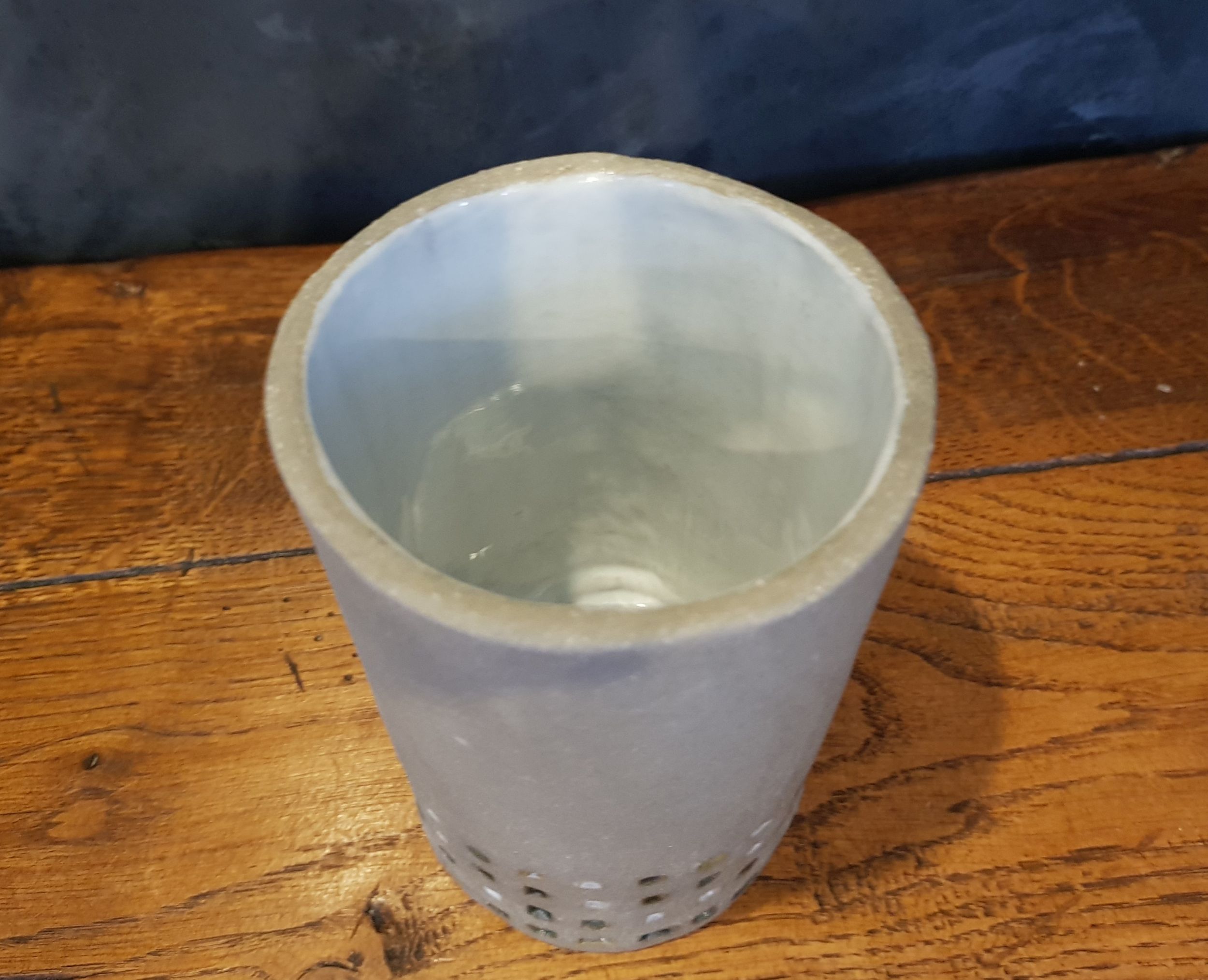 Becher Georg habe ich aus grauem Ton in Plattentechnik hergestellt und mit Prägungen versehen. Nach dem Schrühbrand wurde Georg innen weiß glasiert und die Prägungen außen vierfarbig glasiert. Der Glasurbrand erfolgte bei 1220 Grad, Georg ist daher Steinzeug. Die Glasuren sind selbstverständlich lebensmittelecht und unbedenklich. Georg kann bedenkenlos in die Spülmaschine.