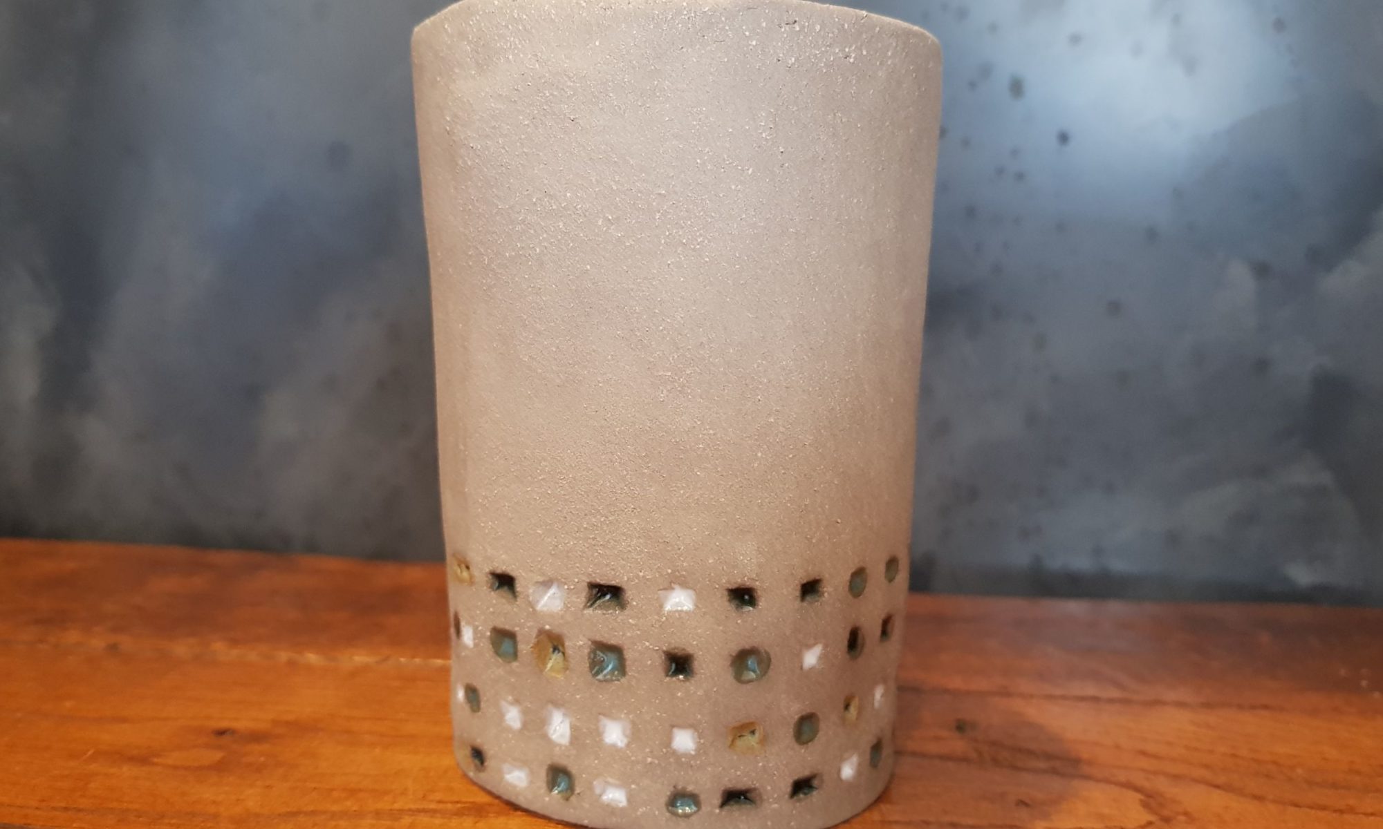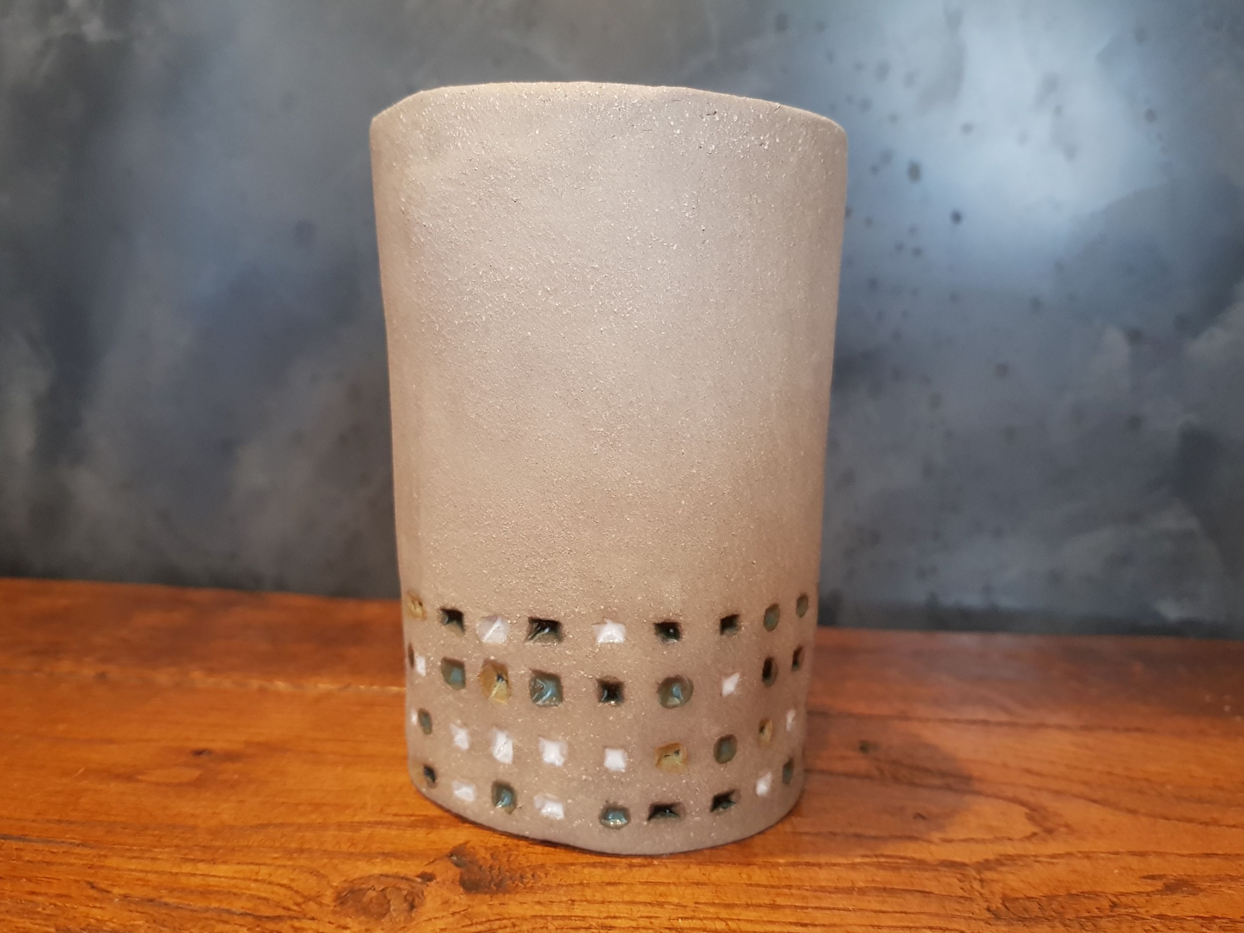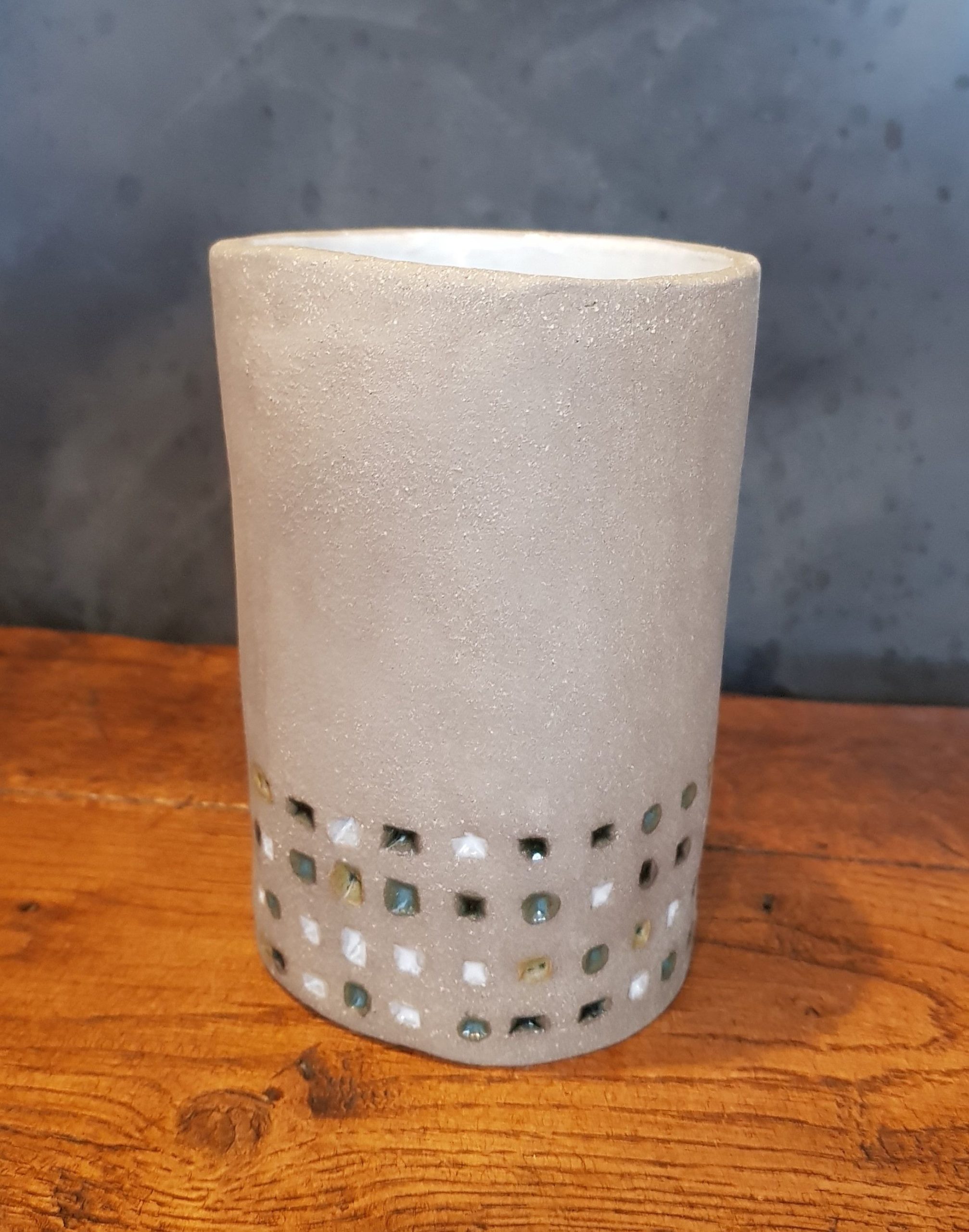 Becher Georg habe ich aus grauem Ton in Plattentechnik hergestellt und mit Prägungen versehen. Nach dem Schrühbrand wurde Georg innen weiß glasiert und die Prägungen außen vierfarbig glasiert. Der Glasurbrand erfolgte bei 1220 Grad, Georg ist daher Steinzeug. Die Glasuren sind selbstverständlich lebensmittelecht und unbedenklich. Georg kann bedenkenlos in die Spülmaschine.