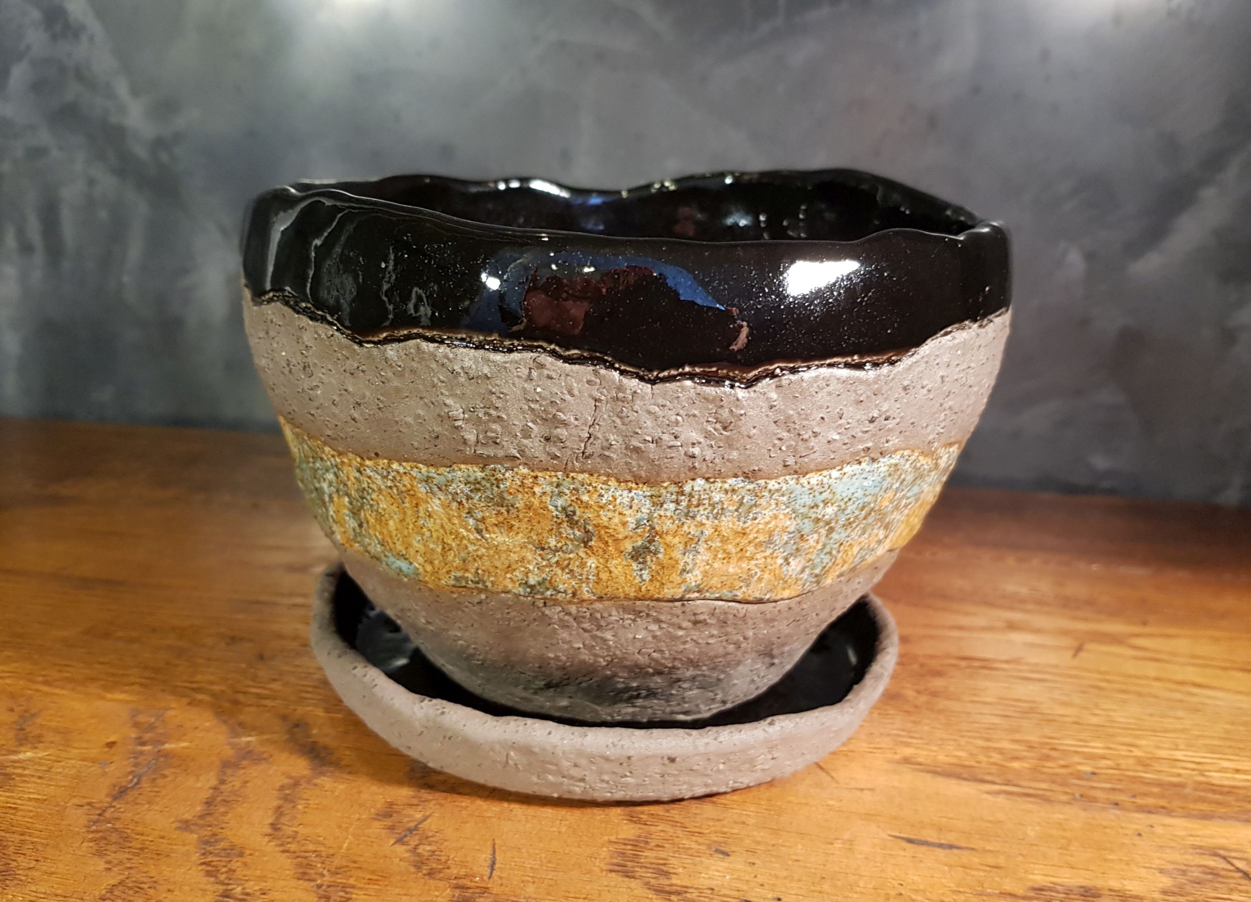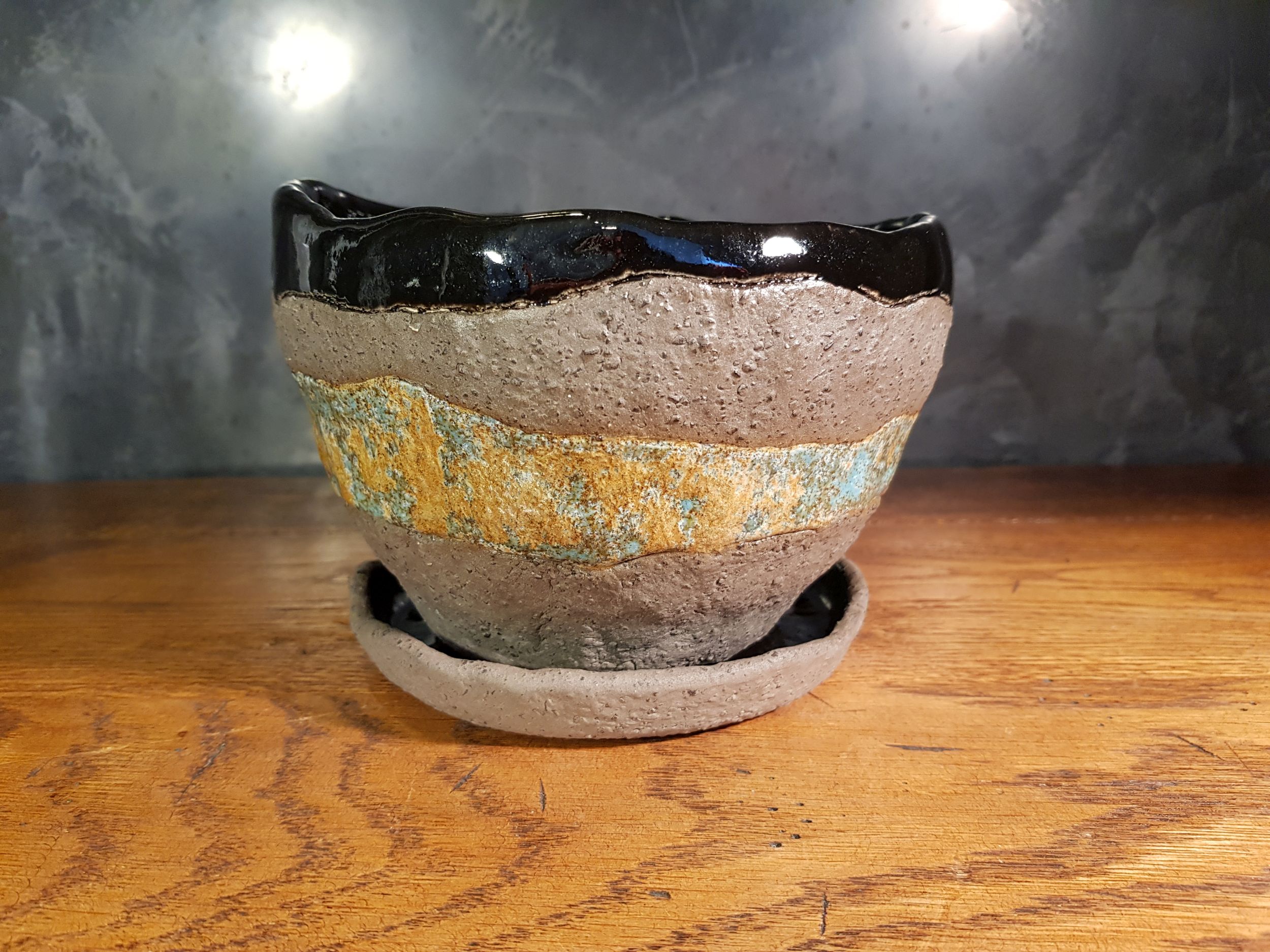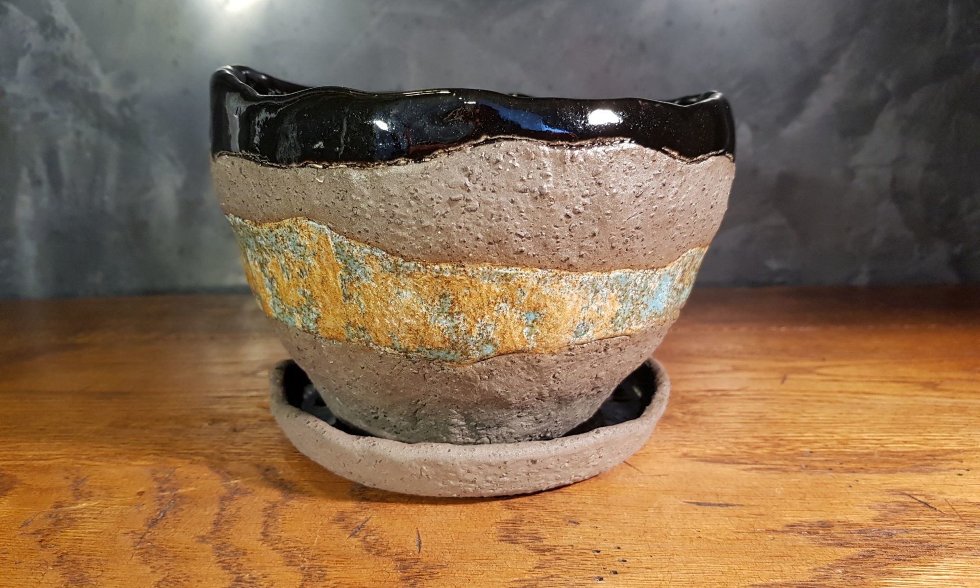 Blumentopf Alois habe ich aus zwei verschiedenen Tonen in Aufbautechnik gefertigt. Dabei wechseln sich weißer glatter Ton und anthrazitfarbener grober Ton ab. Den weißen Ton habe ich mit zwei unterschiedlichen, perfekt zueinander passenden Glasuren gestrichen. Innen habe ich ihn nur zur Hälfte glasiert, da Pflanzen sich in unglasiertem Ton wohler fühlen. Er wurde sehr hoch bei 1220 Grad zu robustem Steinzeug gebrannt. Er dürfte auch in die Spülmaschine. Natürlich gibt’s den passenden Untersetzer dazu.