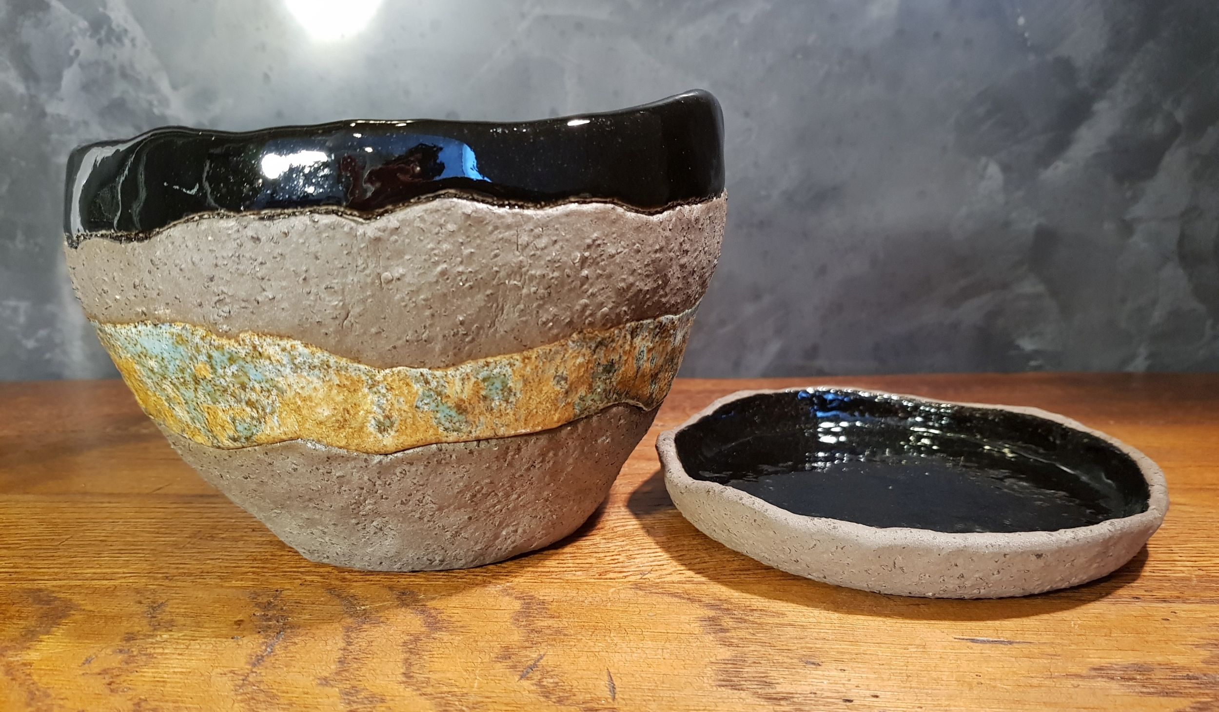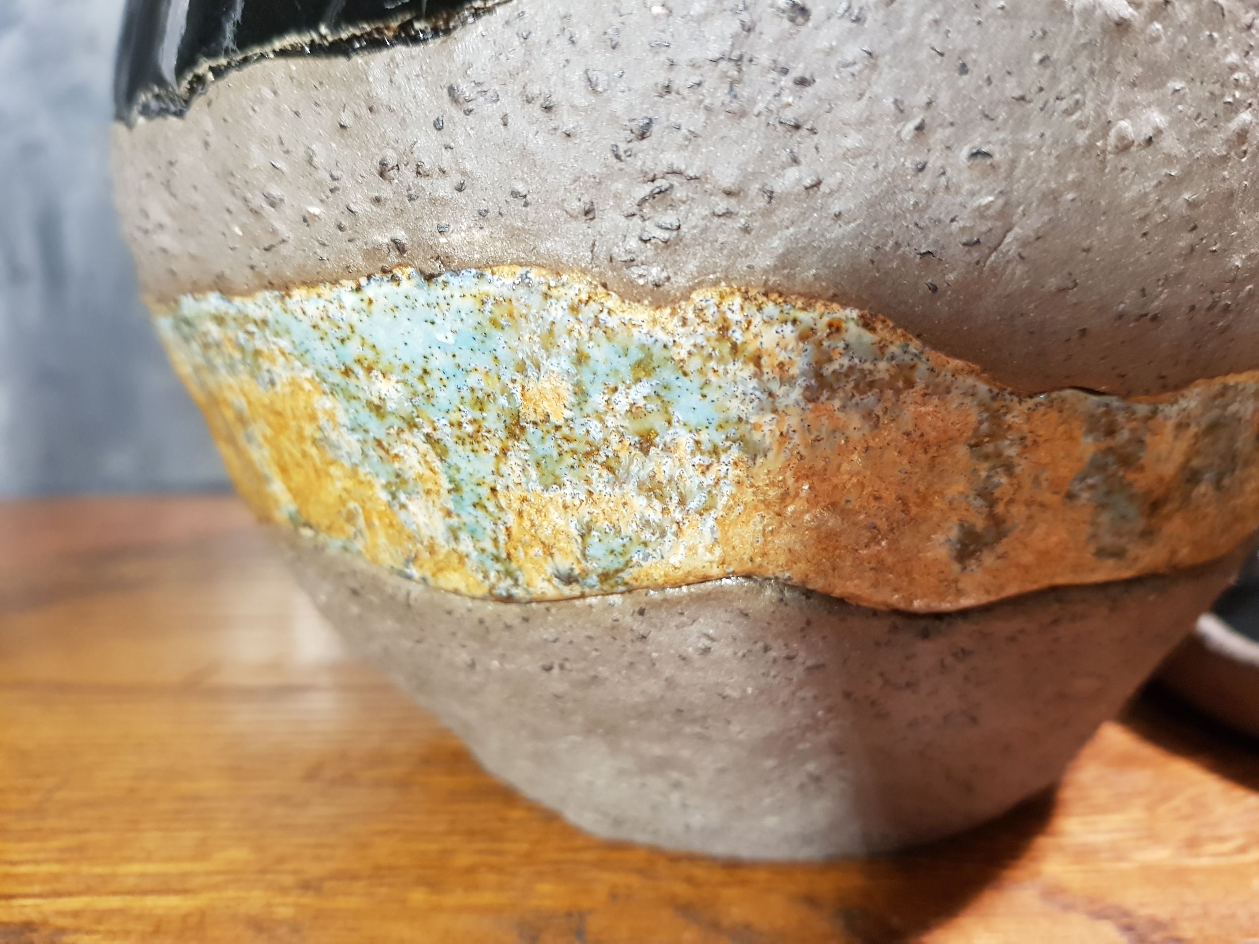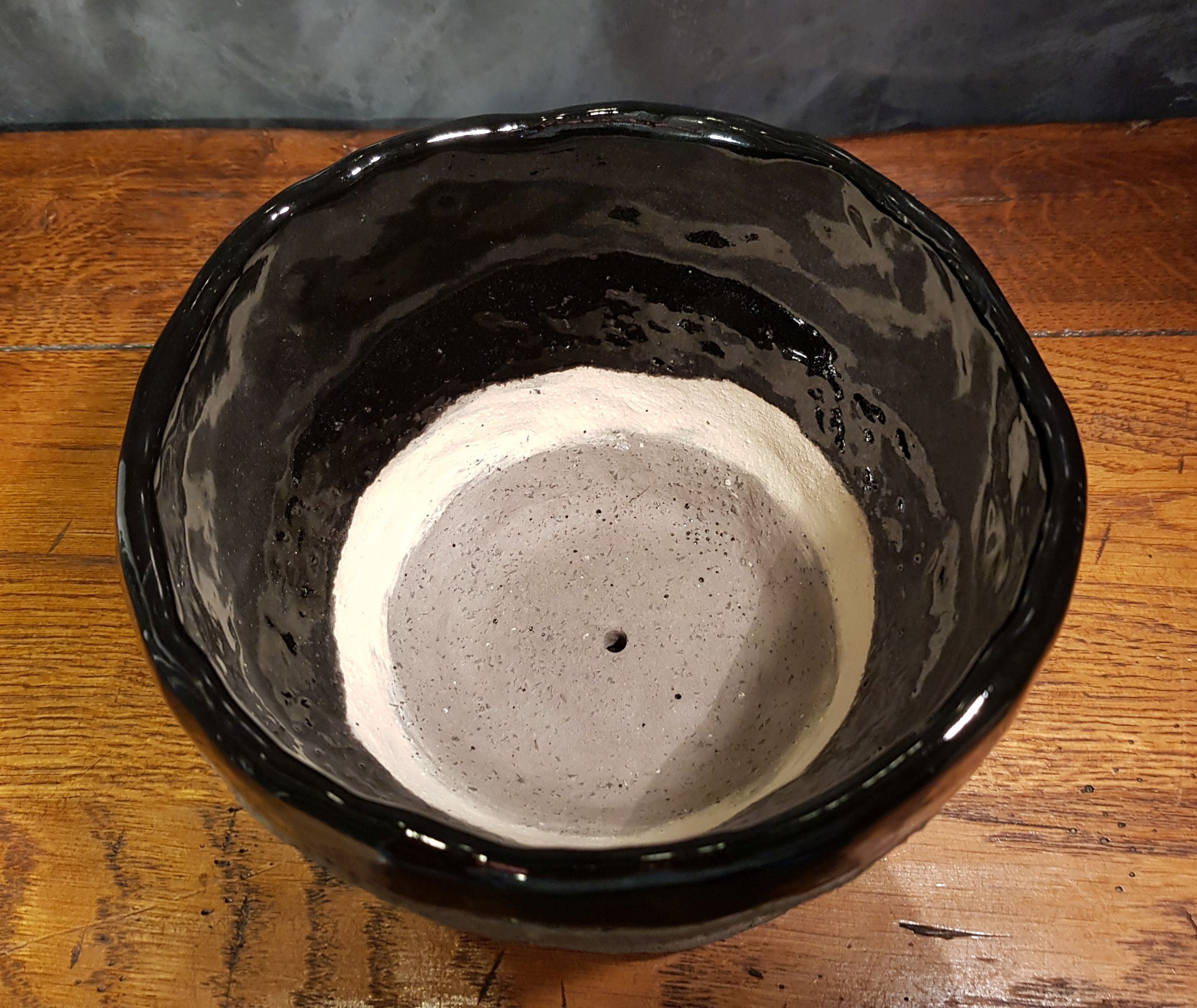 Blumentopf Alois habe ich aus zwei verschiedenen Tonen in Aufbautechnik gefertigt. Dabei wechseln sich weißer glatter Ton und anthrazitfarbener grober Ton ab. Den weißen Ton habe ich mit zwei unterschiedlichen, perfekt zueinander passenden Glasuren gestrichen. Innen habe ich ihn nur zur Hälfte glasiert, da Pflanzen sich in unglasiertem Ton wohler fühlen. Er wurde sehr hoch bei 1220 Grad zu robustem Steinzeug gebrannt. Er dürfte auch in die Spülmaschine. Natürlich gibt’s den passenden Untersetzer dazu.