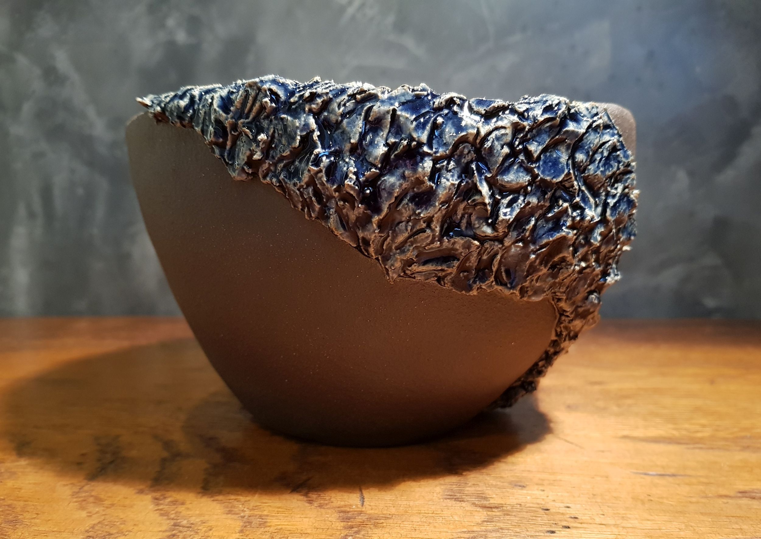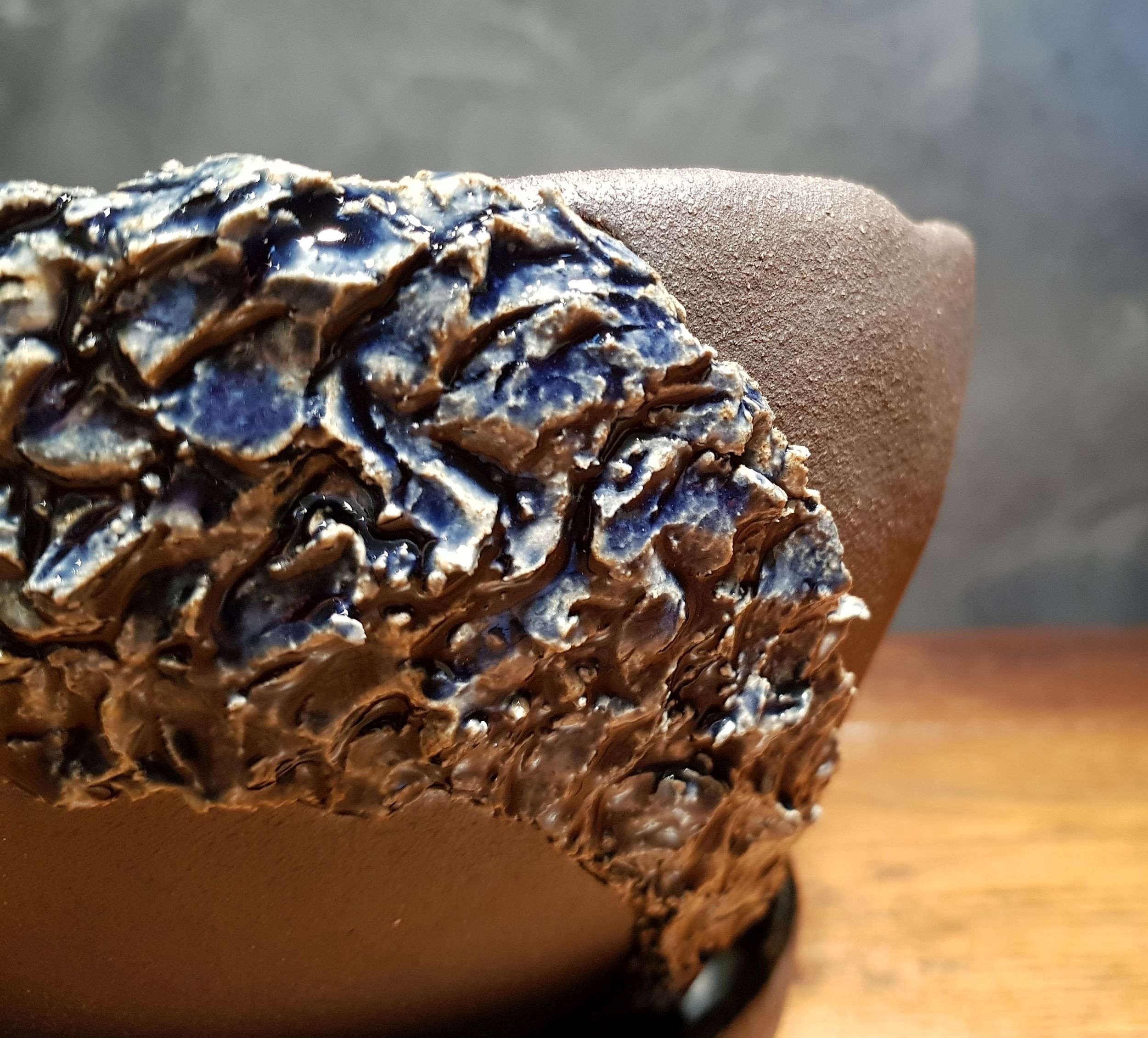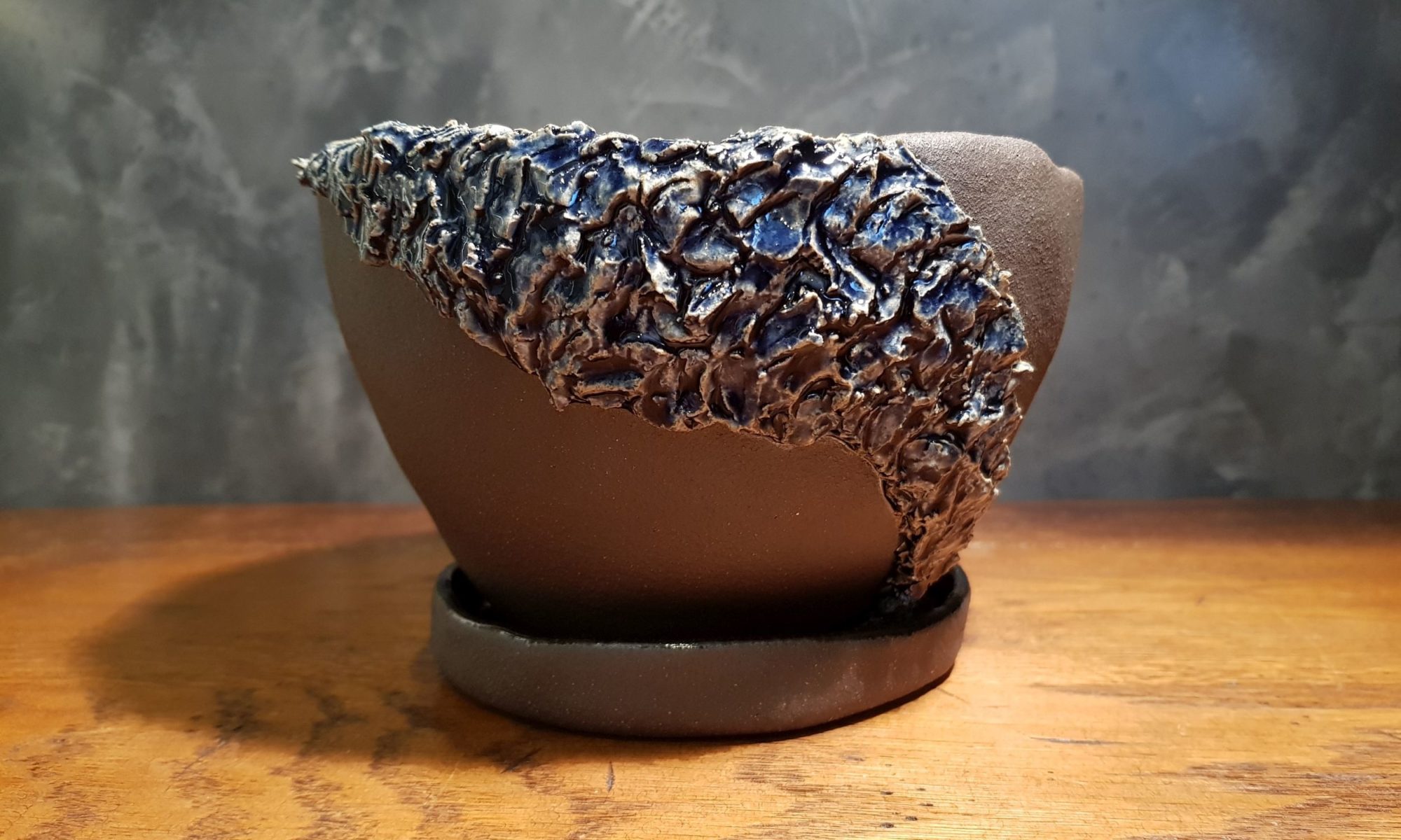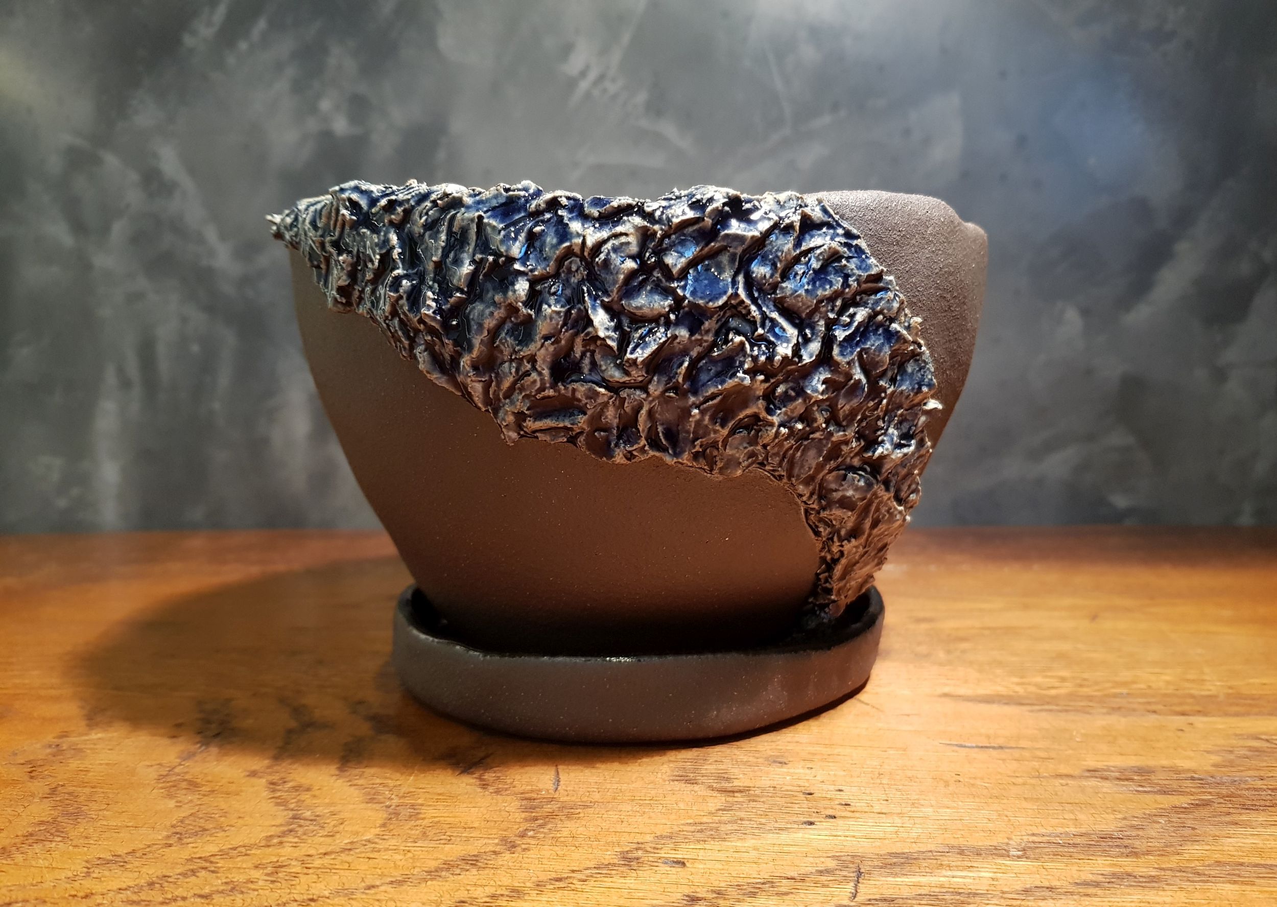 Blumentopf Käthe habe ich aus schwarzem Ton in Aufbautechnik gefertigt. Das Dekor habe ich mit weißem Ton aufgebracht. Dieses wurde nach dem Schrühbrand mit einer Glasurmischung leicht transparent glasiert. Der Untersetzer ist innen auch glasiert, damit er sich besser reinigen lässt.