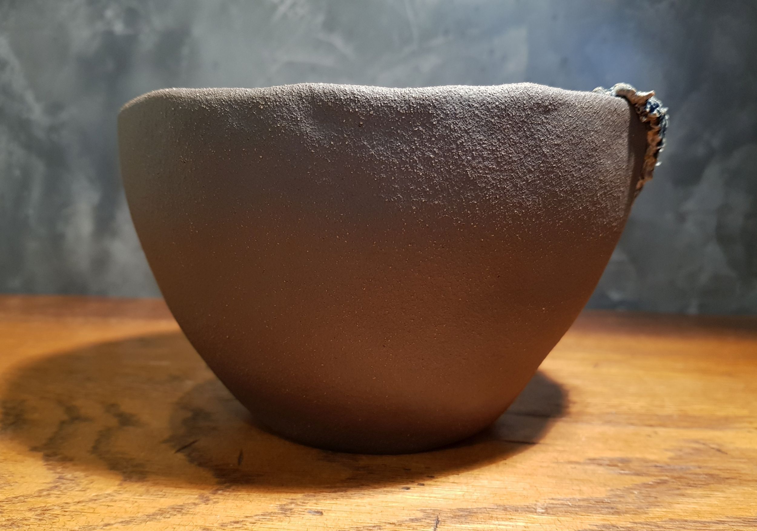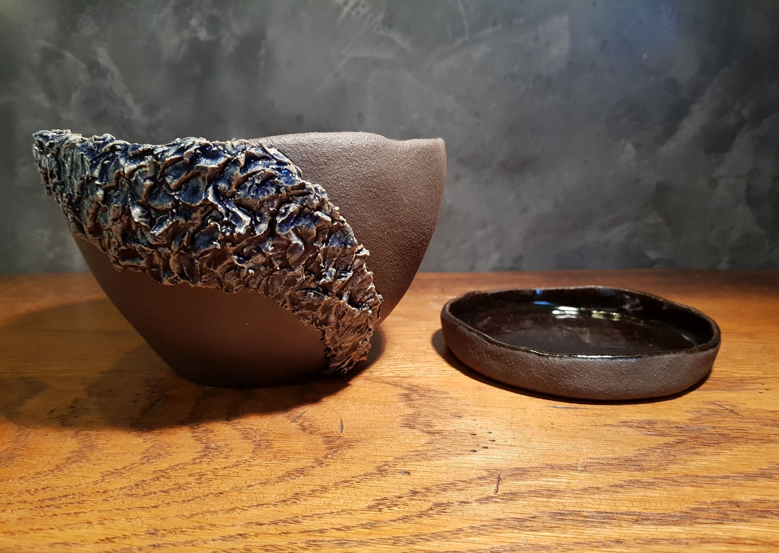 Sie wurde sehr hoch bei 1220 Grad zu robustem Steinzeug gebrannt. Sie dürfte auch in die Spülmaschine. Natürlich gibt’s den passenden Untersetzer dazu.