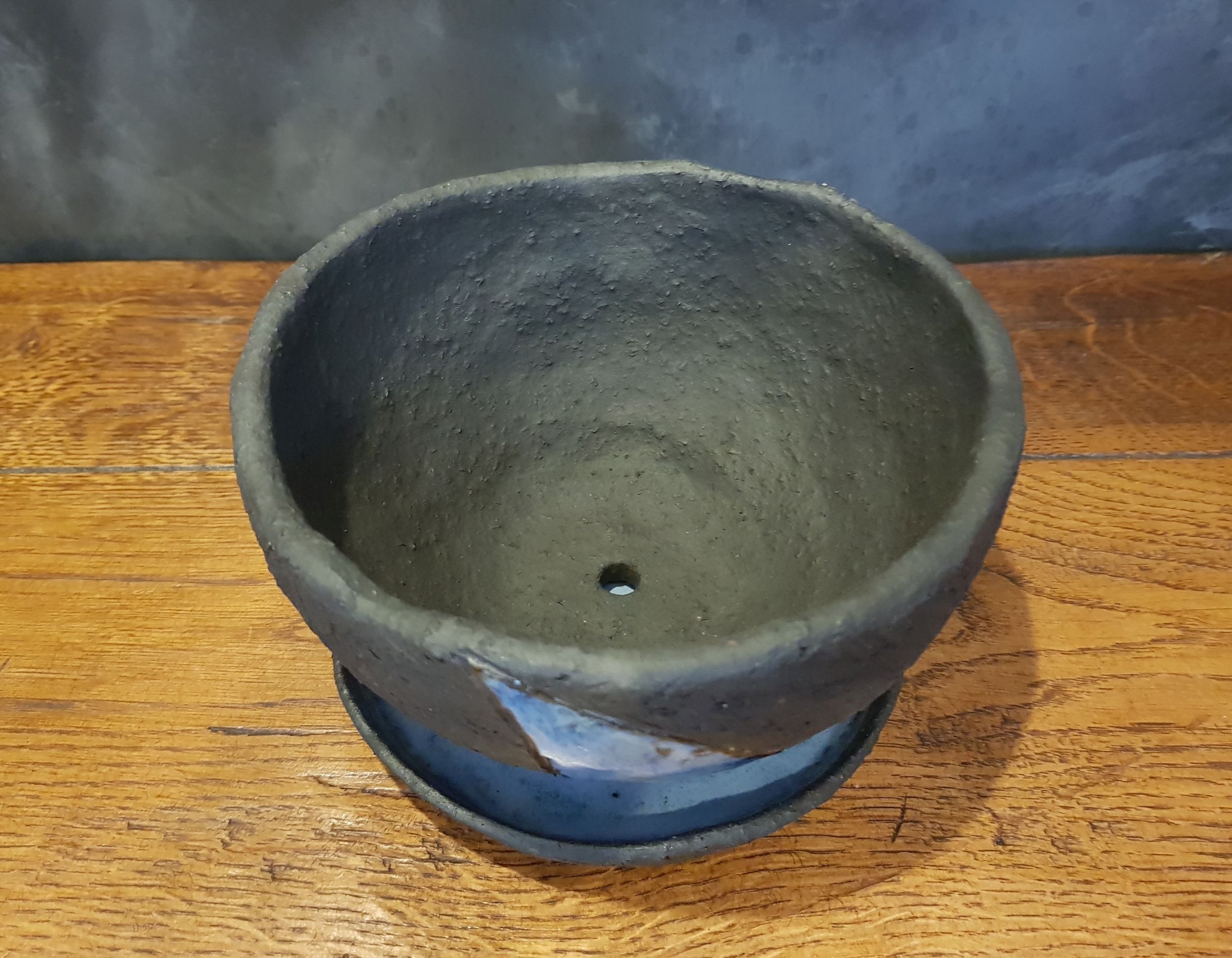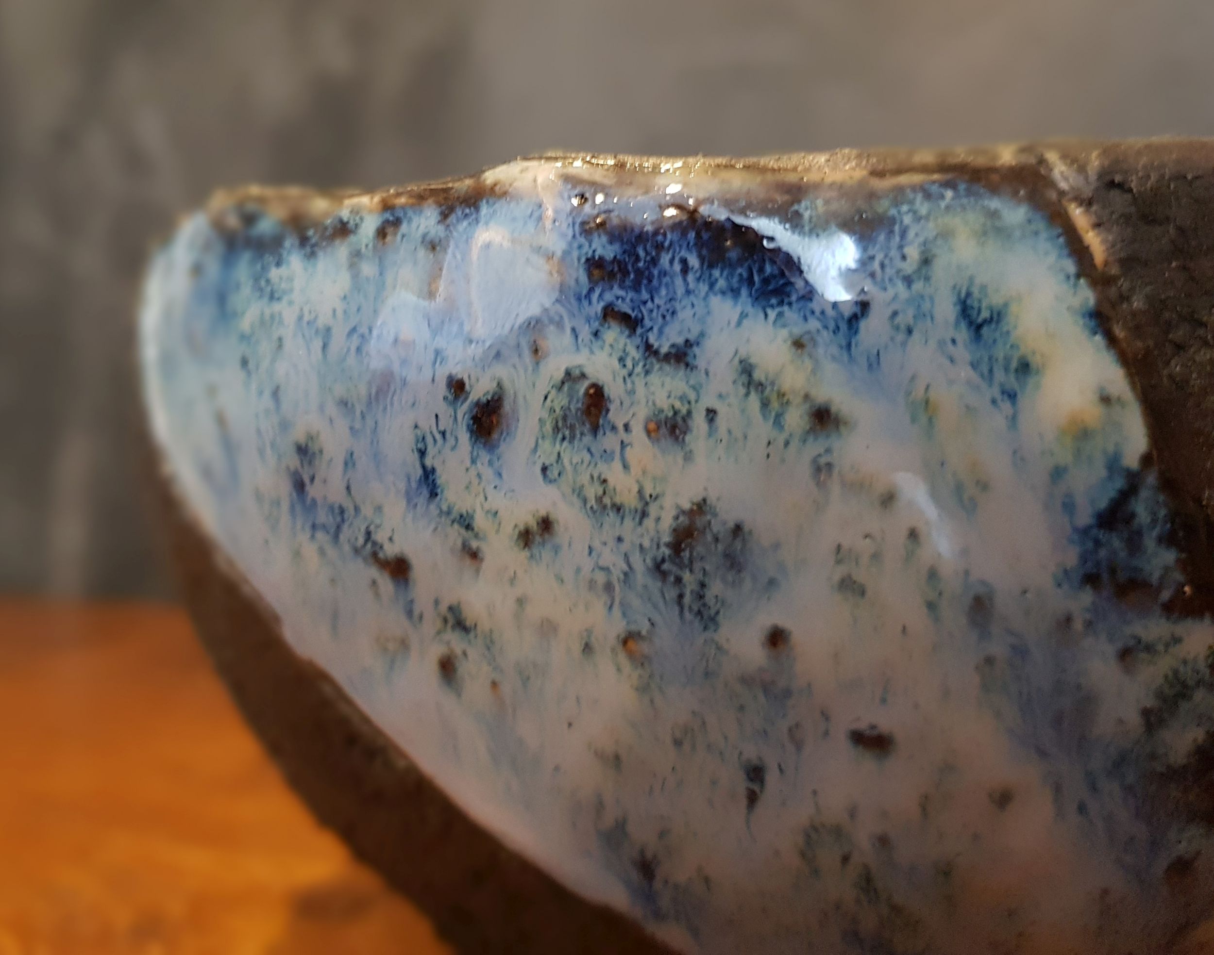 Sigi habe ich aus schwarzem mittelgrob schamottiertem Ton gefertigt. Nach dem ersten Schrühbrand habe ich die für eine Glasur vorgesehenen Stellen mit weißer Engobe bestrichen und einen zweiten Schrühbrand durchgeführt. Das verhindert beim Glasurbrand ein Vermischen des schwarzen Tons mit der Glasur. Als Glasur wählte ich eine Mischung aus verschiedenen Glasuren, die einen sehr interessanten Effekt erzeugen. Der Glasurbrand (dritter Brand) erfolgte bei 1220 Grad, so dass Steinzeug erzeugt wurde. Durch die sehr hohe Temperatur bekommt dieser Ton einen leichten Schimmer. Sigi darf in die Spülmaschine, wenn nötig.