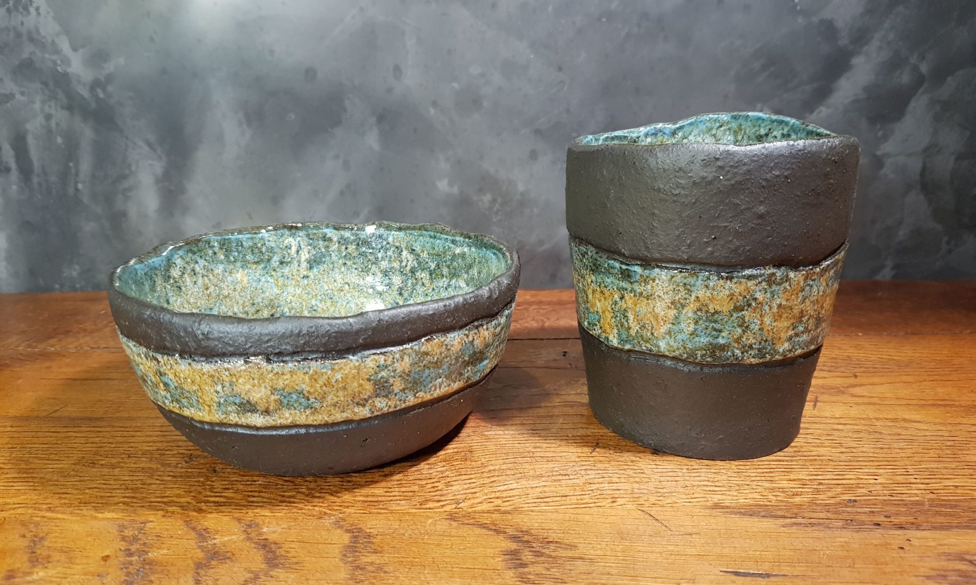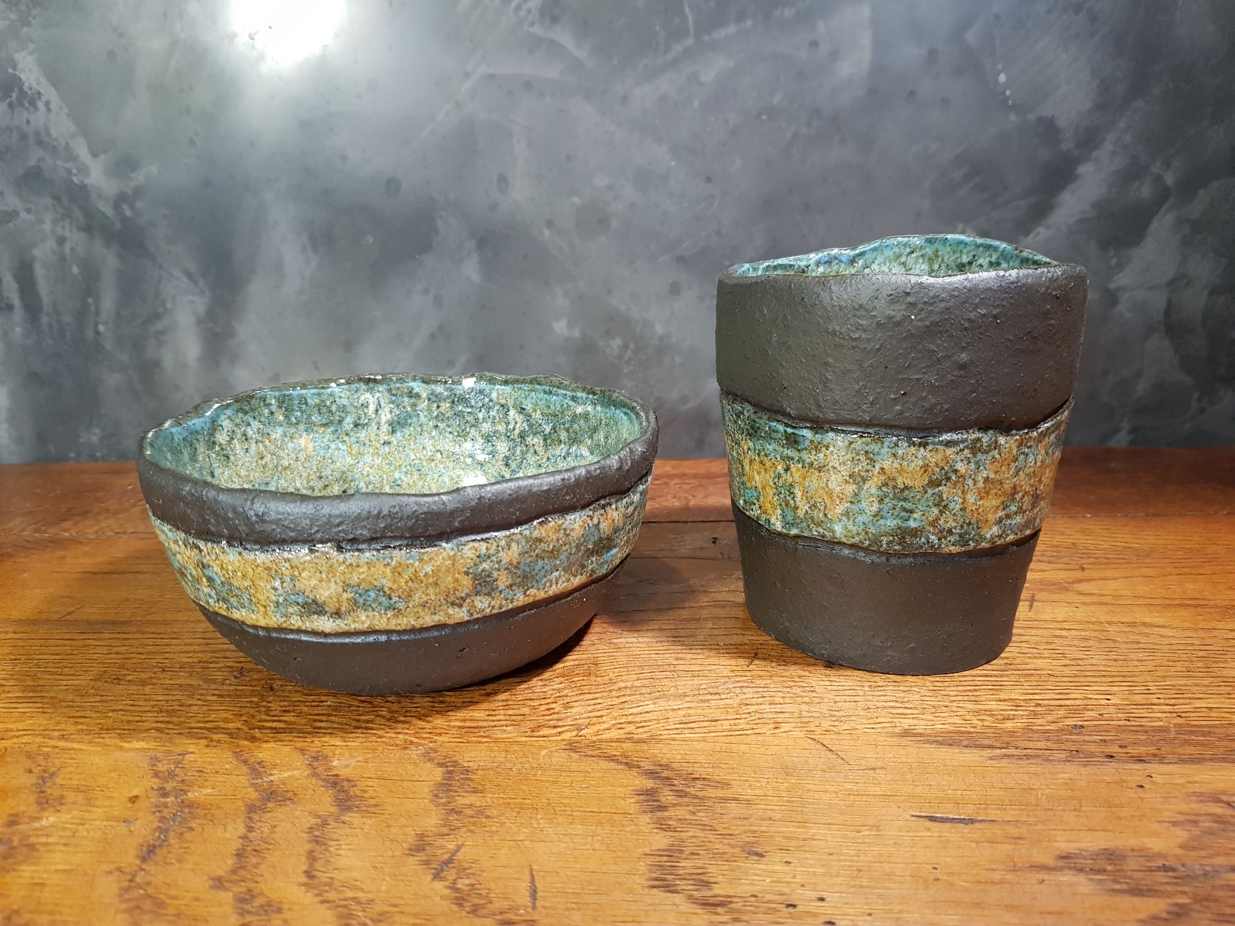 Gedeck Anderl und Burga habe ich aus schwarzem Ton in Aufbautechnik gefertigt. Die grobe Schamottierung habe ich geglättet, dass eine angenehme Haptik und eine seidenmatte Oberfläche entstand. Innen und einen Streifen außen habe ich vor dem Schrühbrand weiß engobiert, damit die Glasur in ihrer vollen Pracht zur Geltung kommt. Anderl und Burga wurden bei 1240 Grad zu Steinzeug gebrannt. Sie sind spülmaschinenfest und lebensmittelecht, auch ofenfest.