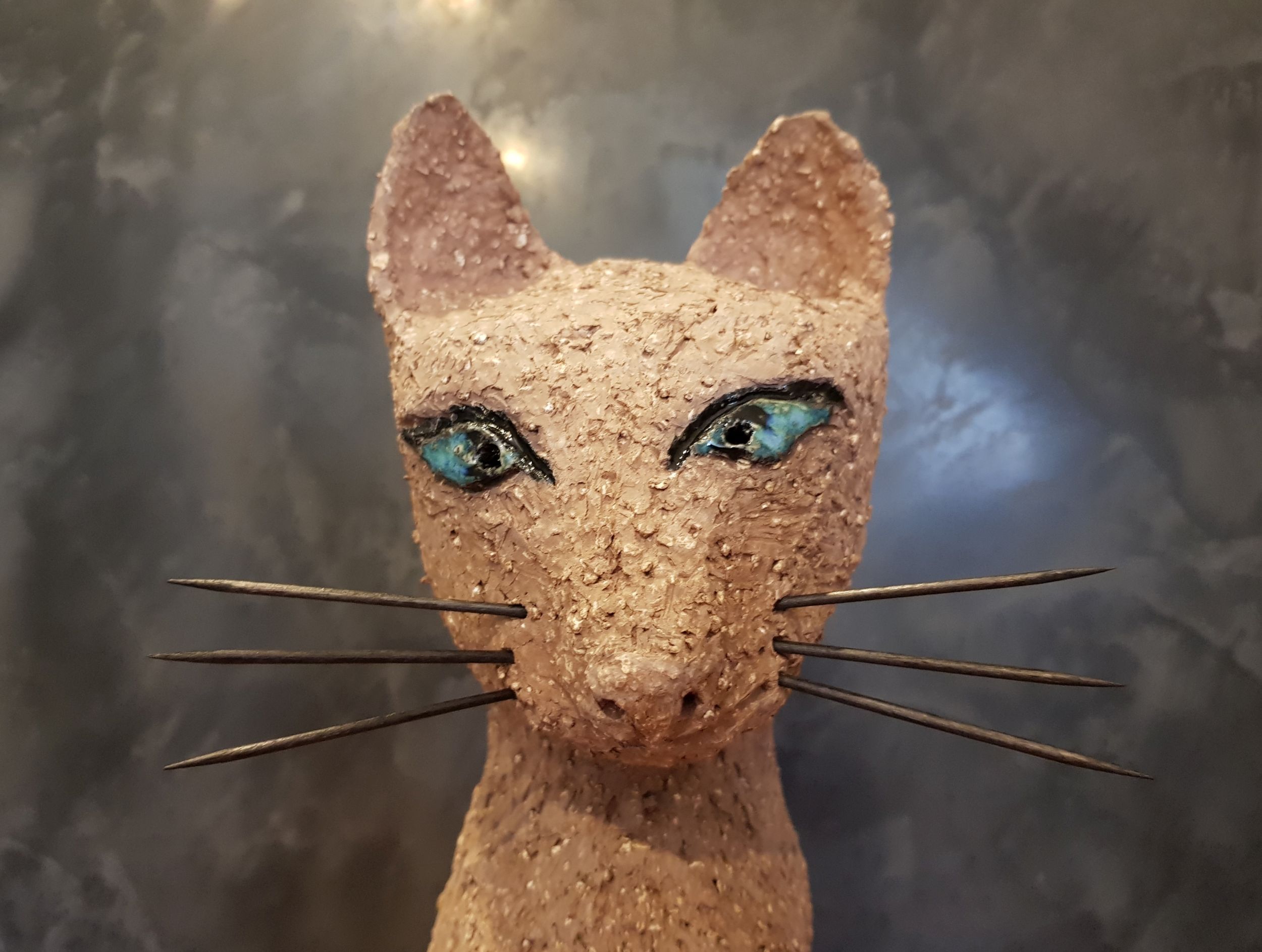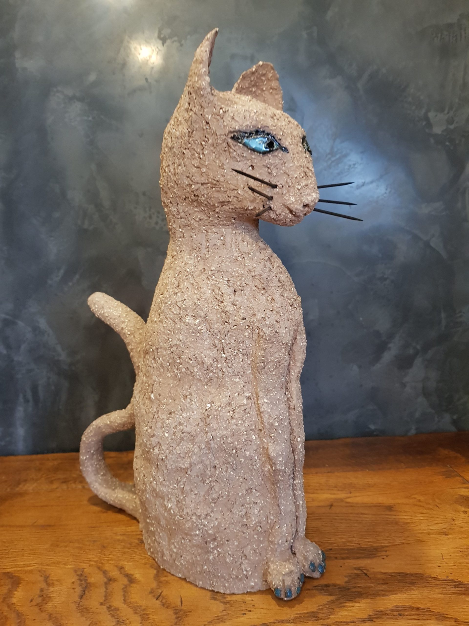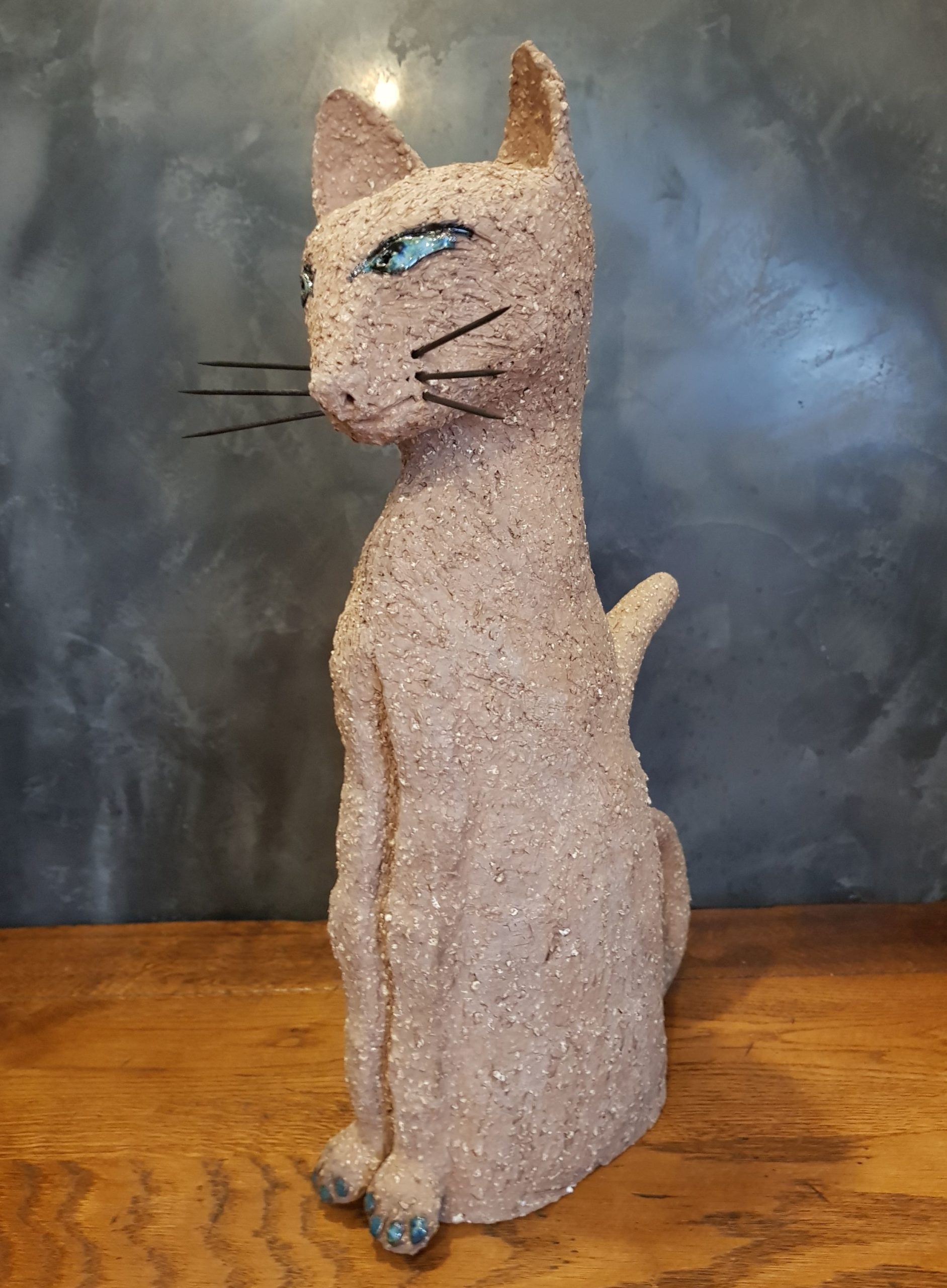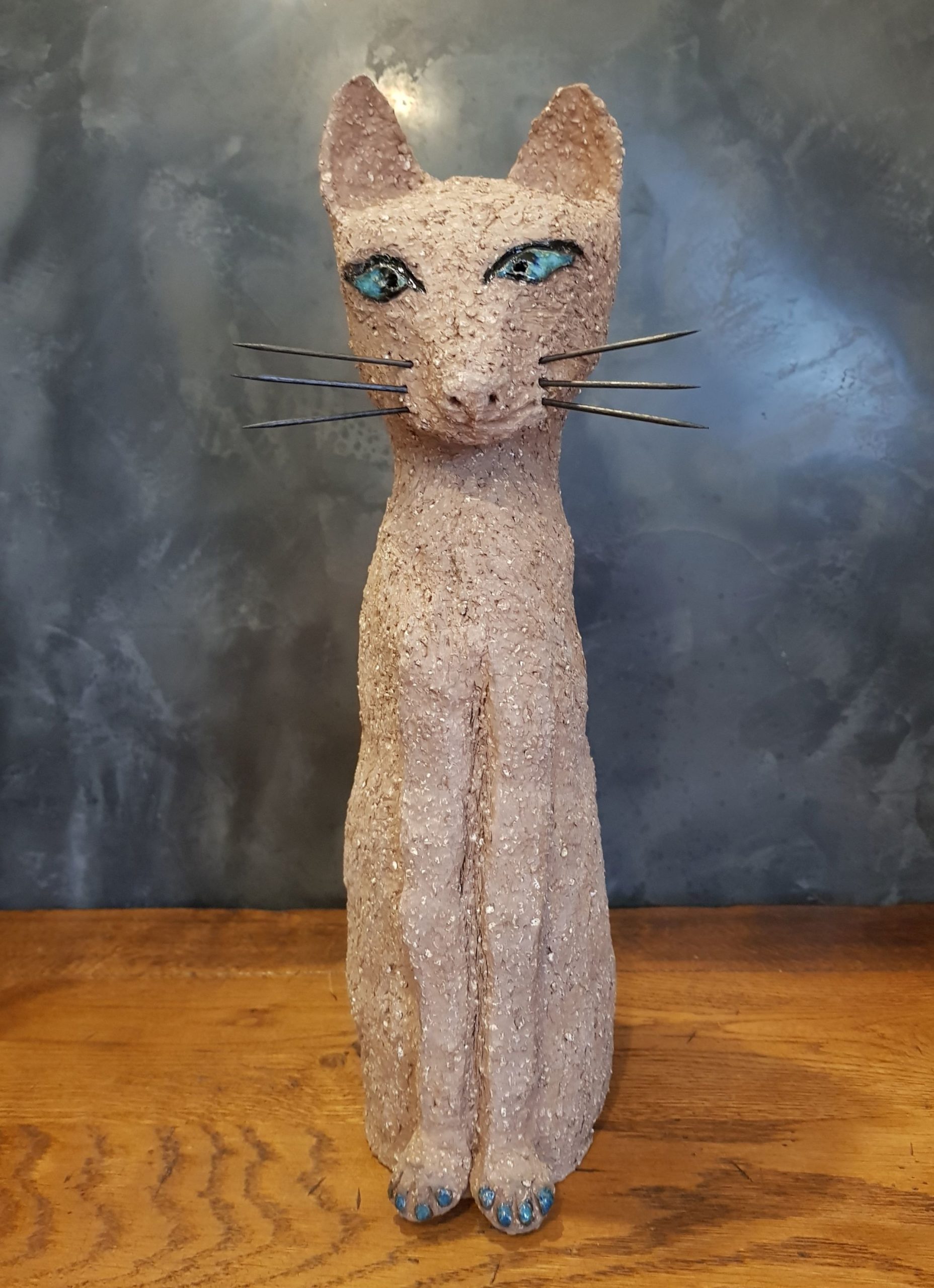 Die Katze Cäcilie habe ich aus sehr grob schamottiertem, terrakottafarbenen Ton gefertigt. Ihre Augen sind mehrlagig in verschiedenen Blautönen glasiert, ebenso ihre „Zehennägel“. Sie wurde sehr hoch bei 1240 Grad zu Steinzeug gebrannt. Die Schnurrhaare sind aus schwarzgestrichenem Holz (Zahnstocher).