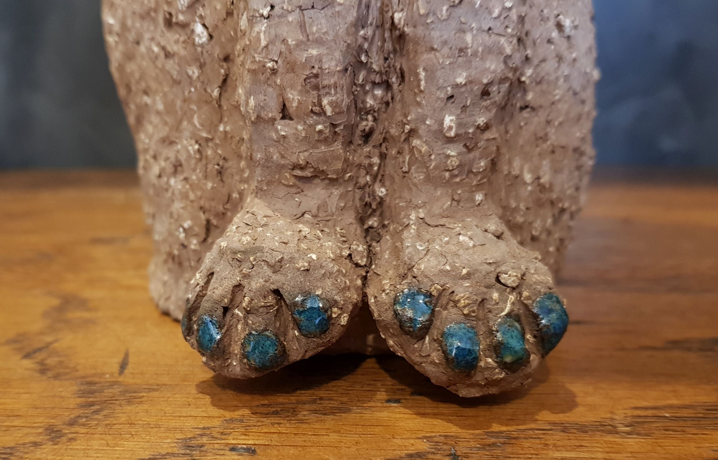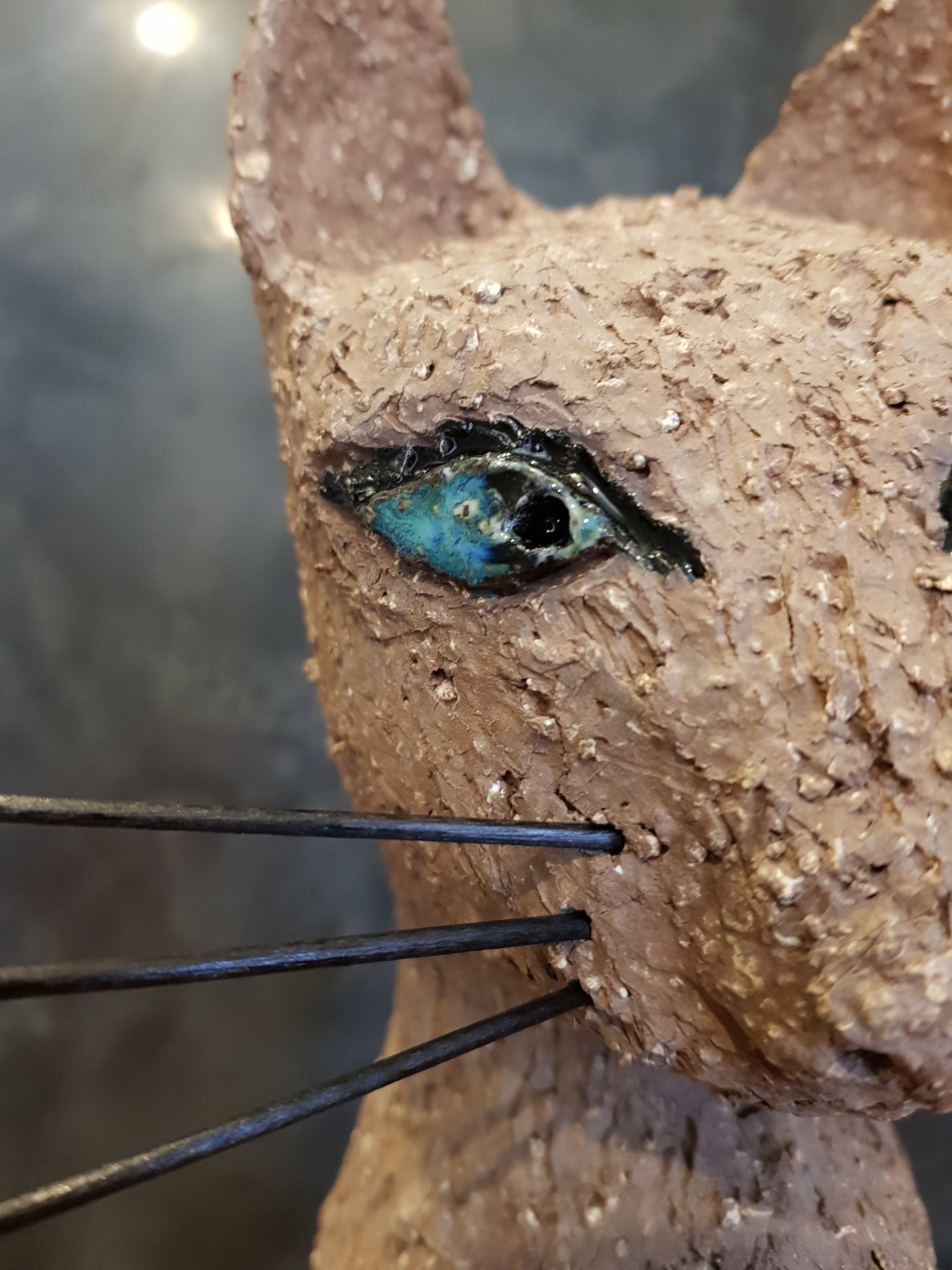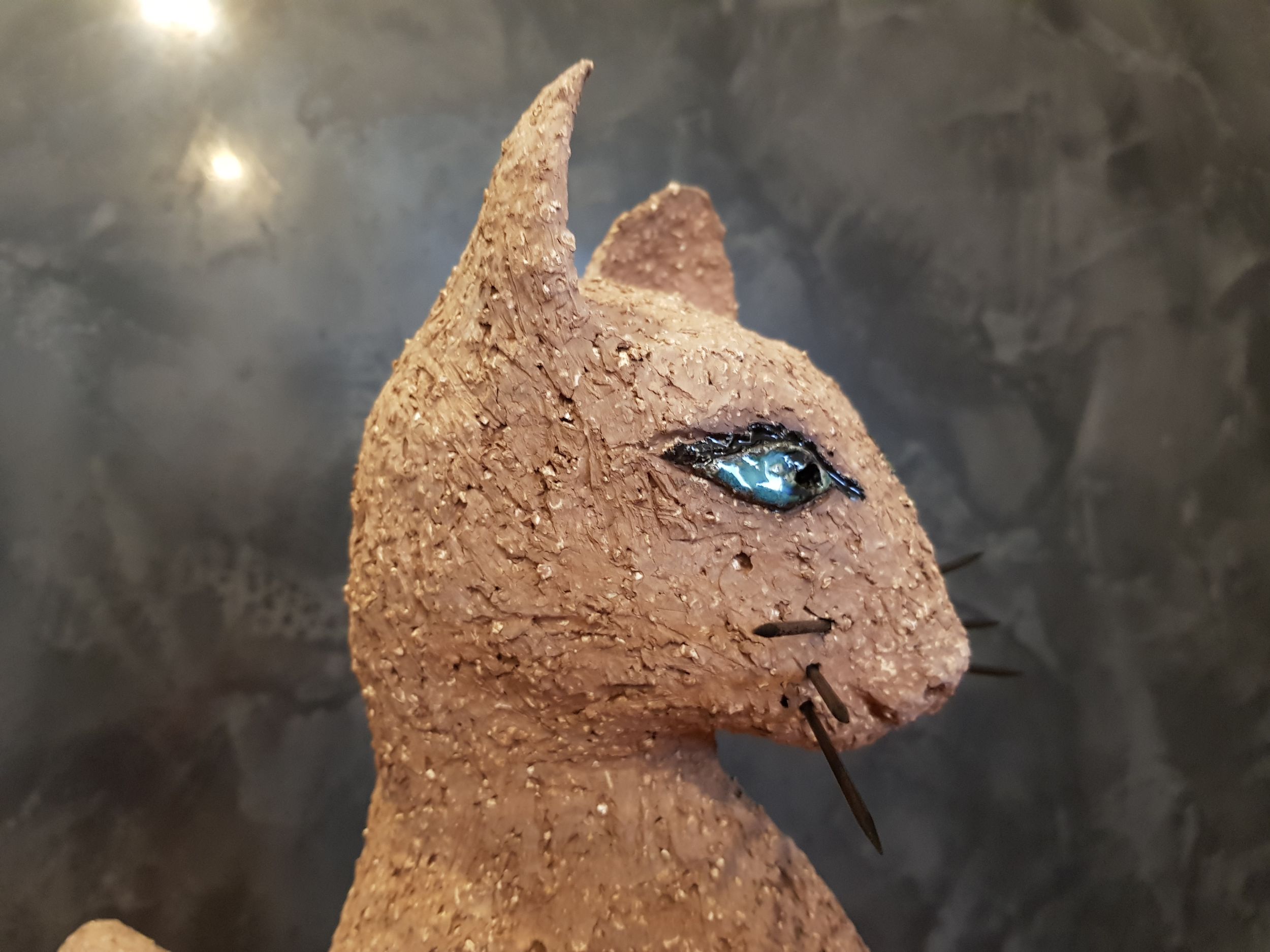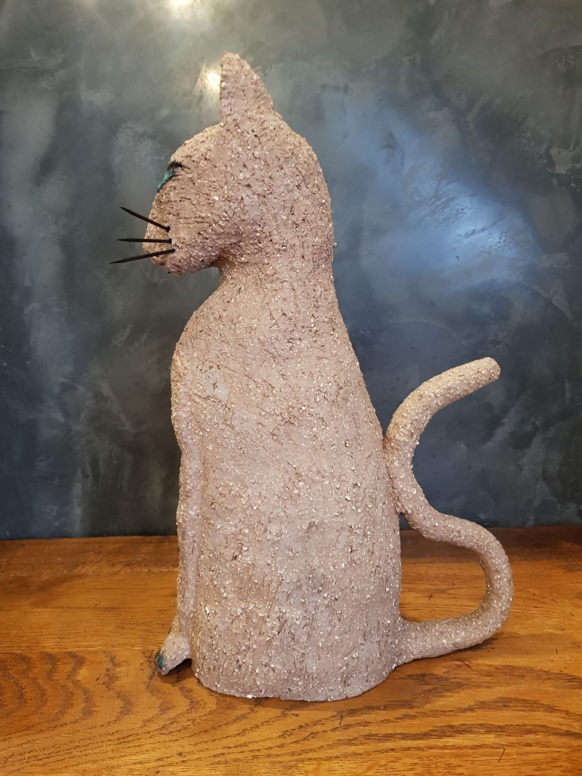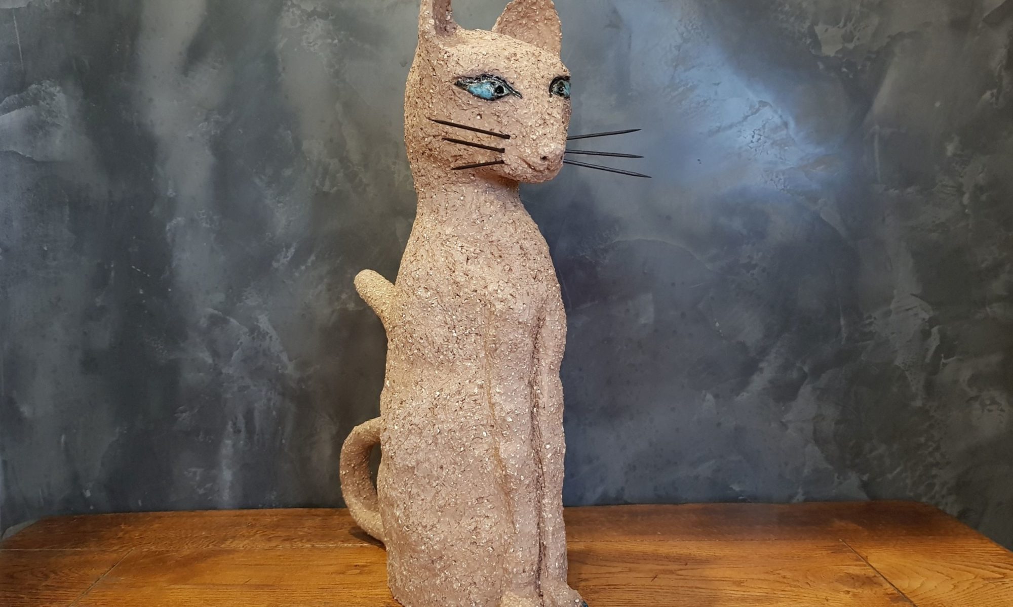 Die Katze Cäcilie habe ich aus sehr grob schamottiertem, terrakottafarbenen Ton gefertigt. Ihre Augen sind mehrlagig in verschiedenen Blautönen glasiert, ebenso ihre „Zehennägel“. Sie wurde sehr hoch bei 1240 Grad zu Steinzeug gebrannt. Die Schnurrhaare sind aus schwarzgestrichenem Holz (Zahnstocher).