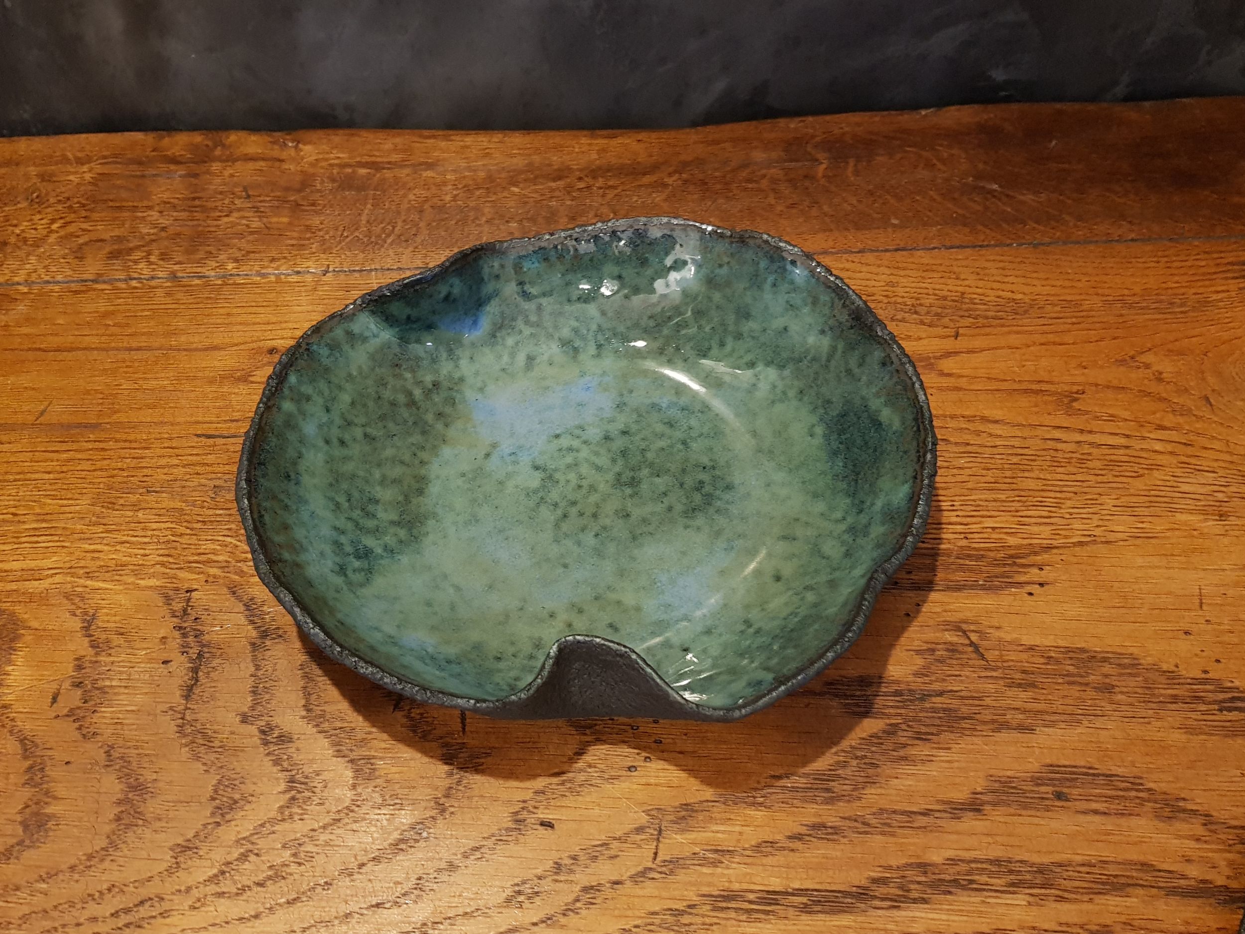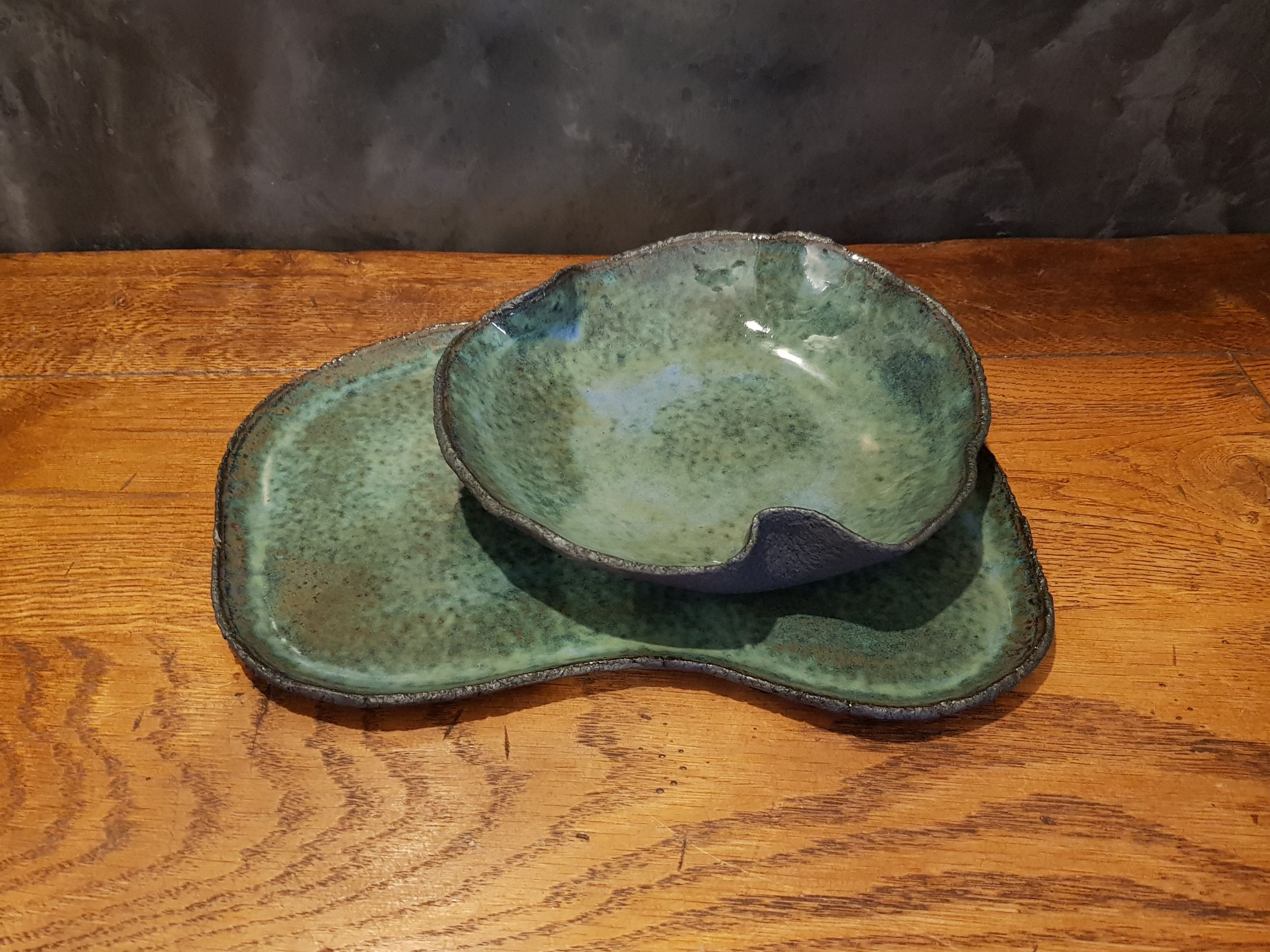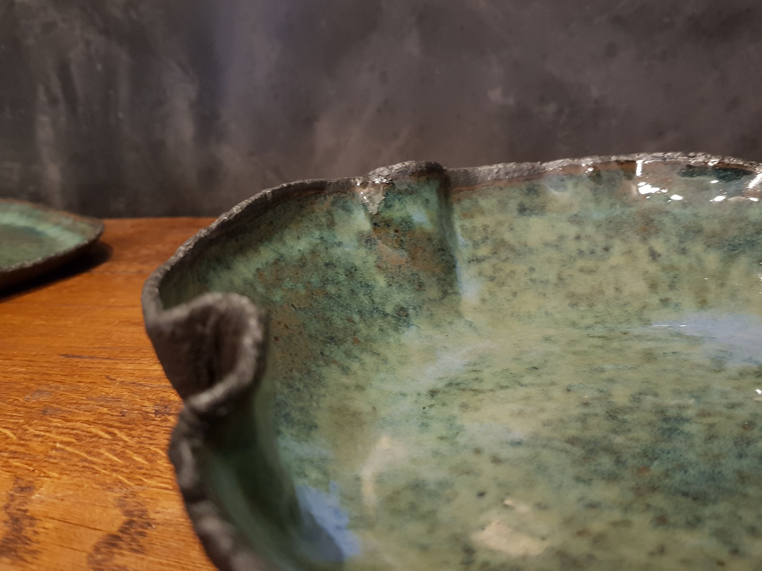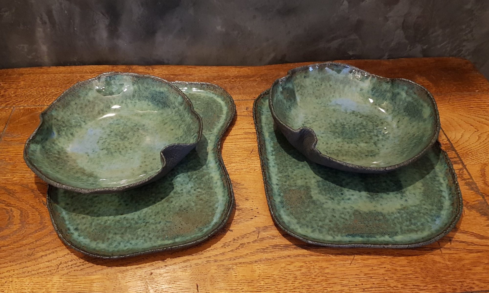Terra Nera (schwarze Erde) steht für eine aufwändige neue Keramiklinie aus schwarzem grobem Ton, glasiert mit verschiedenen Blau- und Grüntönen. Das Set besteht aus zwei Suppenschalen und zwei flachen Tellern. Terra Nera habe ich mit einer von mir kreierten Technik geformt und mit einer Struktur versehen. Nach dem ersten Brand (Schrühbrand) werden die Teller innen mit einer weißen Tonschicht überzogen und erhalten einen zweiten Brand. Hierdurch wird sichergestellt, dass sich die Farbe des schwarzen Tons bei den hohen Temperaturen nicht mit der Glasur vermischt. Danach werden diverse Glasurschichten innen aufgetragen und im dritten Brand zu Steinzeug (und zum Leuchten und Glänzen) gebracht.