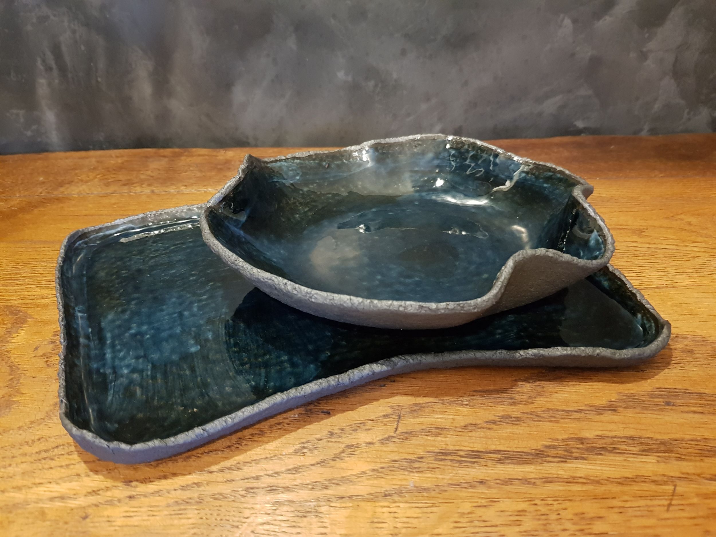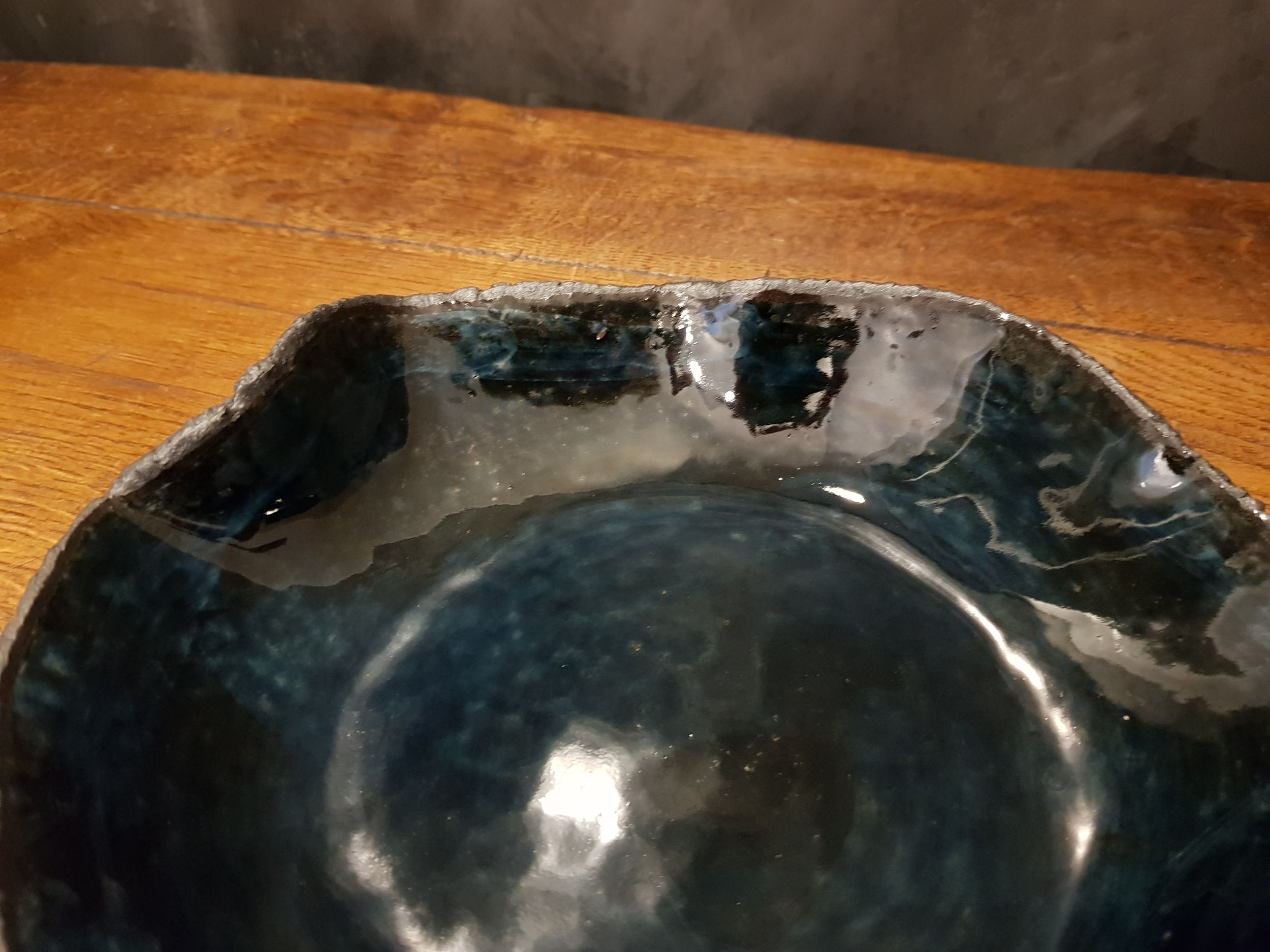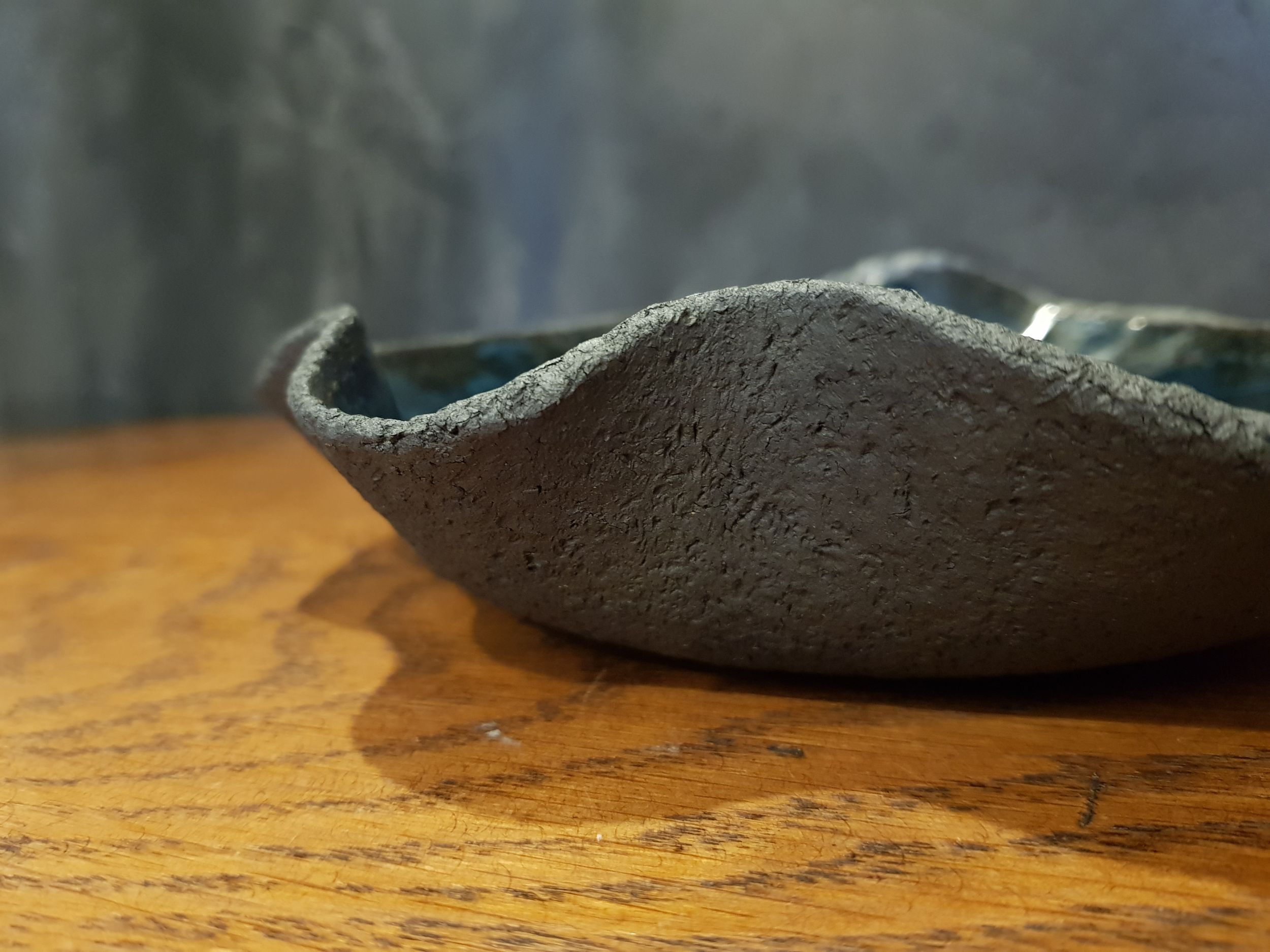 Terra Nera (schwarze Erde) steht für eine aufwändige neue Keramiklinie aus schwarzem grobem Ton, glasiert mit verschiedenen Blau- und Grüntönen. Das Set besteht aus einer Suppenschale und einem flachen Teller. Terra Nera habe ich mit einer von mir kreierten Technik geformt und auf einer Seite mit einer Struktur versehen. Nach dem ersten Brand (Schrühbrand) werden die Teller innen mit einer weißen Tonschicht überzogen und erhalten einen zweiten Brand. Hierdurch wird sichergestellt, dass sich die Farbe des schwarzen Tons bei den hohen Temperaturen nicht mit der Glasur vermischt. Danach werden diverse Glasurschichten innen aufgetragen und im dritten Brand zu Steinzeug (und zum Leuchten und Glänzen) gebracht.
