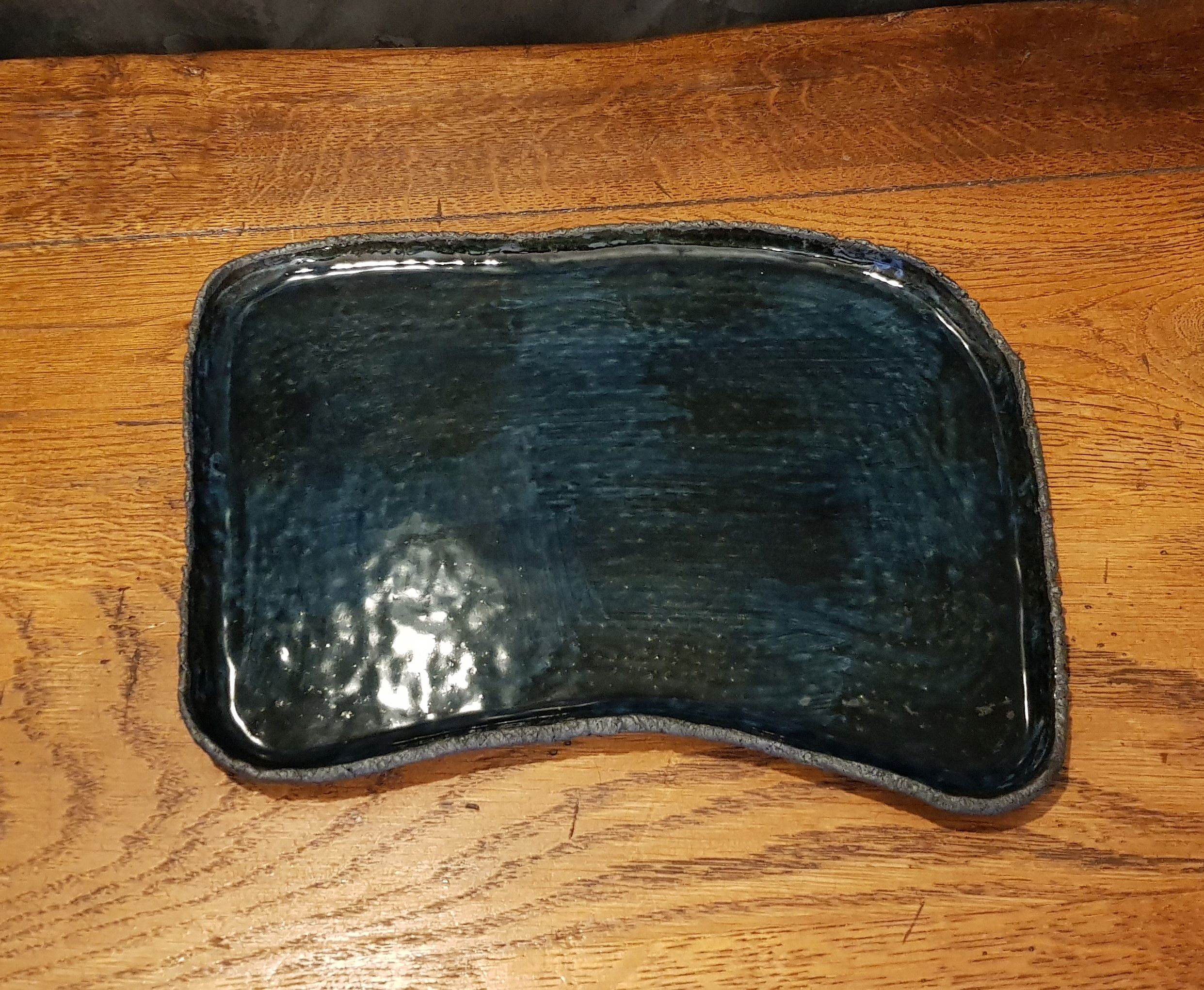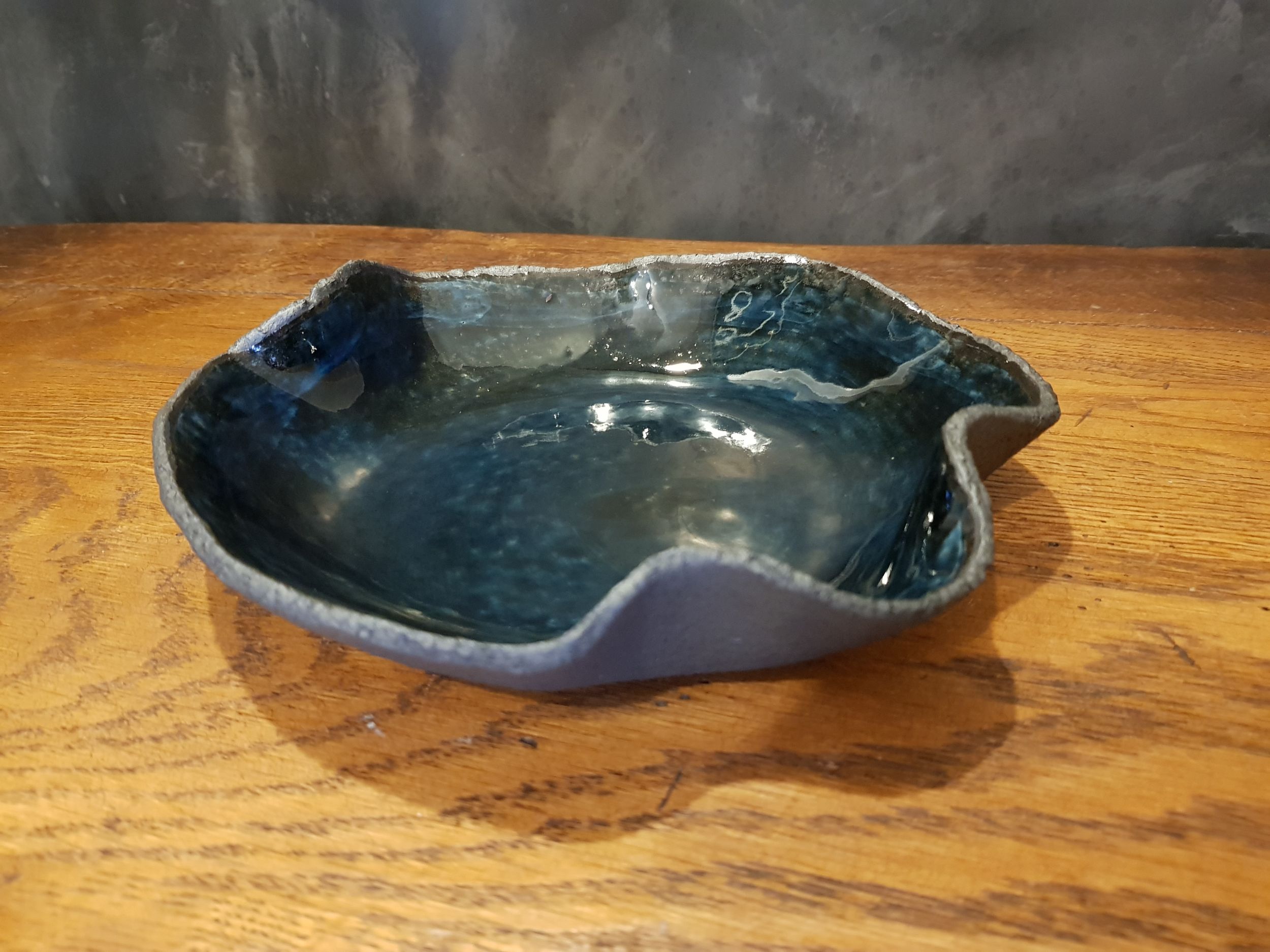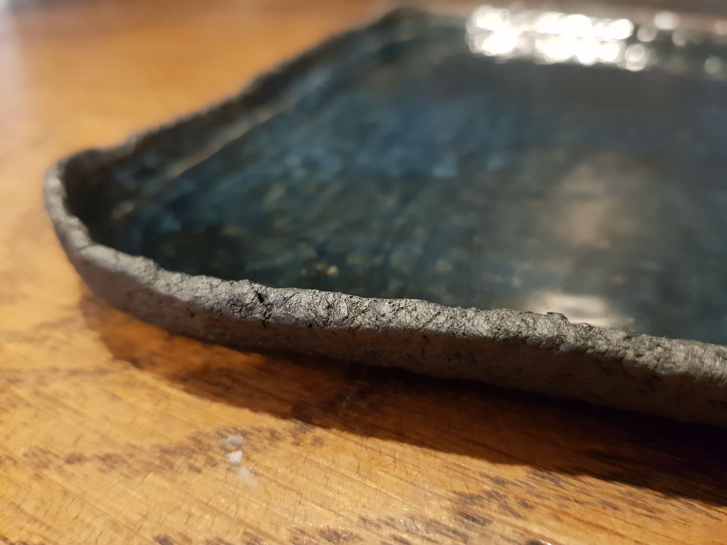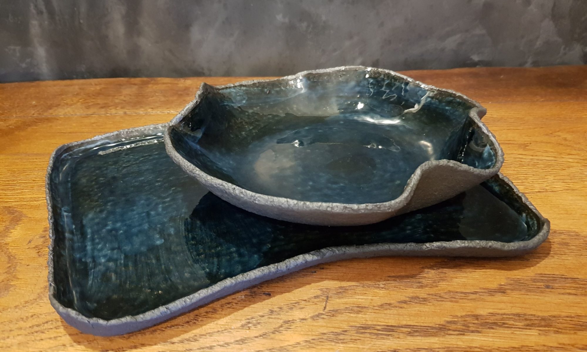 Terra Nera (schwarze Erde) steht für eine aufwändige neue Keramiklinie aus schwarzem grobem Ton, glasiert mit verschiedenen Blau- und Grüntönen. Das Set besteht aus einer Suppenschale und einem flachen Teller. Terra Nera habe ich mit einer von mir kreierten Technik geformt und auf einer Seite mit einer Struktur versehen. Nach dem ersten Brand (Schrühbrand) werden die Teller innen mit einer weißen Tonschicht überzogen und erhalten einen zweiten Brand. Hierdurch wird sichergestellt, dass sich die Farbe des schwarzen Tons bei den hohen Temperaturen nicht mit der Glasur vermischt. Danach werden diverse Glasurschichten innen aufgetragen und im dritten Brand zu Steinzeug (und zum Leuchten und Glänzen) gebracht.