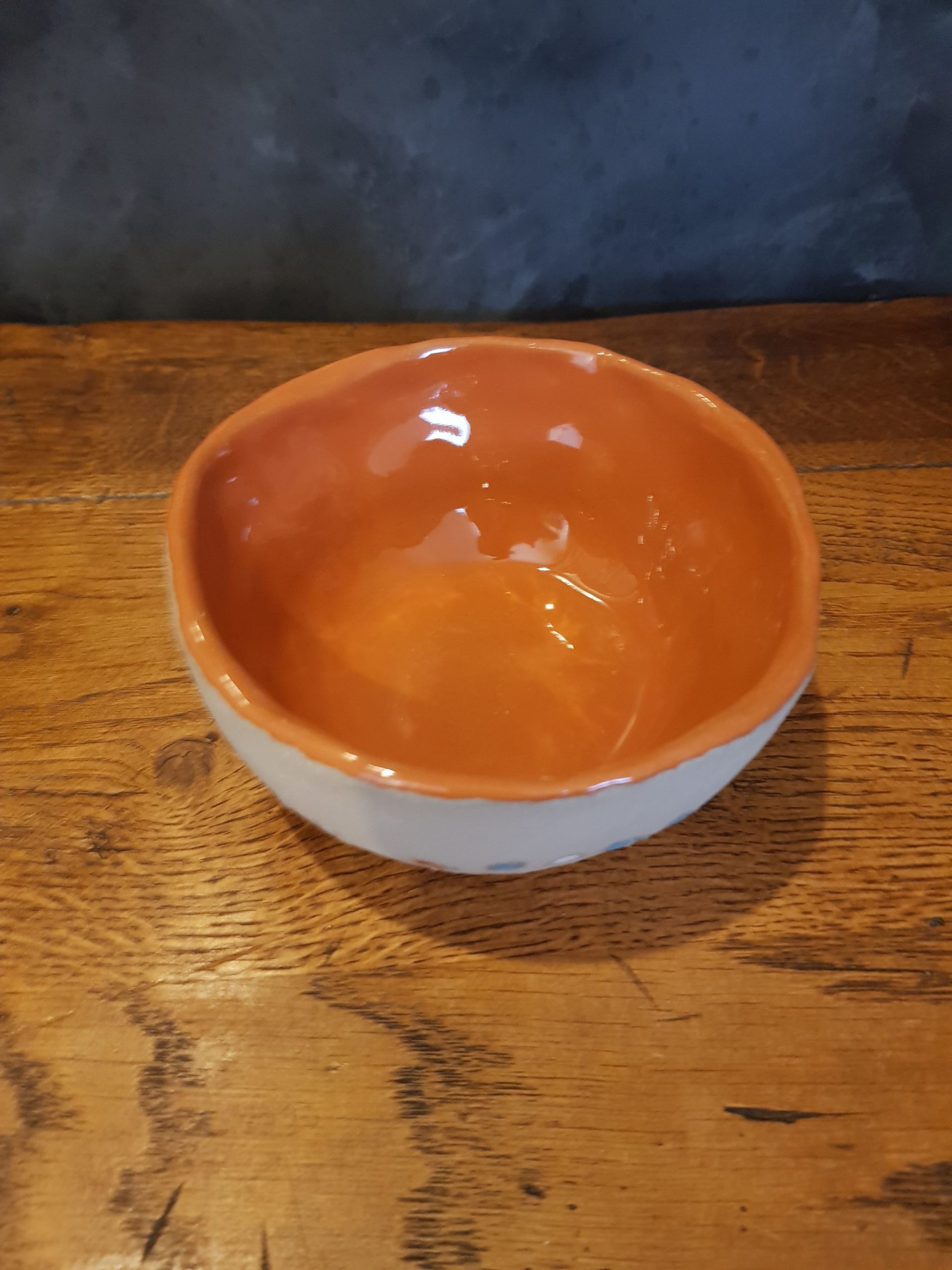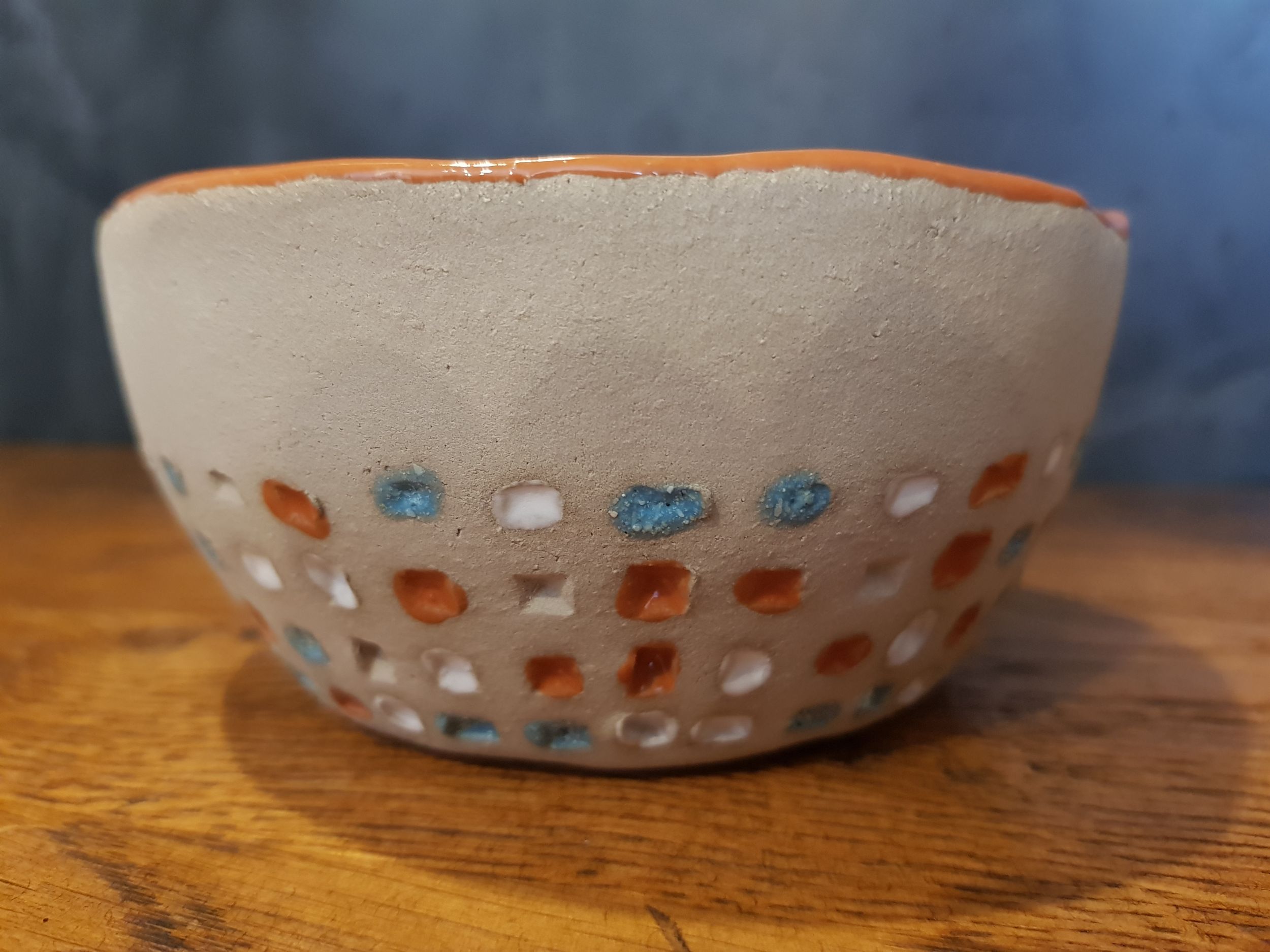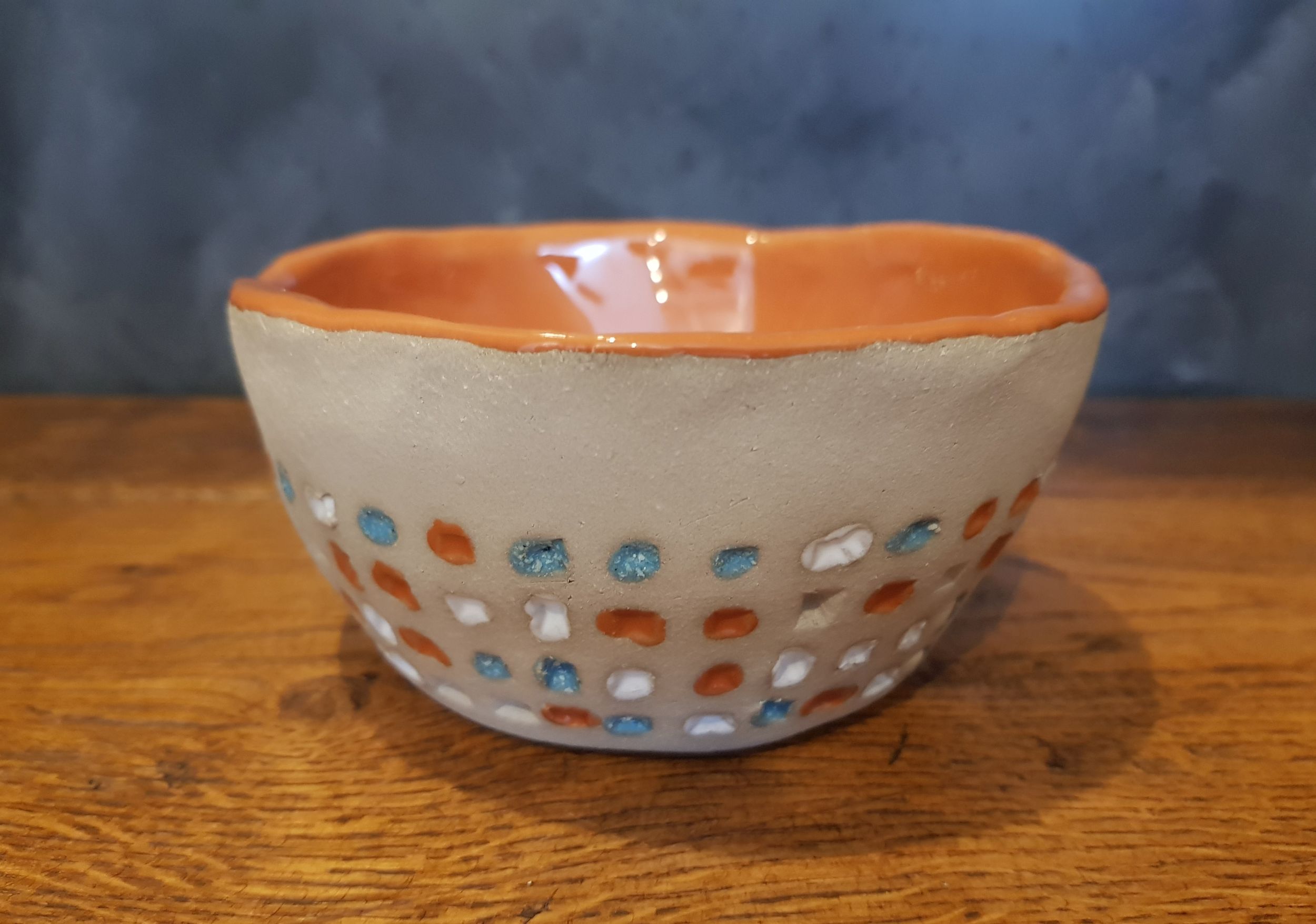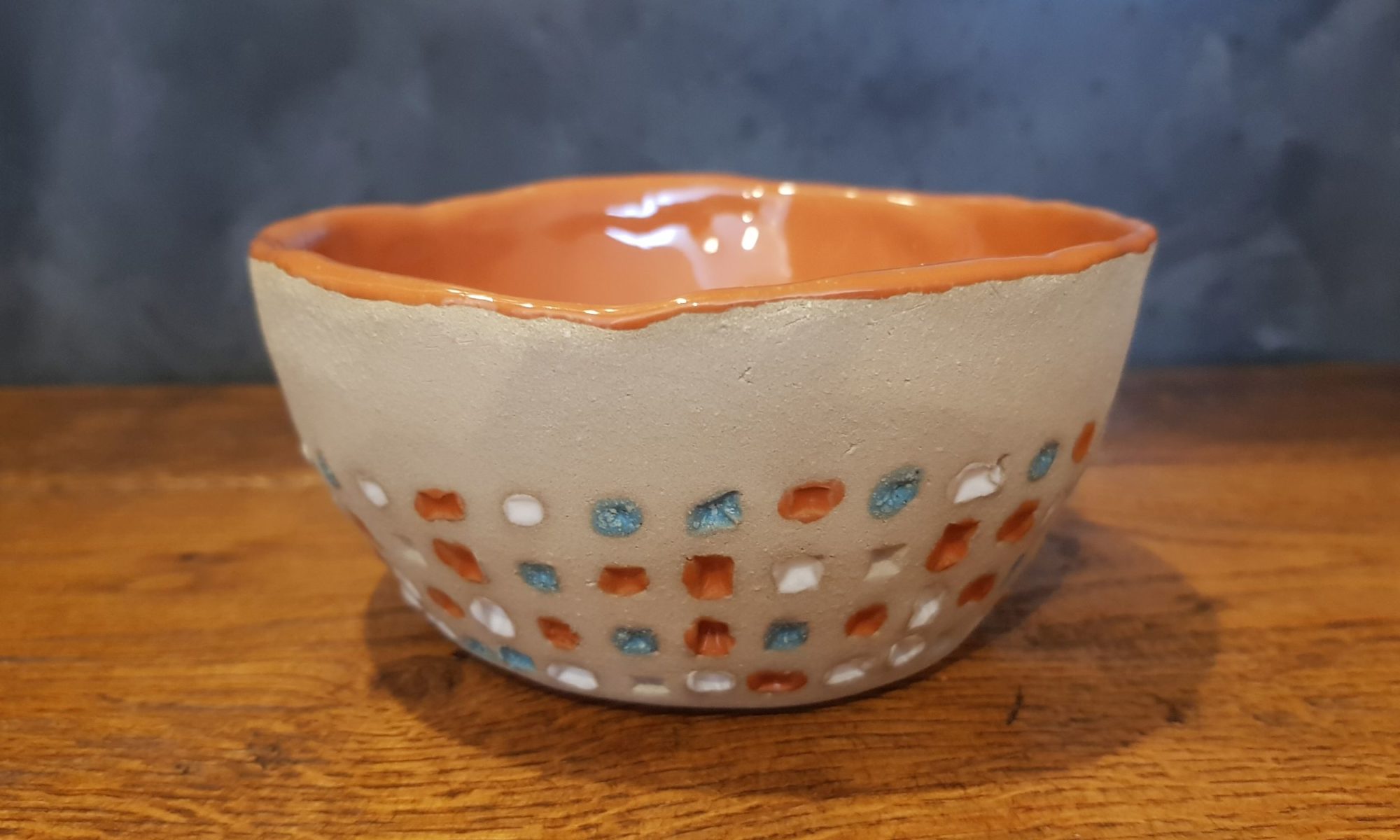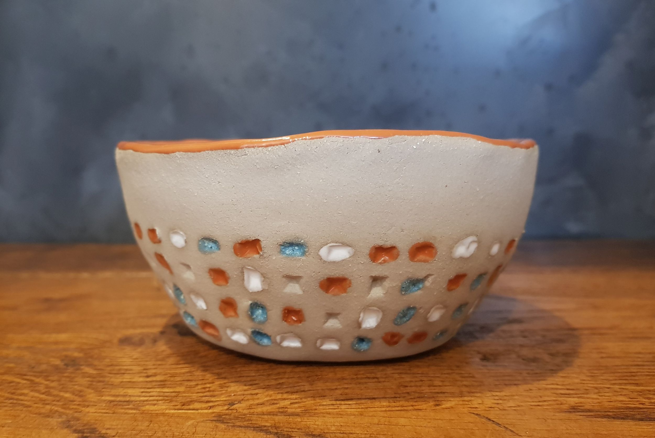 Schüssel Cilli habe ich aus grauem Ton in Handarbeit hergestellt und mit Prägungen versehen. Nach dem Schrühbrand wurde Cilli innen einfarbig hochglänzend und die Prägungen dreifarbig glasiert und ein weiteres Mal bei 1100 Grad zu Steingut gebrannt. Die Glasuren sind selbstverständlich lebensmittelecht, also gesundheitlich unbedenklich. Cilli kann in die Spülmaschine.