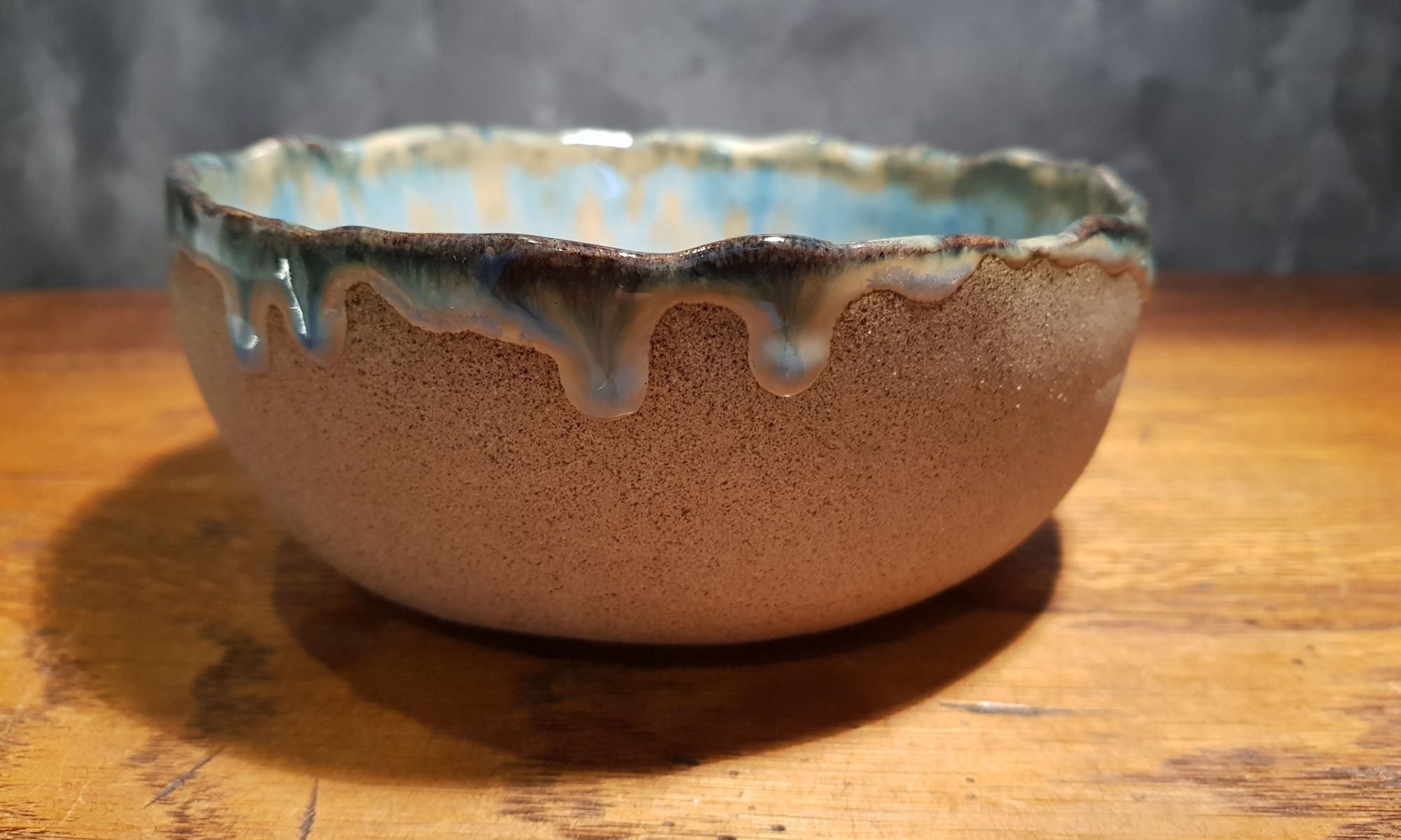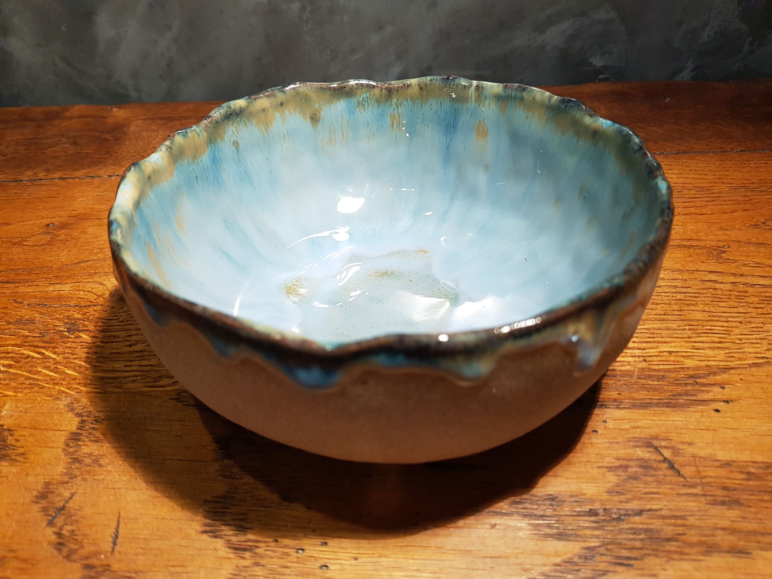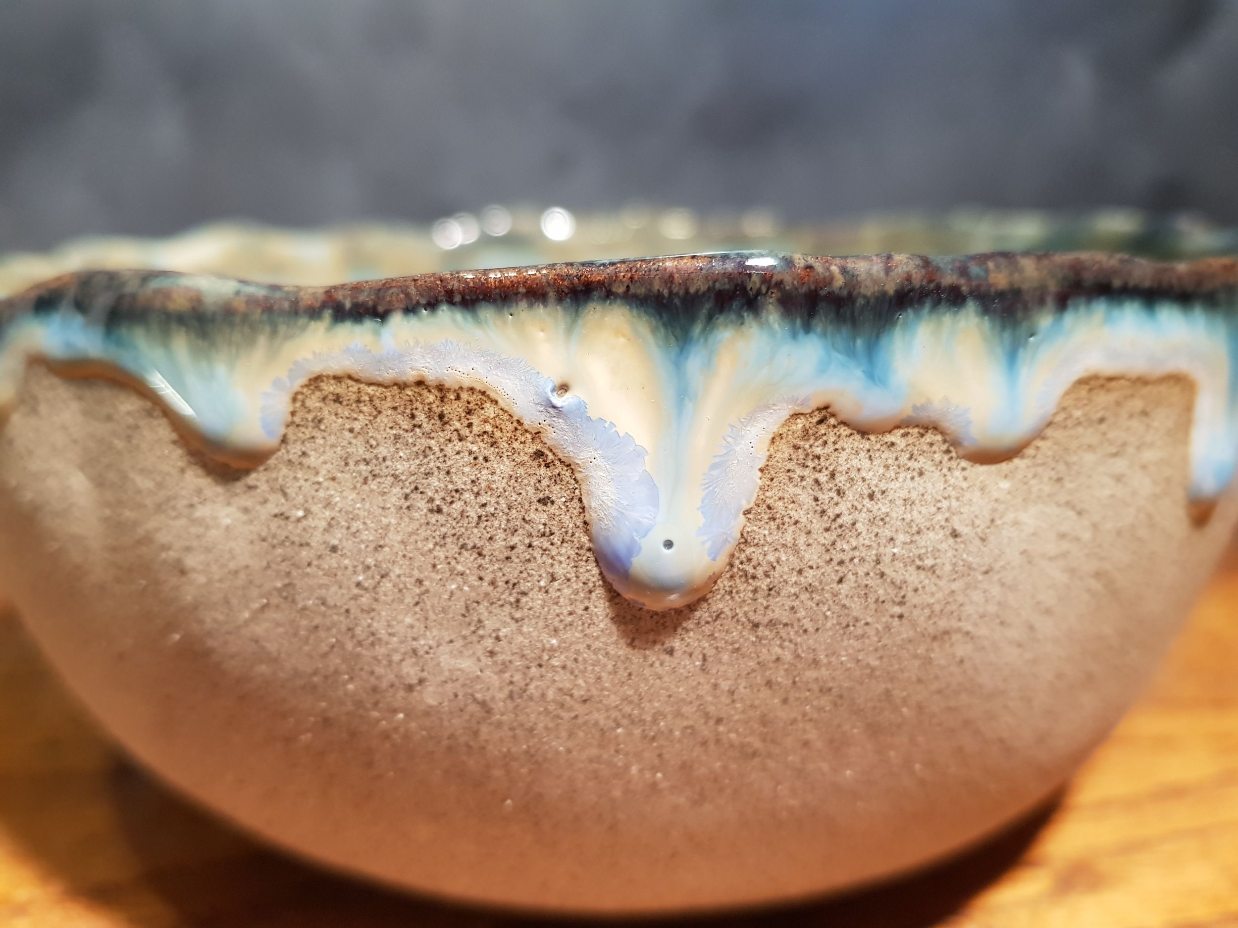 Schüssel Elies habe ich in Aufbautechnik aus einem sehr hübschen, graumeliertem Ton gefertigt. Nach dem Schrühbrand habe ich sie mit verschiedenen Glasuren glasiert, so dass ein sehr interessanter und ansprechender Verlauf gelungen ist. Sie ist im Glasurbrand bei 1200 Grad zu Steinzeug gebrannt. Die Glasuren sind lebensmittelecht und daher unbedenklich. Sie ist auch spülmaschinenfest.