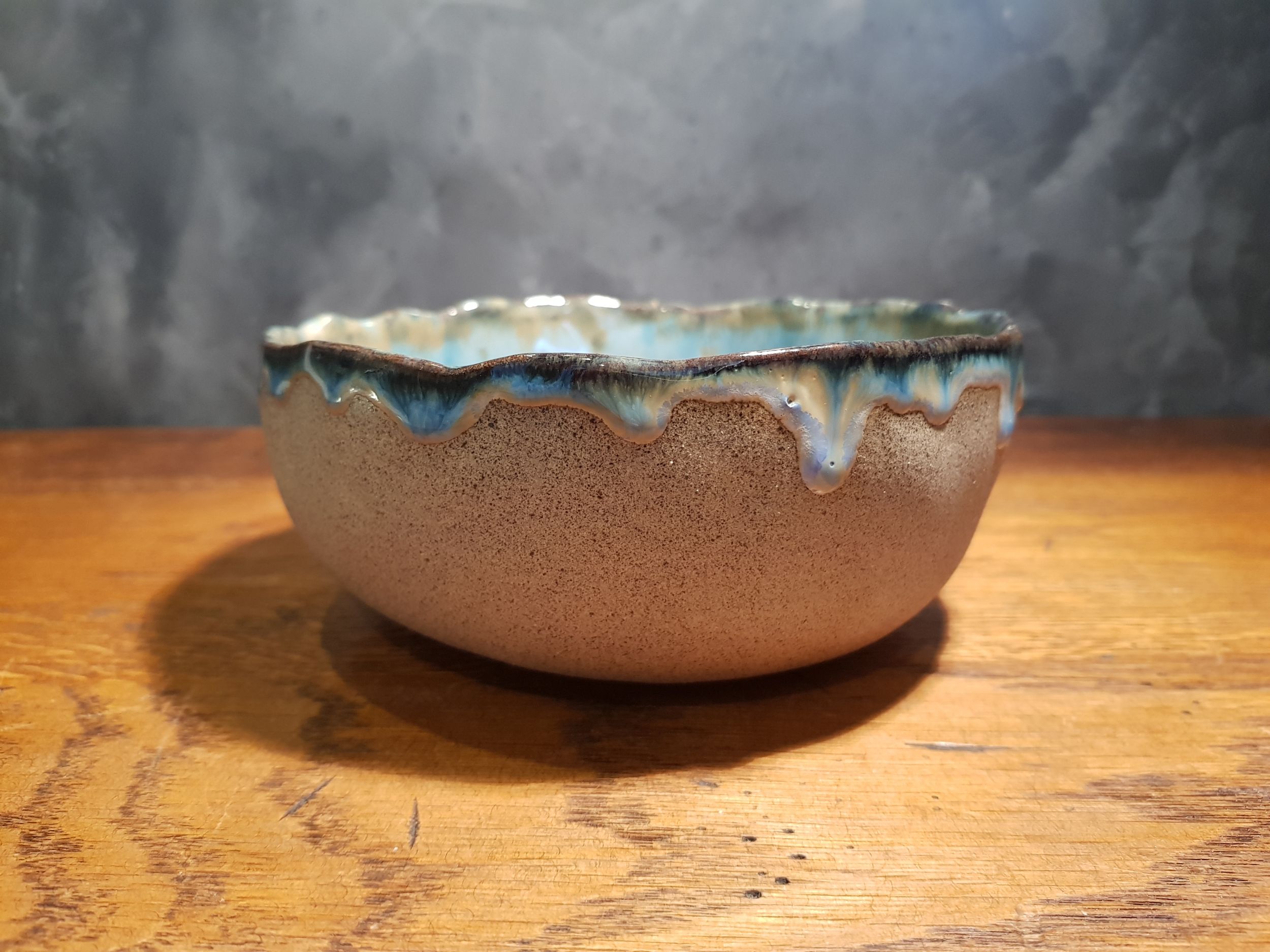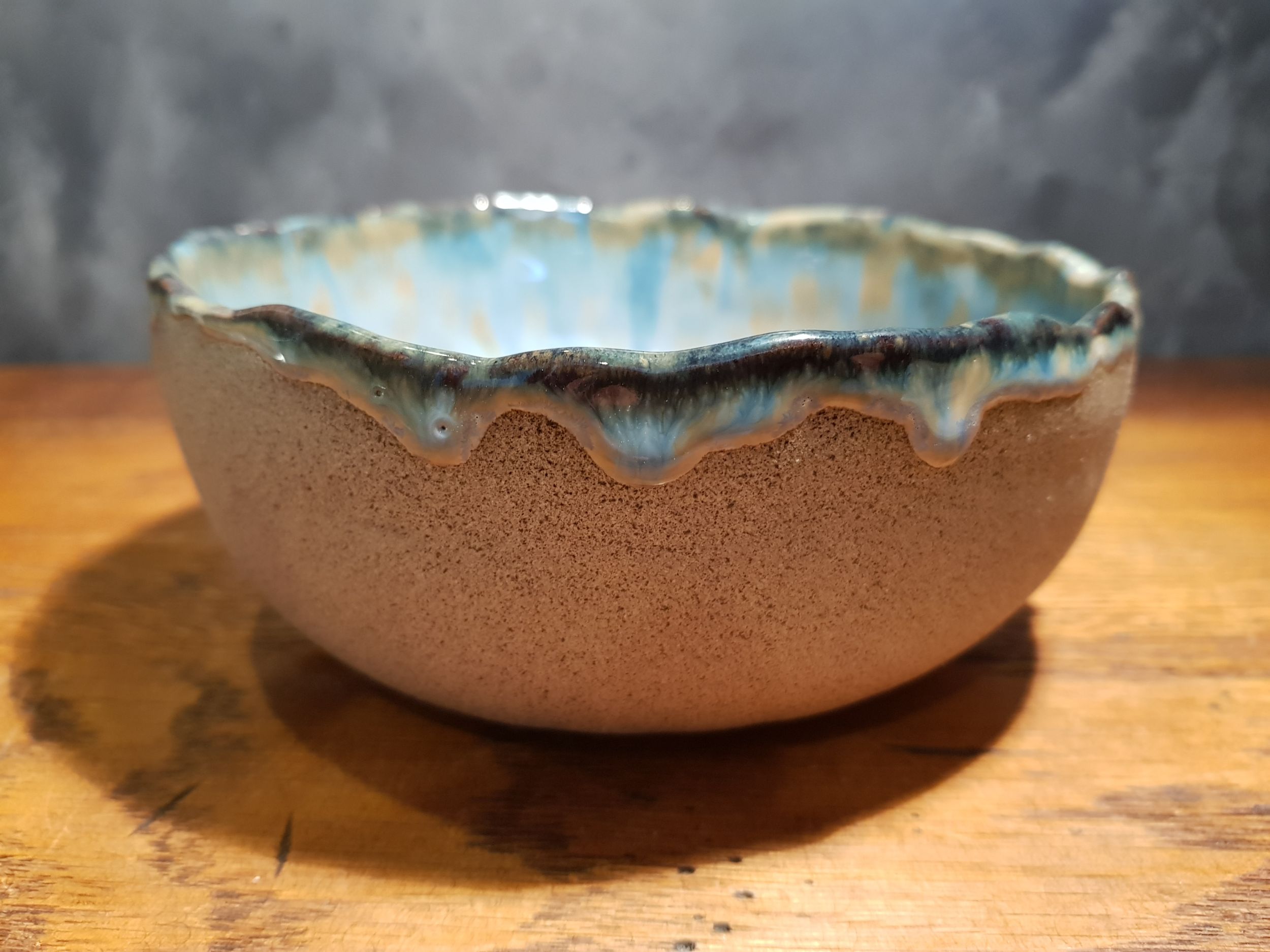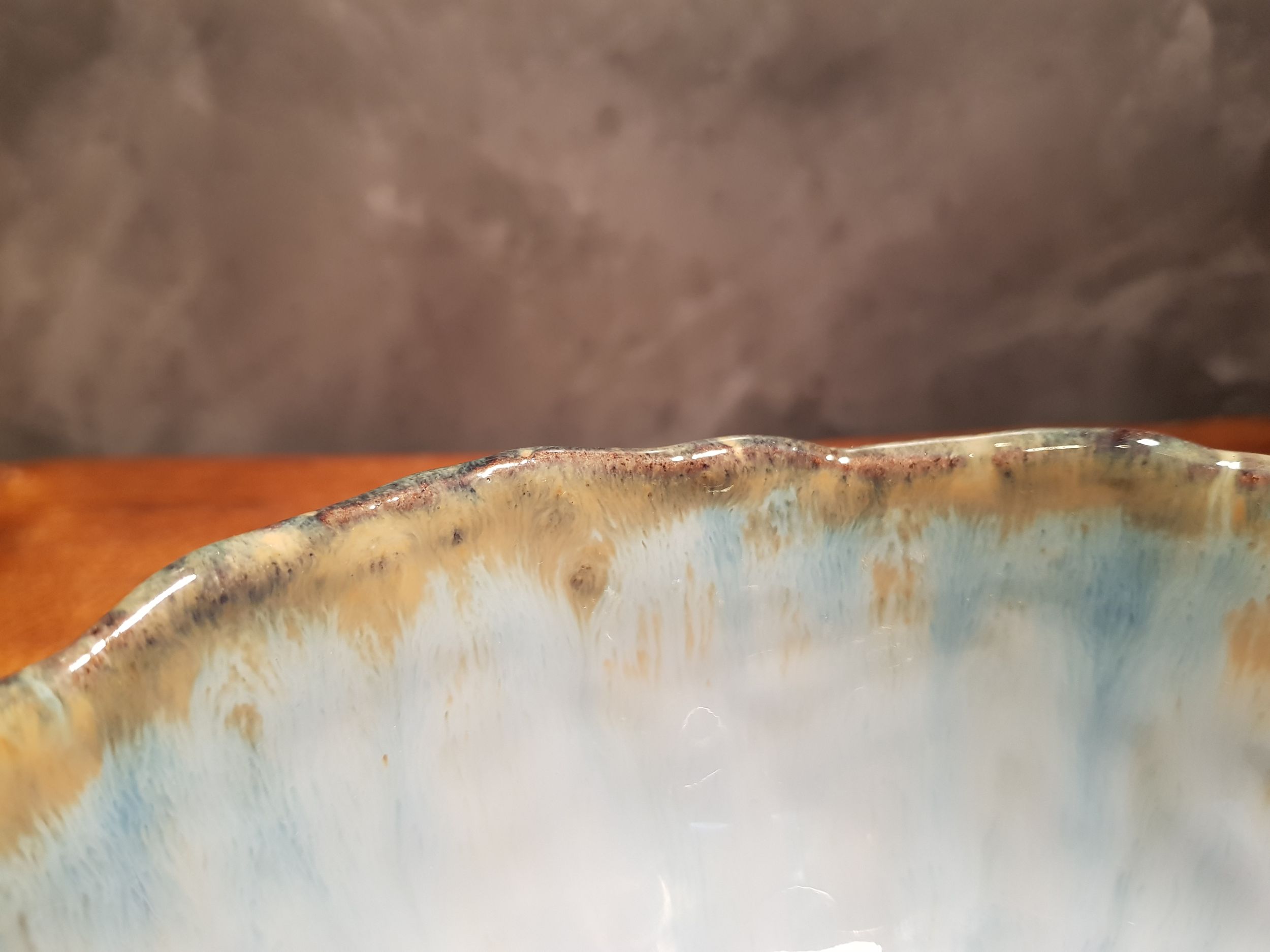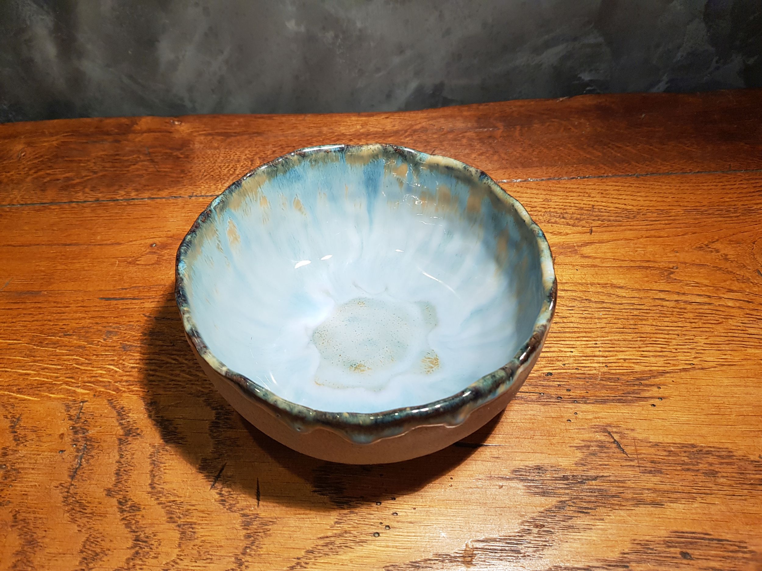 Schüssel Elies habe ich in Aufbautechnik aus einem sehr hübschen, graumeliertem Ton gefertigt. Nach dem Schrühbrand habe ich sie mit verschiedenen Glasuren glasiert, so dass ein sehr interessanter und ansprechender Verlauf gelungen ist. Sie ist im Glasurbrand bei 1200 Grad zu Steinzeug gebrannt. Die Glasuren sind lebensmittelecht und daher unbedenklich. Sie ist auch spülmaschinenfest.