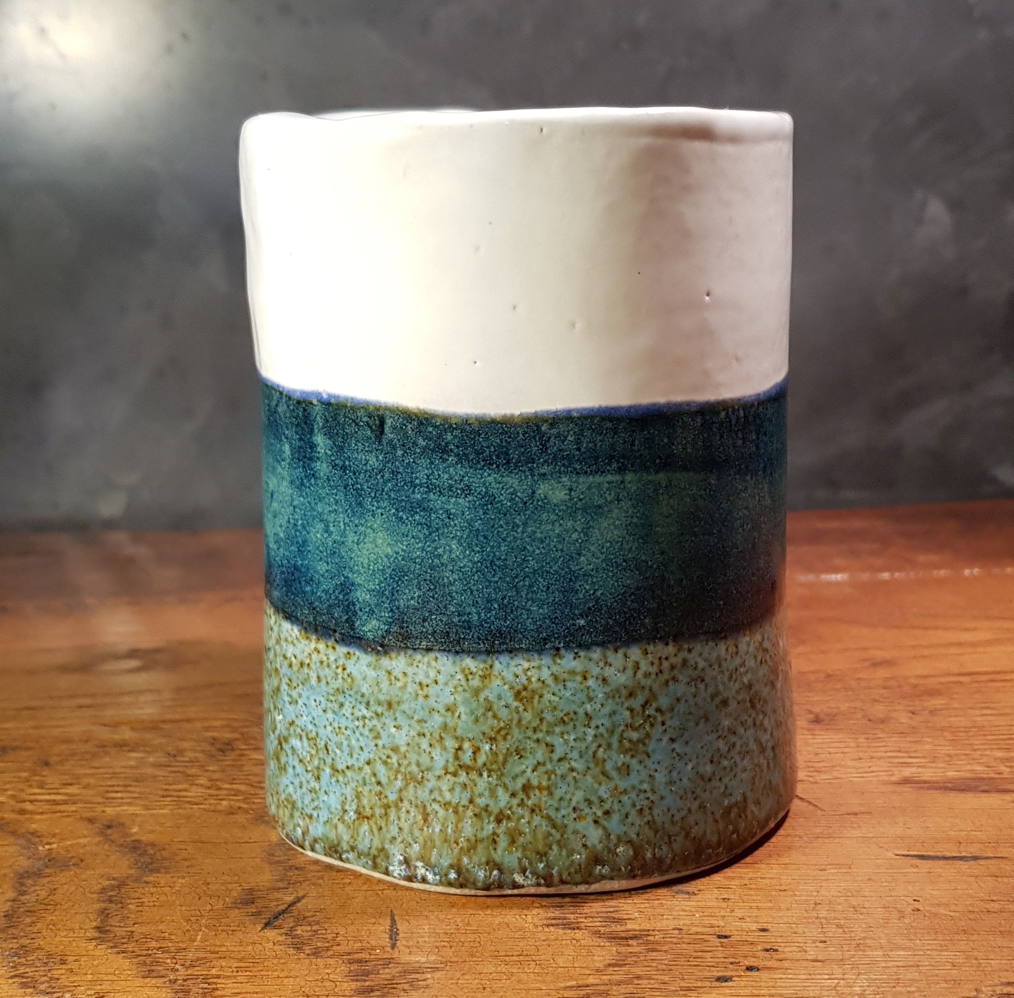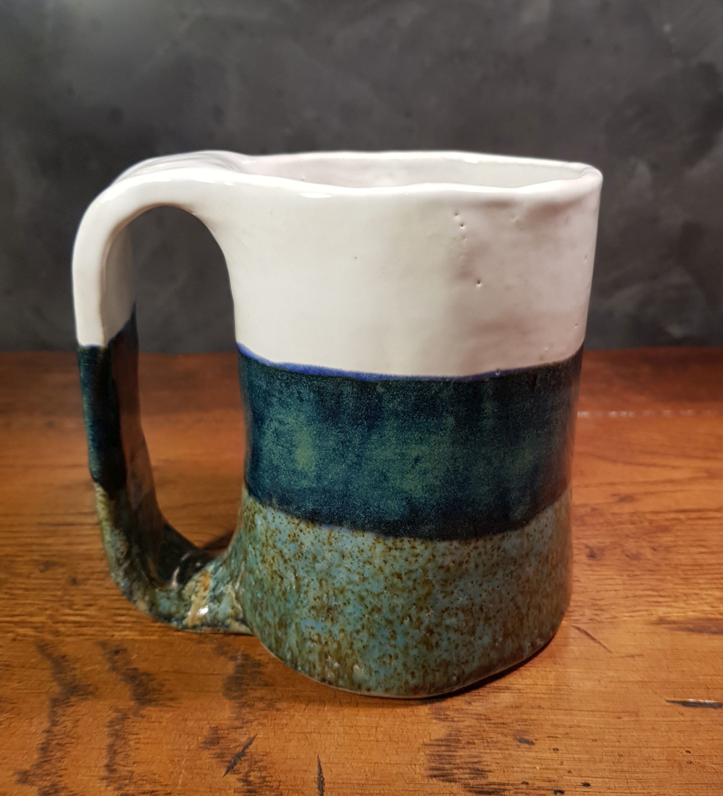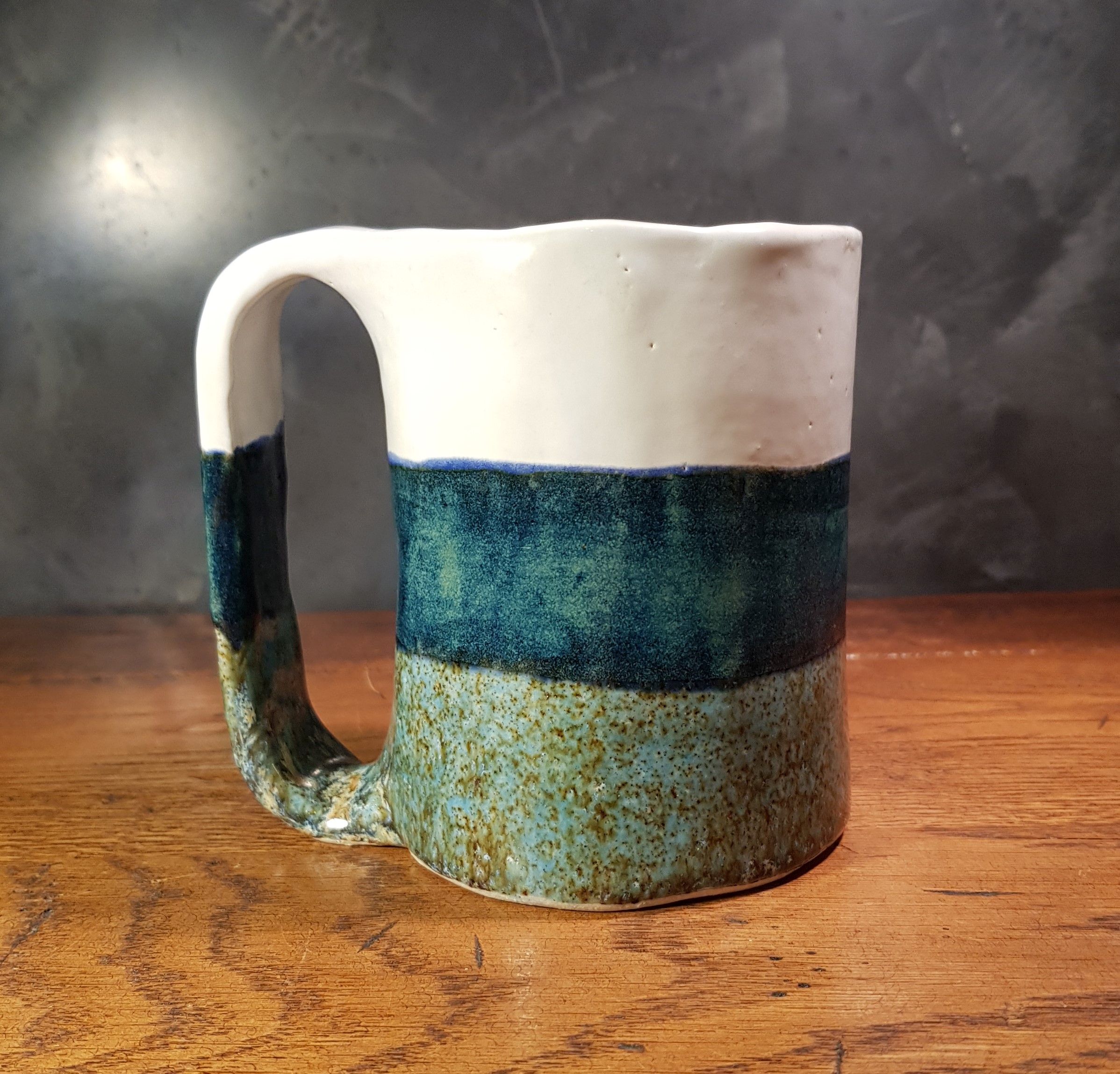 Tasse Fredl habe ich aus weißem Ton in Aufbautechnik gefertigt. Nach dem Schrühbrand habe ich sie dreifarbig glasiert und bei 1240 Grad Celsius gebrannt. Es ist daher eine sehr robuste Steinzeugtasse. Sie darf in die Spülmaschine. Die Glasuren sind selbstverständlich lebensmittelecht, d.h. gesundheitlich unbedenklich.