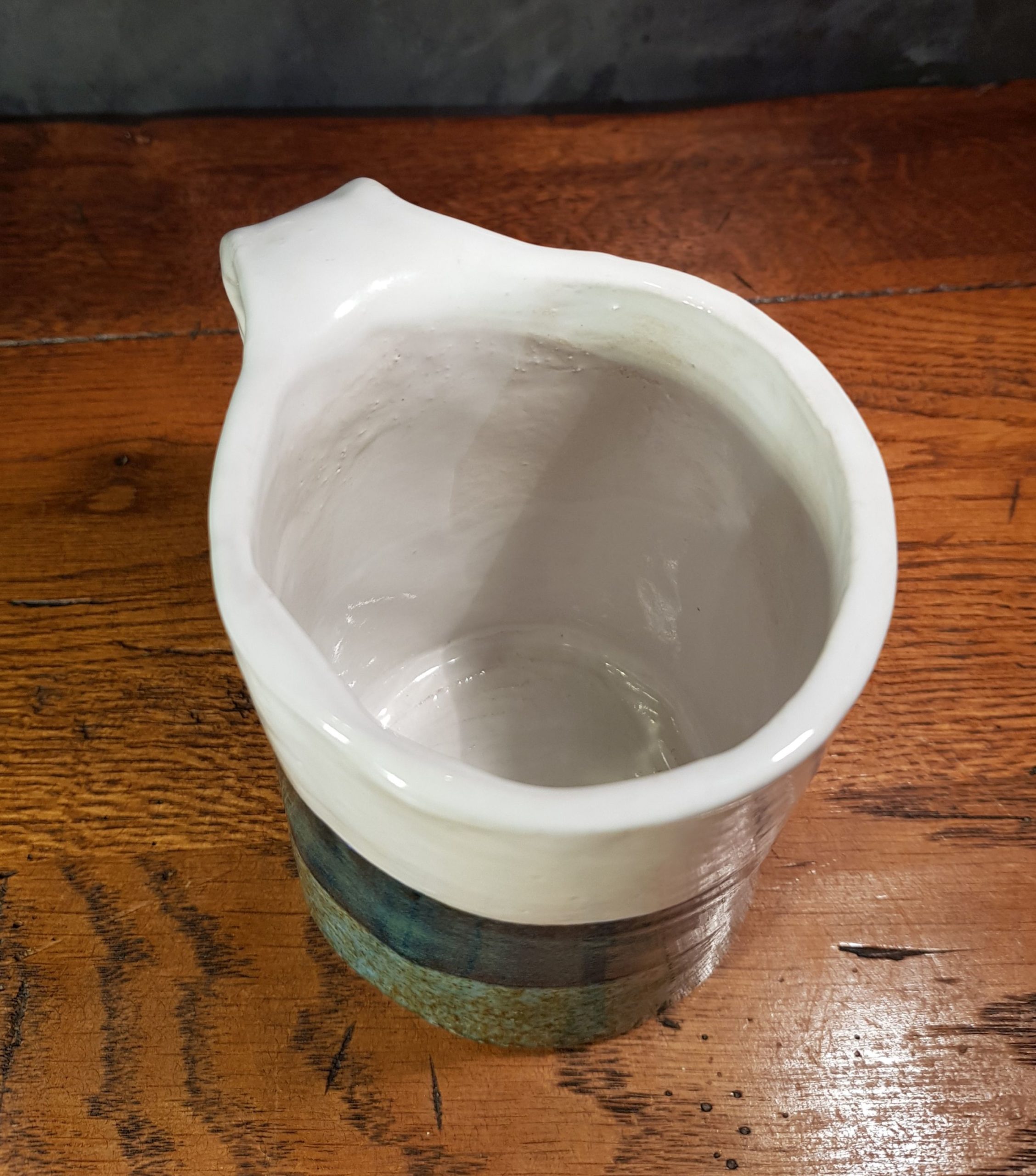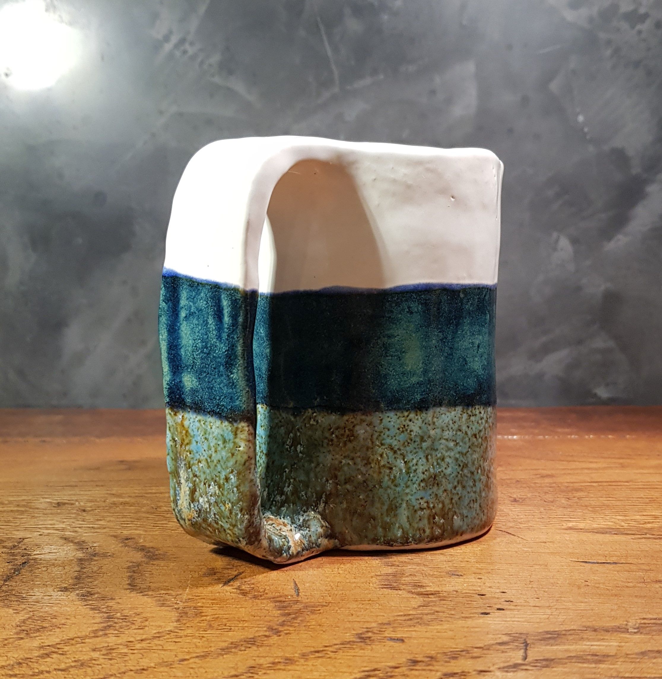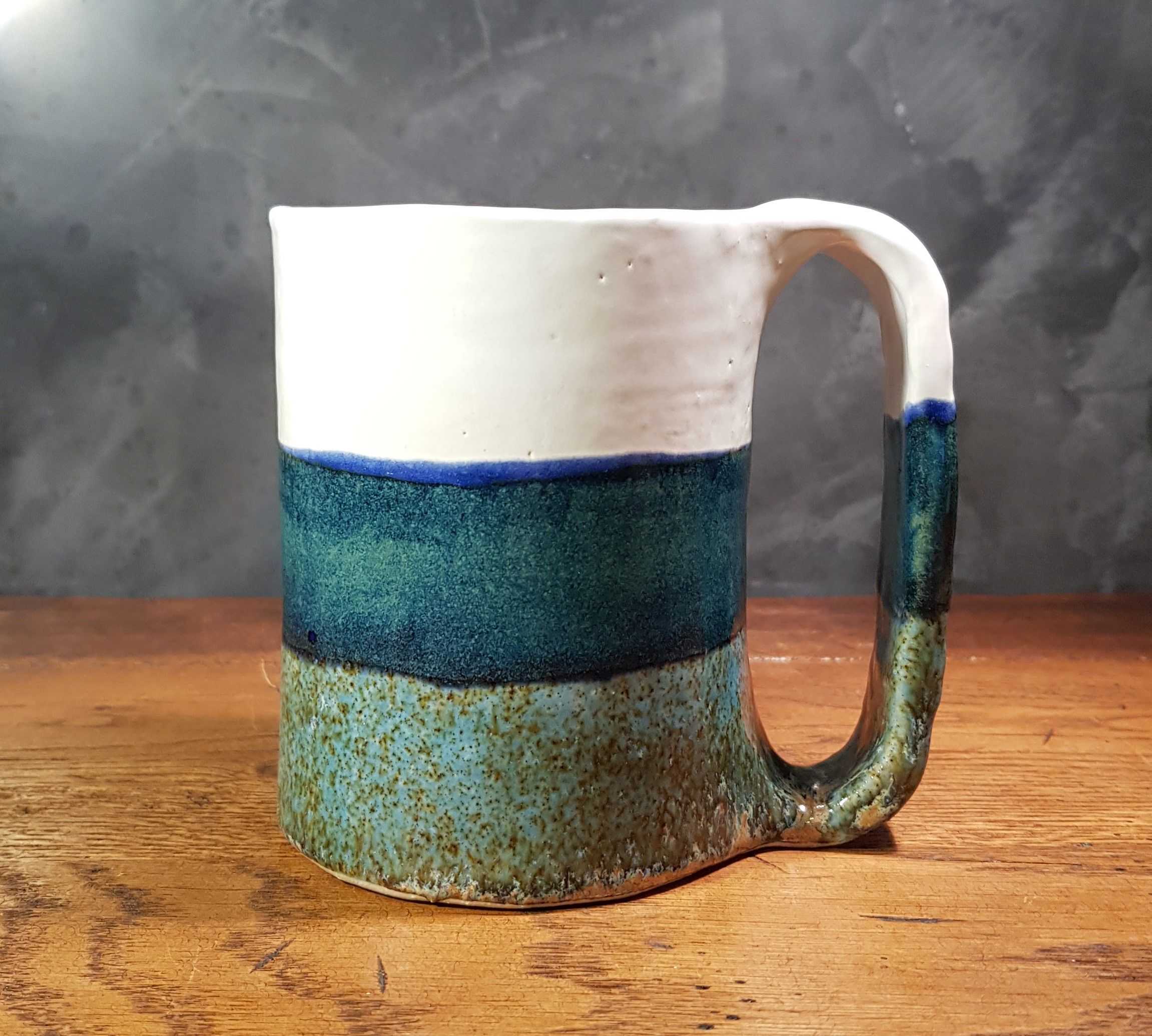 Tasse Fredl habe ich aus weißem Ton in Aufbautechnik gefertigt. Nach dem Schrühbrand habe ich sie dreifarbig glasiert und bei 1240 Grad Celsius gebrannt. Es ist daher eine sehr robuste Steinzeugtasse. Sie darf in die Spülmaschine. Die Glasuren sind selbstverständlich lebensmittelecht, d.h. gesundheitlich unbedenklich.
