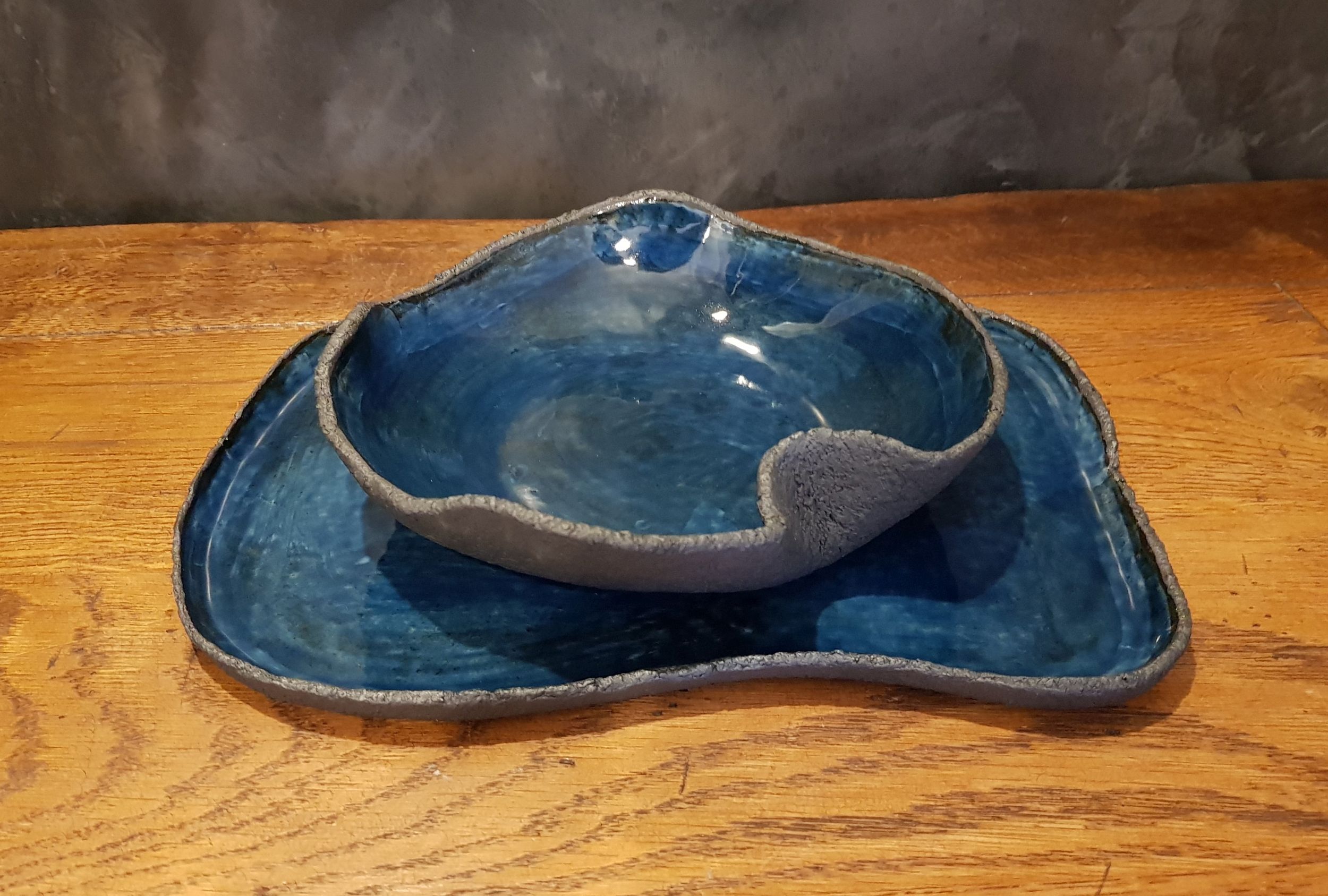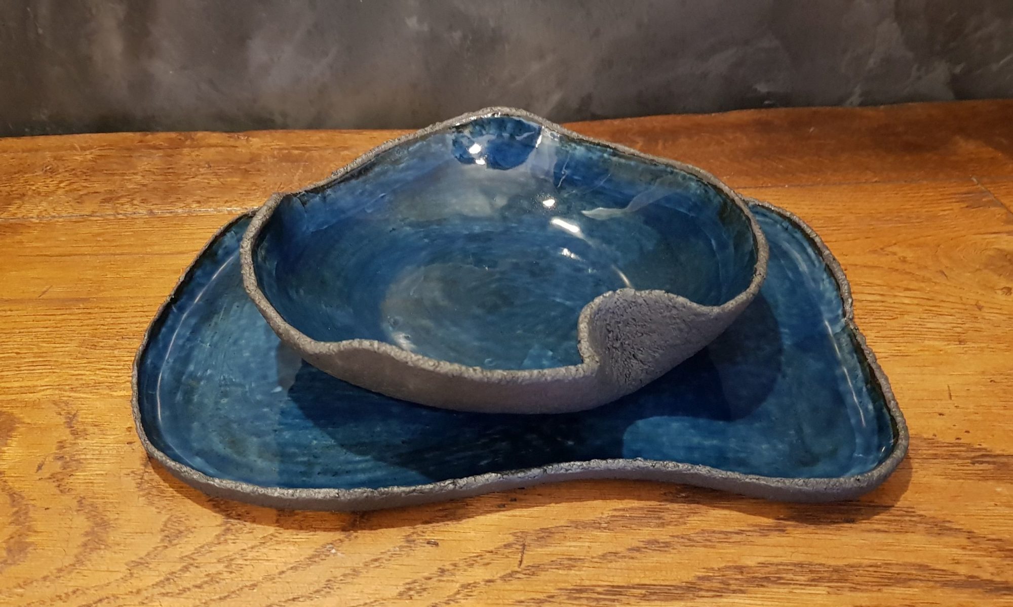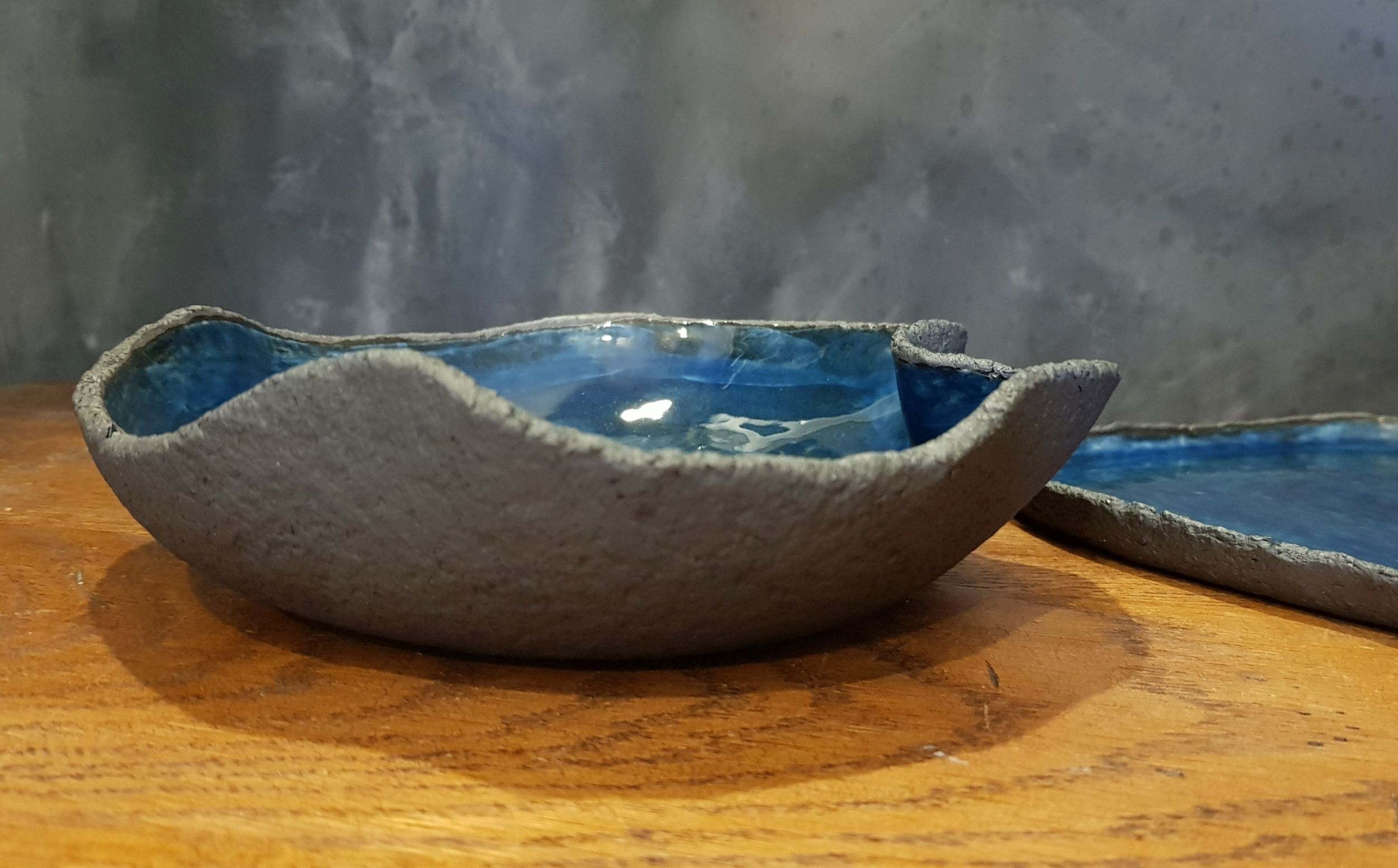 Terra Nera (schwarze Erde) steht für eine aufwändige neue Keramiklinie aus schwarzem grobem Ton, glasiert mit verschiedenen Blau- und Grüntönen. Das Set besteht aus einer Suppenschale und einem flachen Teller. Terra Nera habe ich mit einer von mir kreierten Technik geformt und auf einer Seite mit einer Struktur versehen. Nach dem ersten Brand (Schrühbrand) werden die Teller innen mit einer weißen Tonschicht überzogen und erhalten einen zweiten Brand. Hierdurch wird sichergestellt, dass sich die Farbe des schwarzen Tons bei den hohen Temperaturen nicht mit der Glasur vermischt. Danach werden diverse Glasurschichten innen aufgetragen und im dritten Brand zu Steinzeug (und zum Leuchten und Glänzen) gebracht.