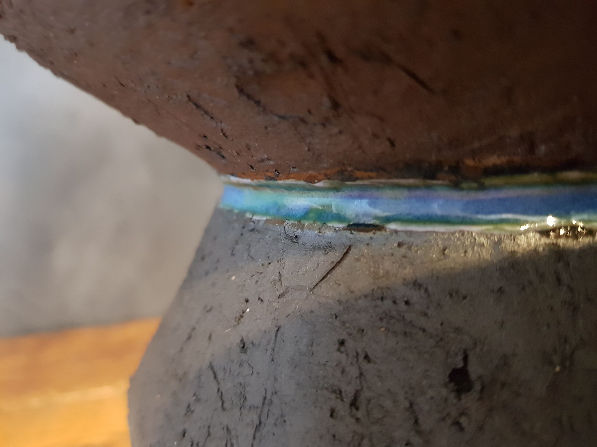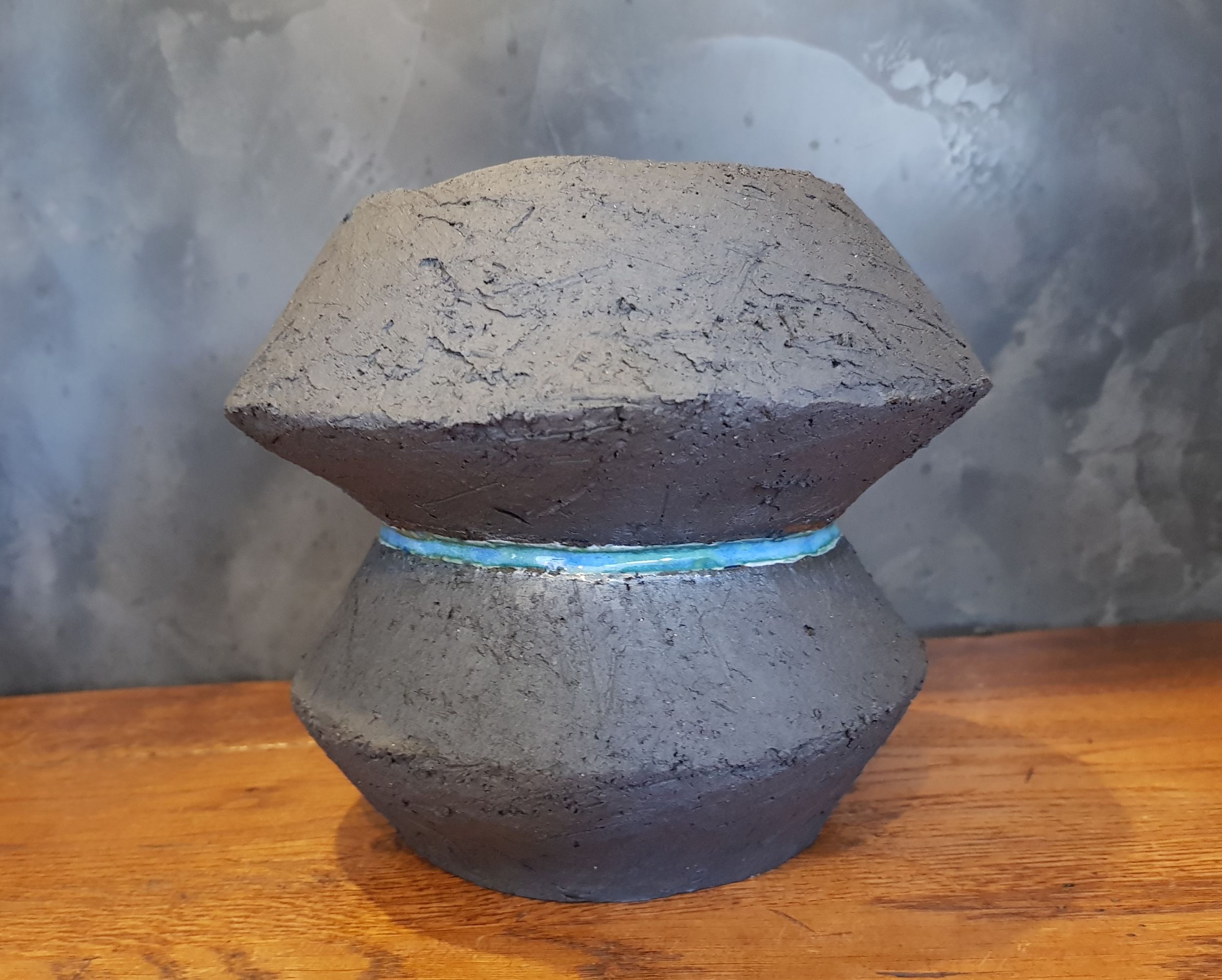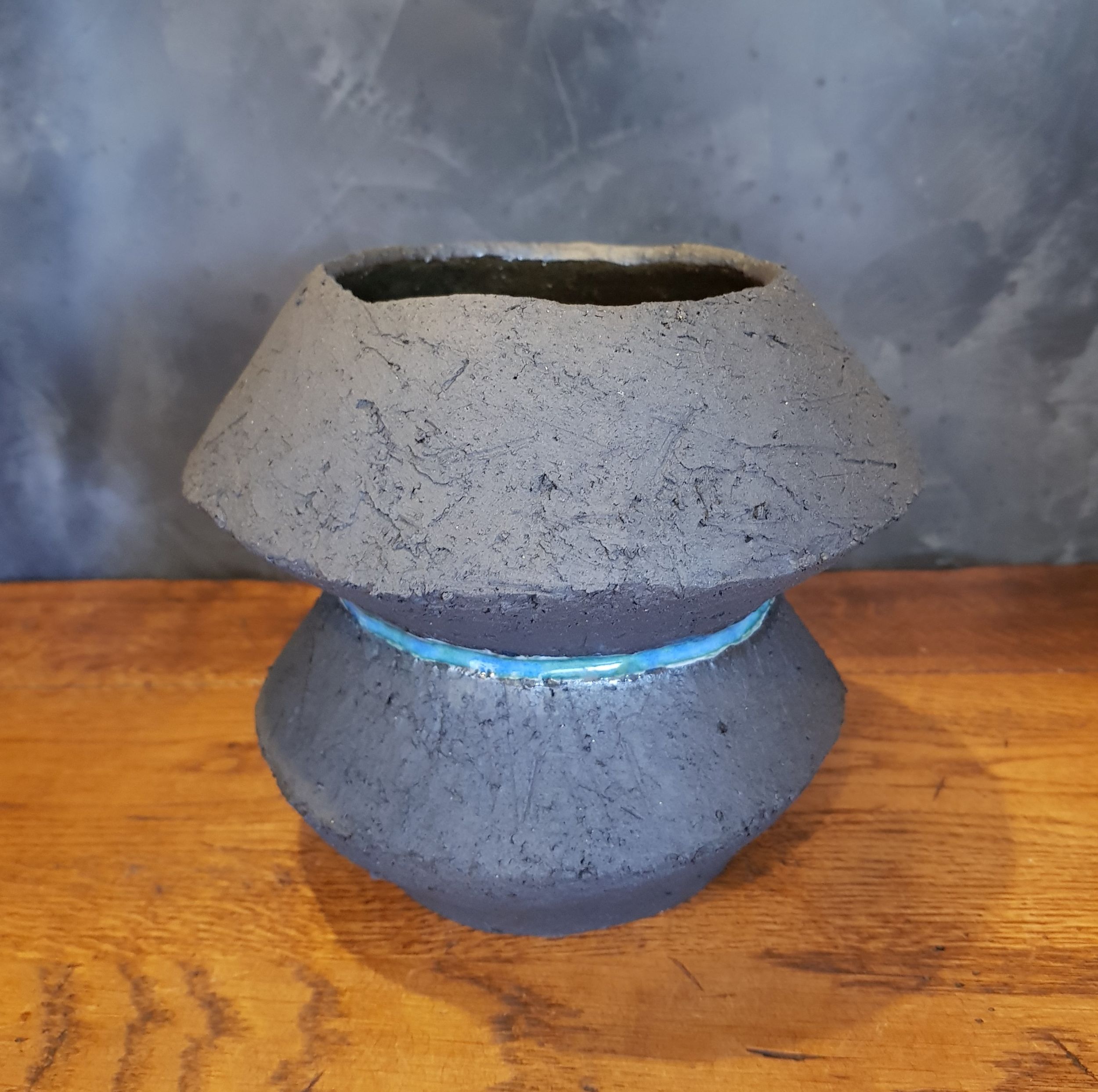 Die Keramikvase Birgit habe ich aus grobem schwarzen Ton in Aufbautechnik gefertigt und die Oberfläche rustikal bearbeitet. Birgit hat zwei Schrühbrände und einen Glasurbrand durchlaufen, um den effektvollen Mittelstreifen zu erzeugen. Innen wurde sie für eine problemlose Reinigung farblos glasiert. Birgit wurde bei 1220 Grad zu Steinzeug gebrannt.