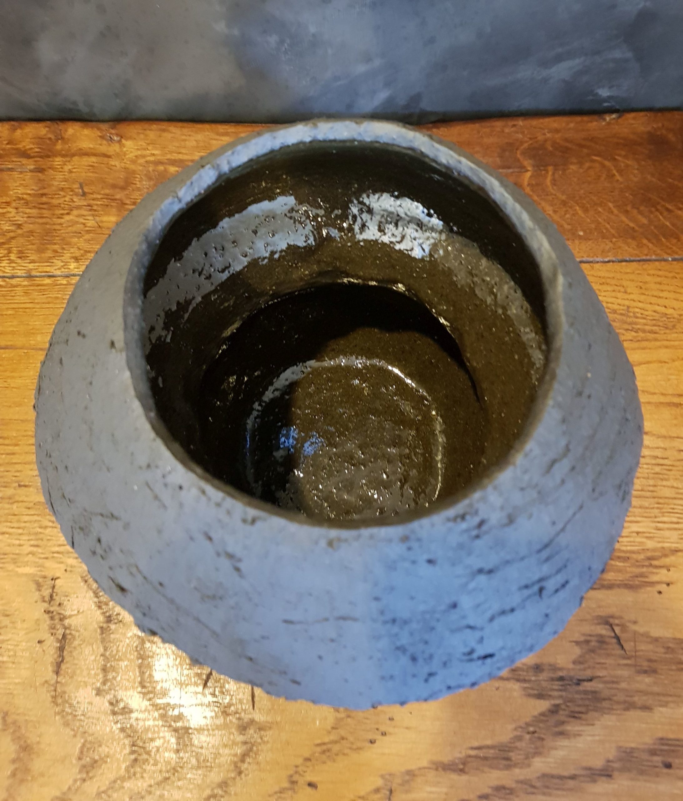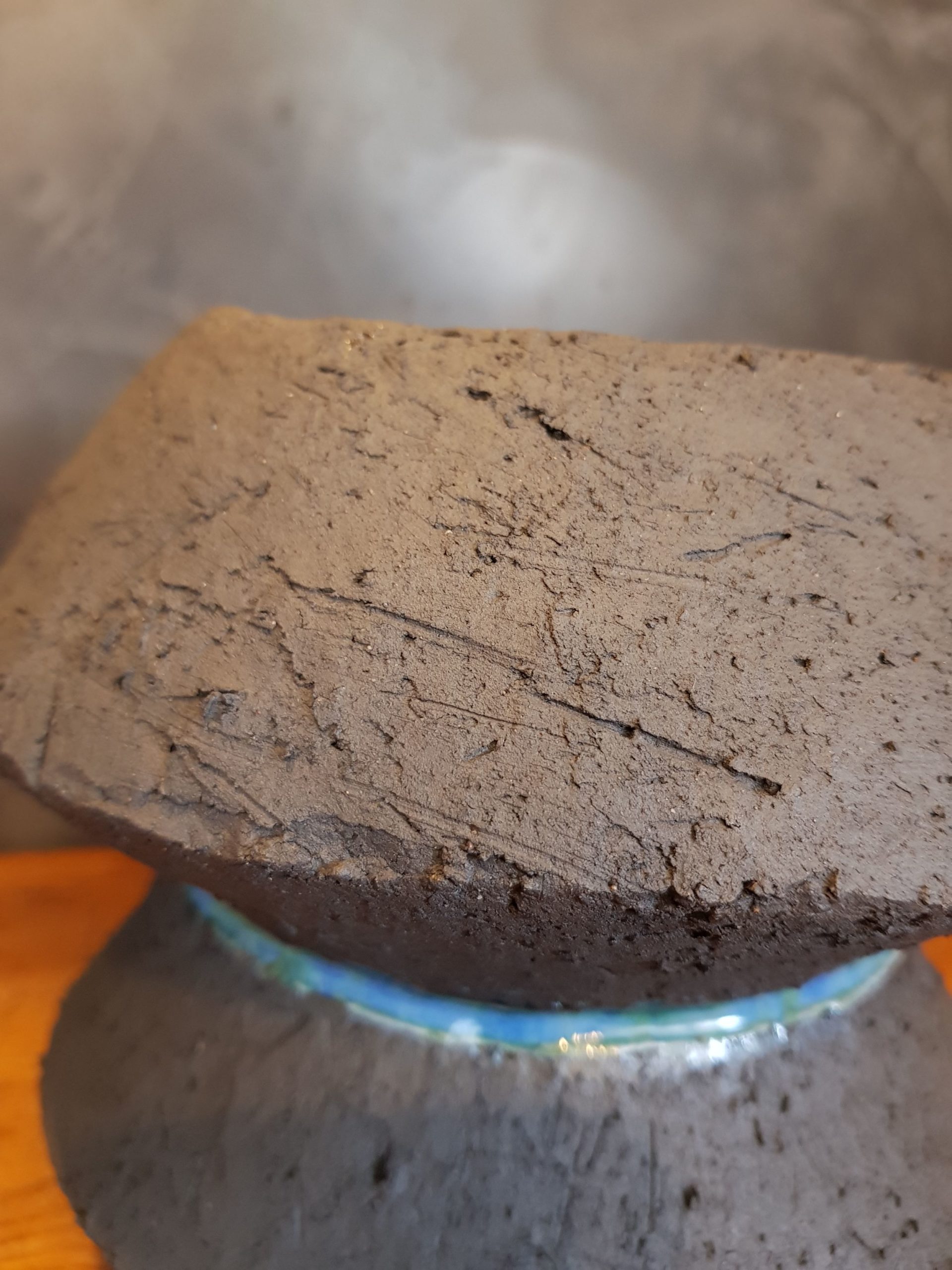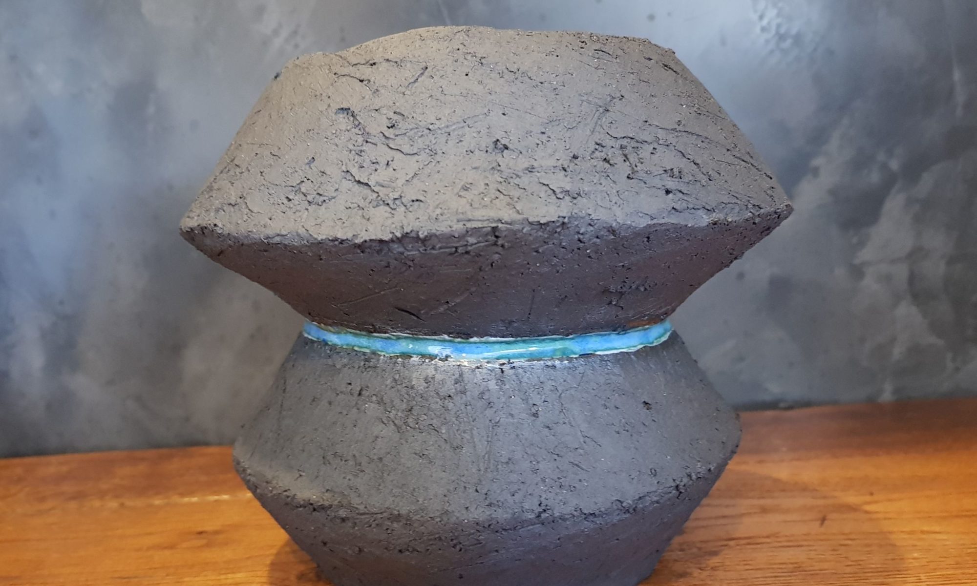 Die Keramikvase Birgit habe ich aus grobem schwarzen Ton in Aufbautechnik gefertigt und die Oberfläche rustikal bearbeitet. Birgit hat zwei Schrühbrände und einen Glasurbrand durchlaufen, um den effektvollen Mittelstreifen zu erzeugen. Innen wurde sie für eine problemlose Reinigung farblos glasiert. Birgit wurde bei 1220 Grad zu Steinzeug gebrannt.