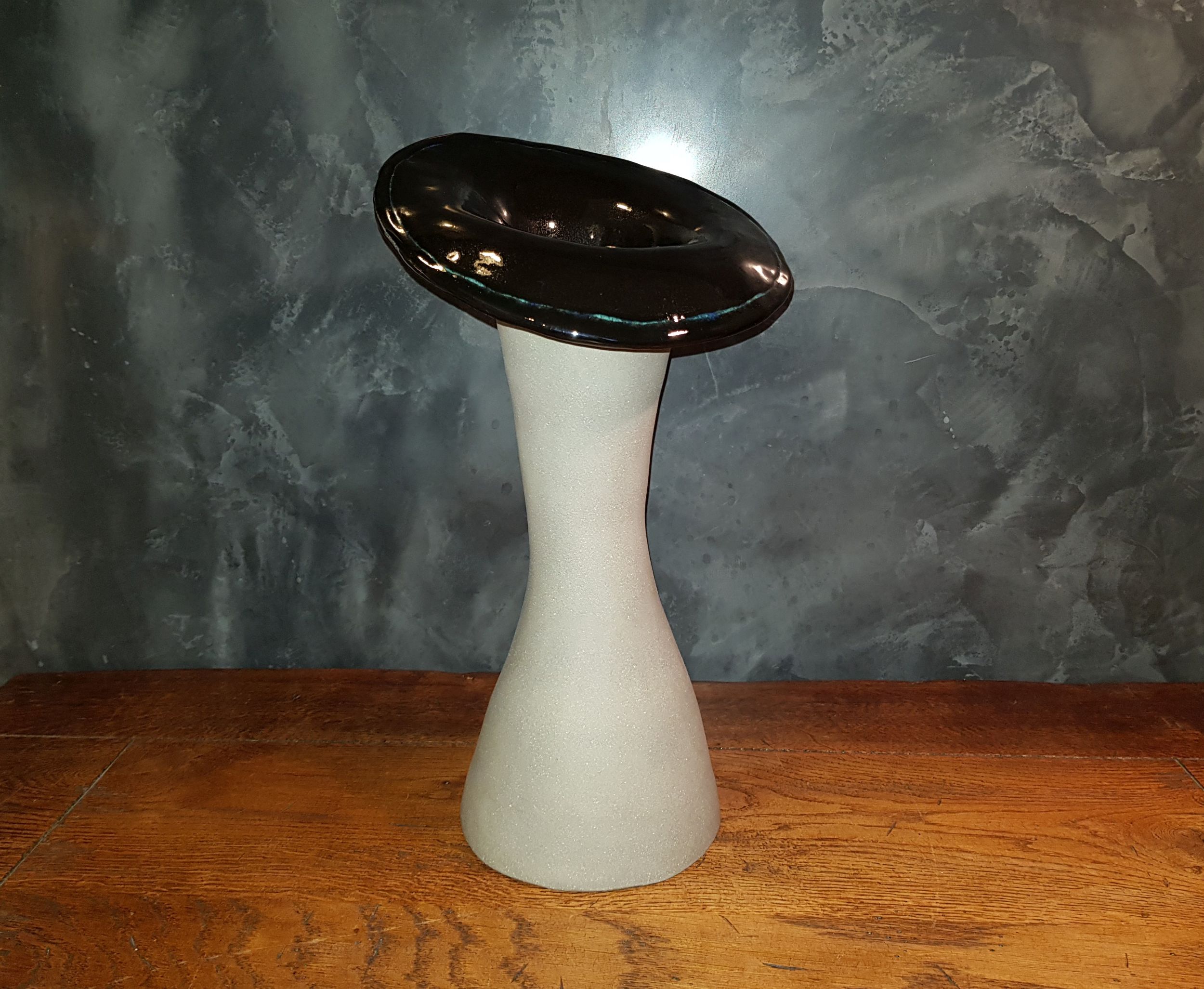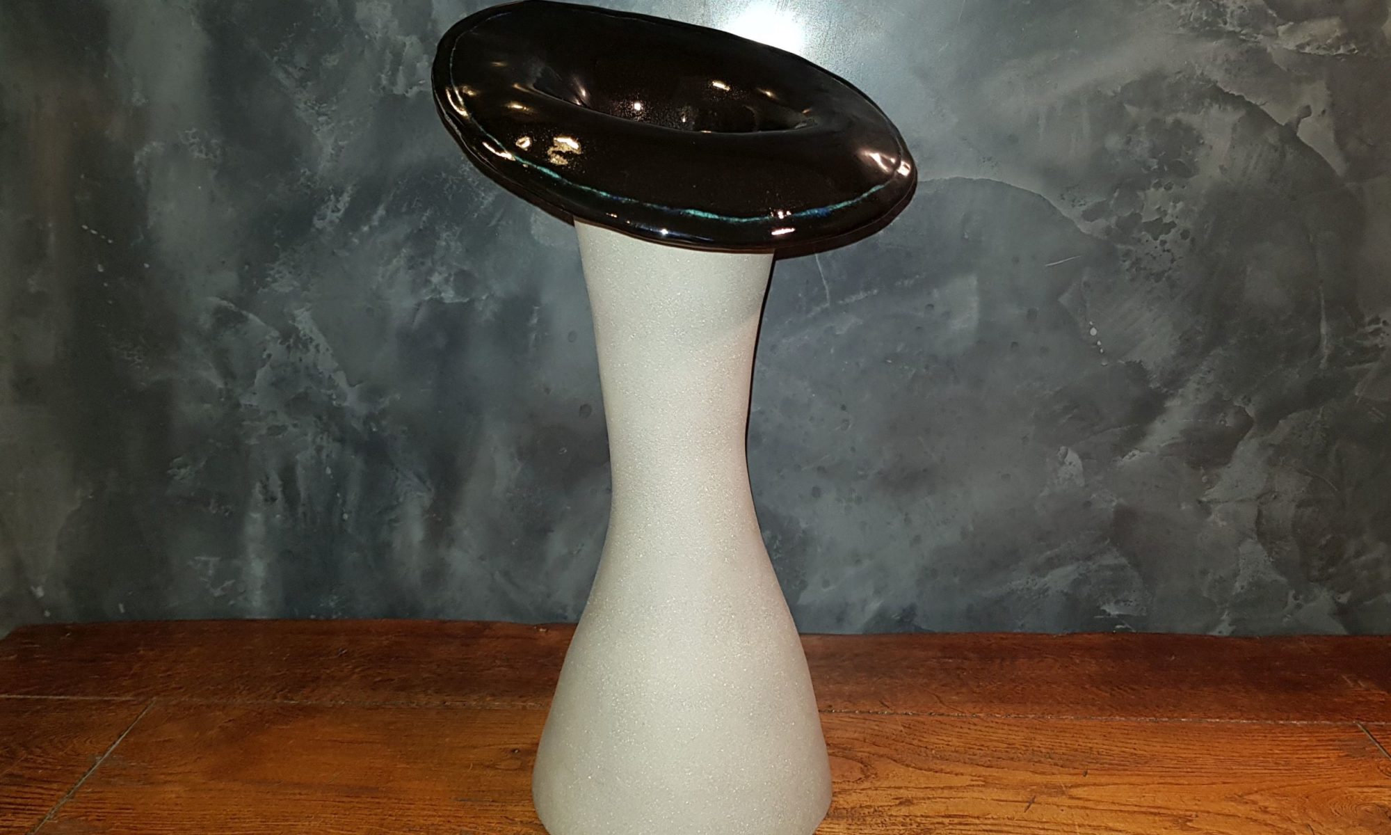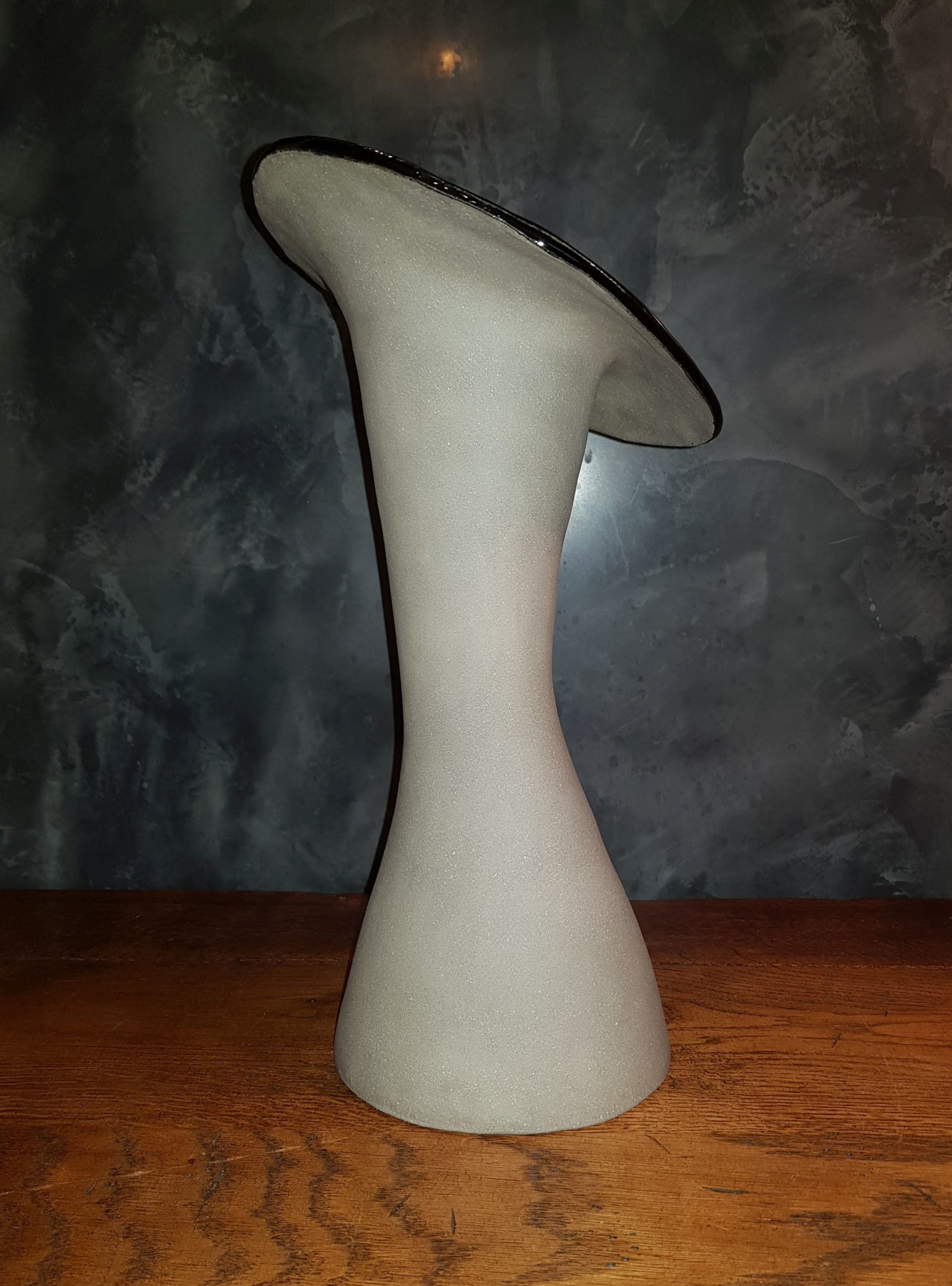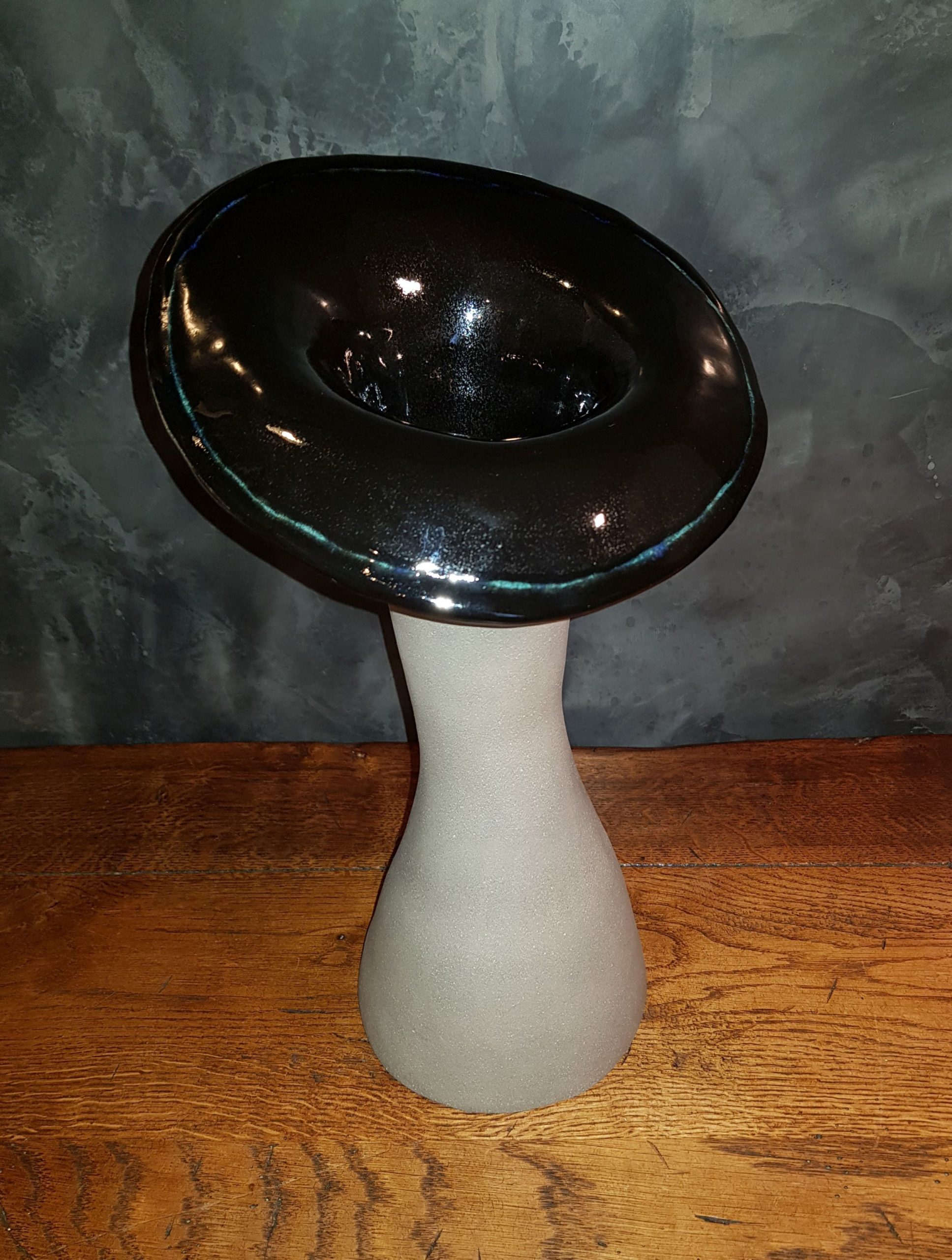 Vase Dorothea habe ich aus grauem, feinkörnigem Ton in Aufbautechnik gefertigt. Nach dem Schrühbrand habe ich sie schwarzglitzerig glasiert und bei 1240 Grad zu Steinzeug gebrannt.