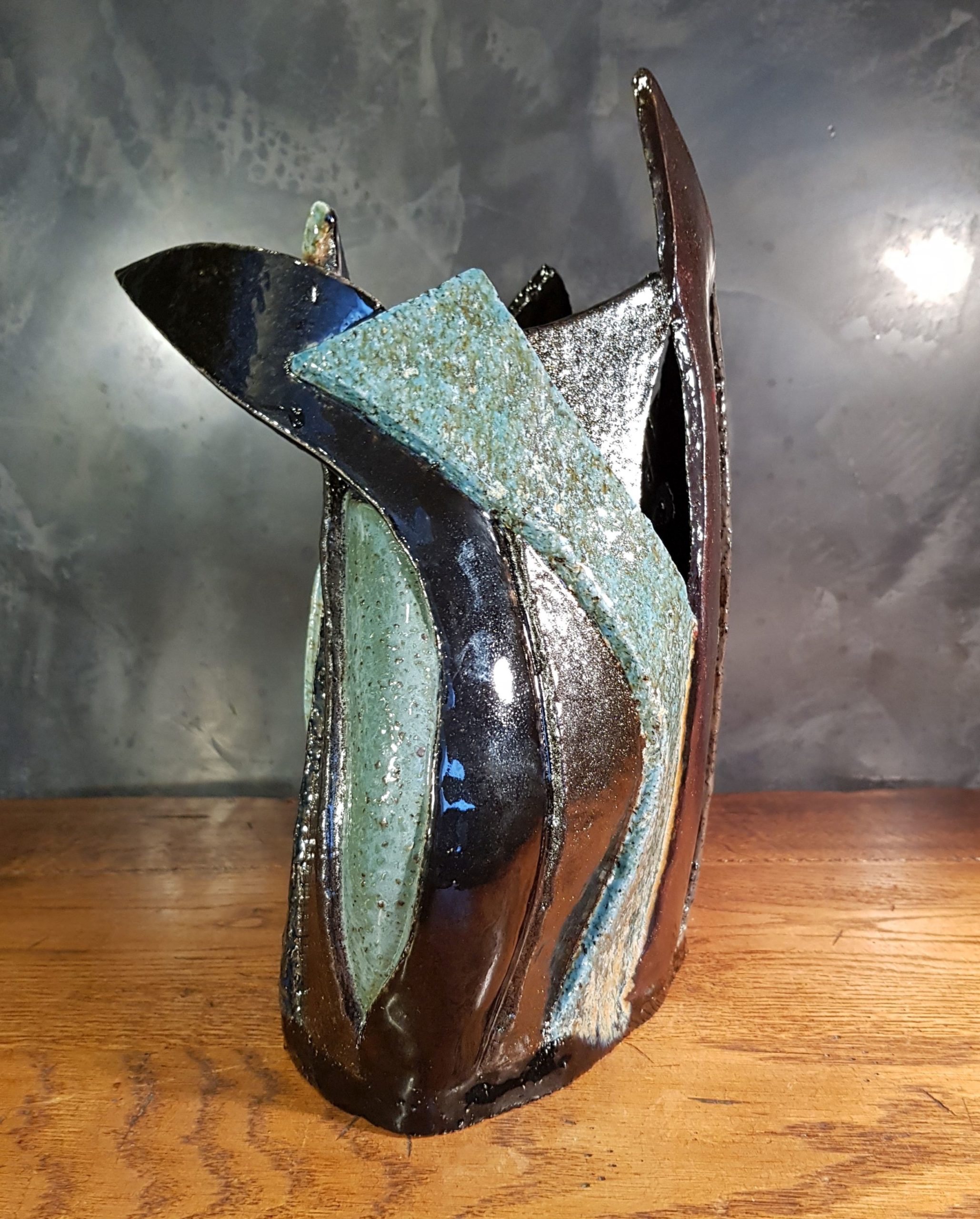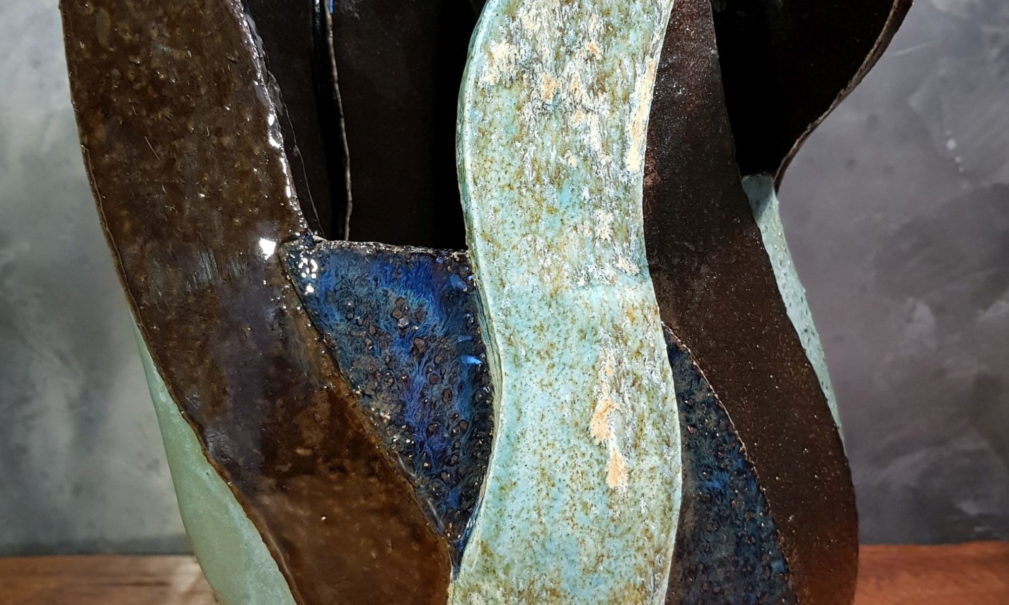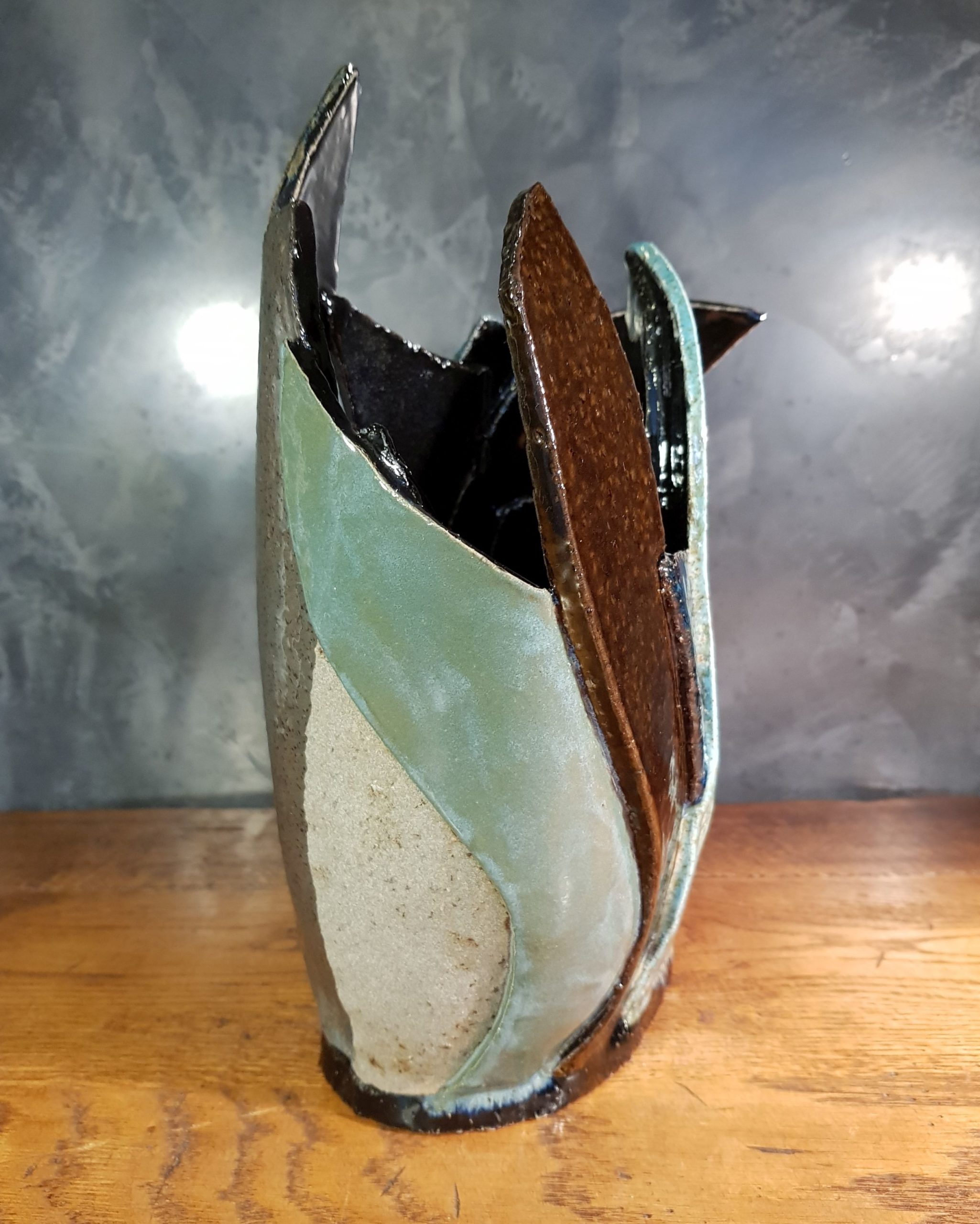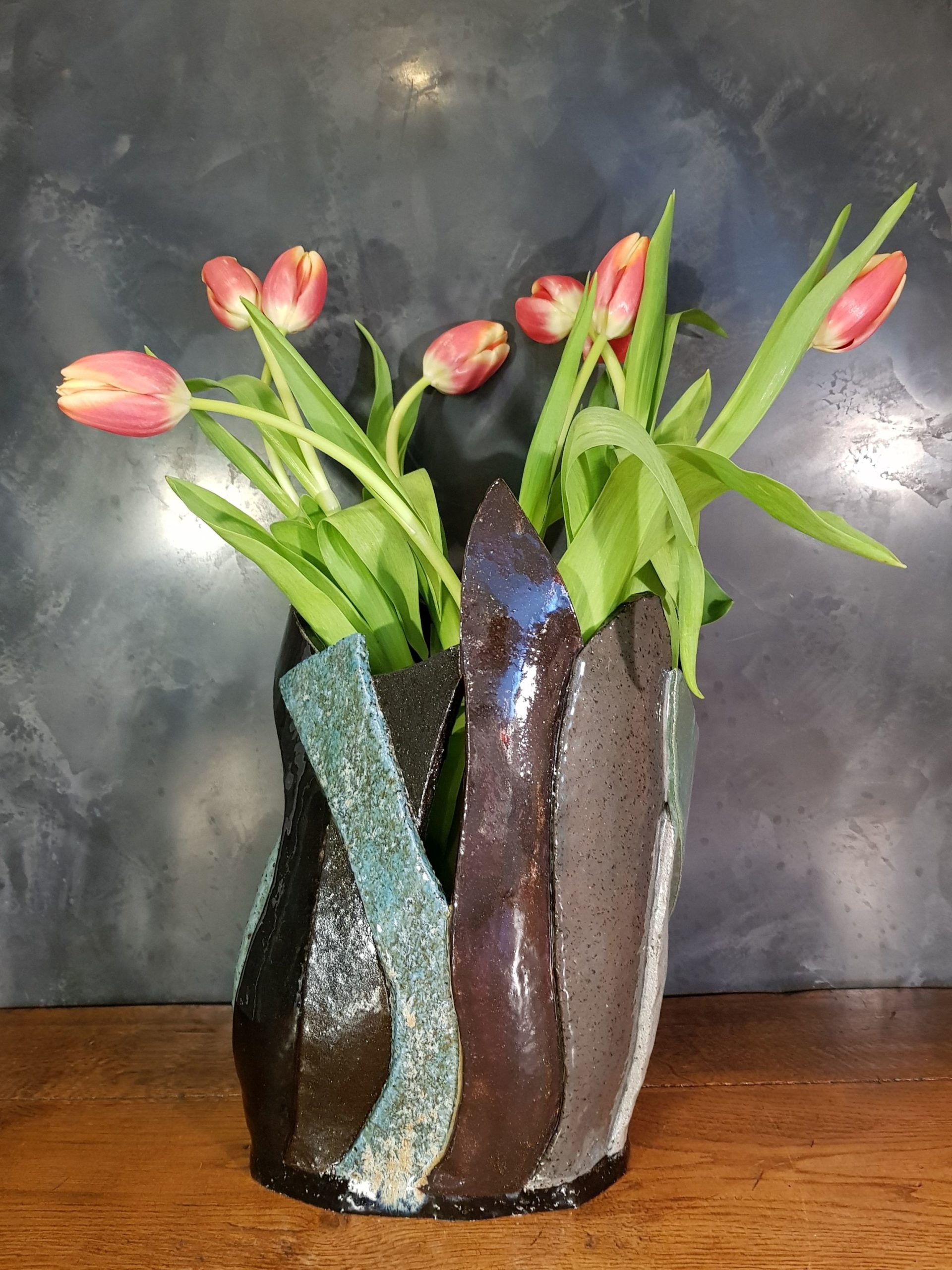 Vase Genoveva habe ich aus drei verschieden groben und farbigen Tonen in Plattentechnik gefertigt. Nach dem Schrühbrand (1.Brand) habe ich sie außen mit acht verschiedenen, perfekt aufeinander abgestimmten Glasuren gestrichen, innen ist sie mit einer schwarz glänzend glasiert. Sie wurde bei 1220 Grad im Glasurbrand zu einer Steinzeugvase gebrannt.