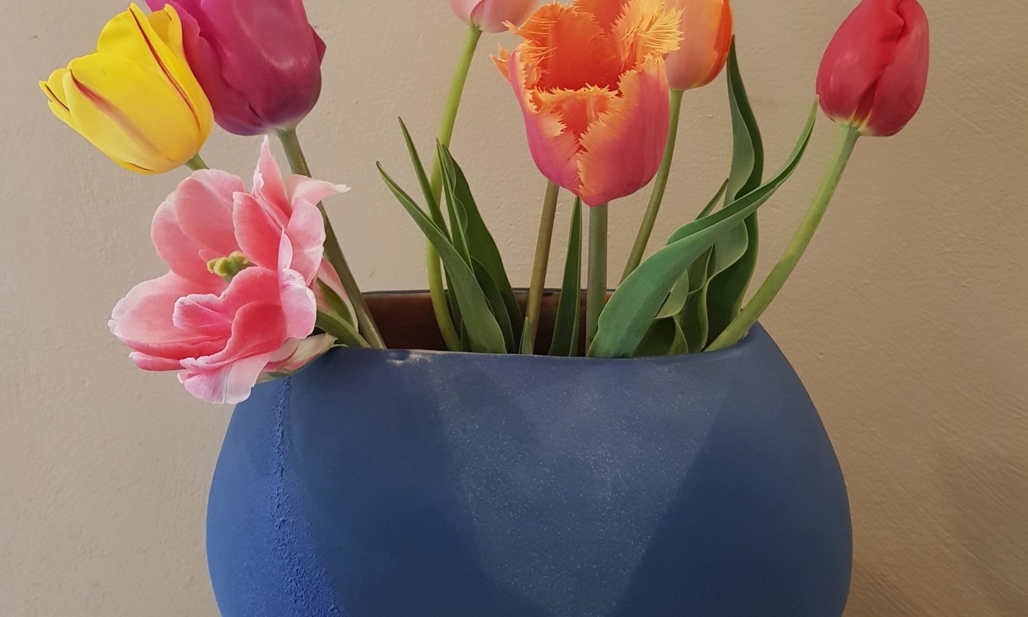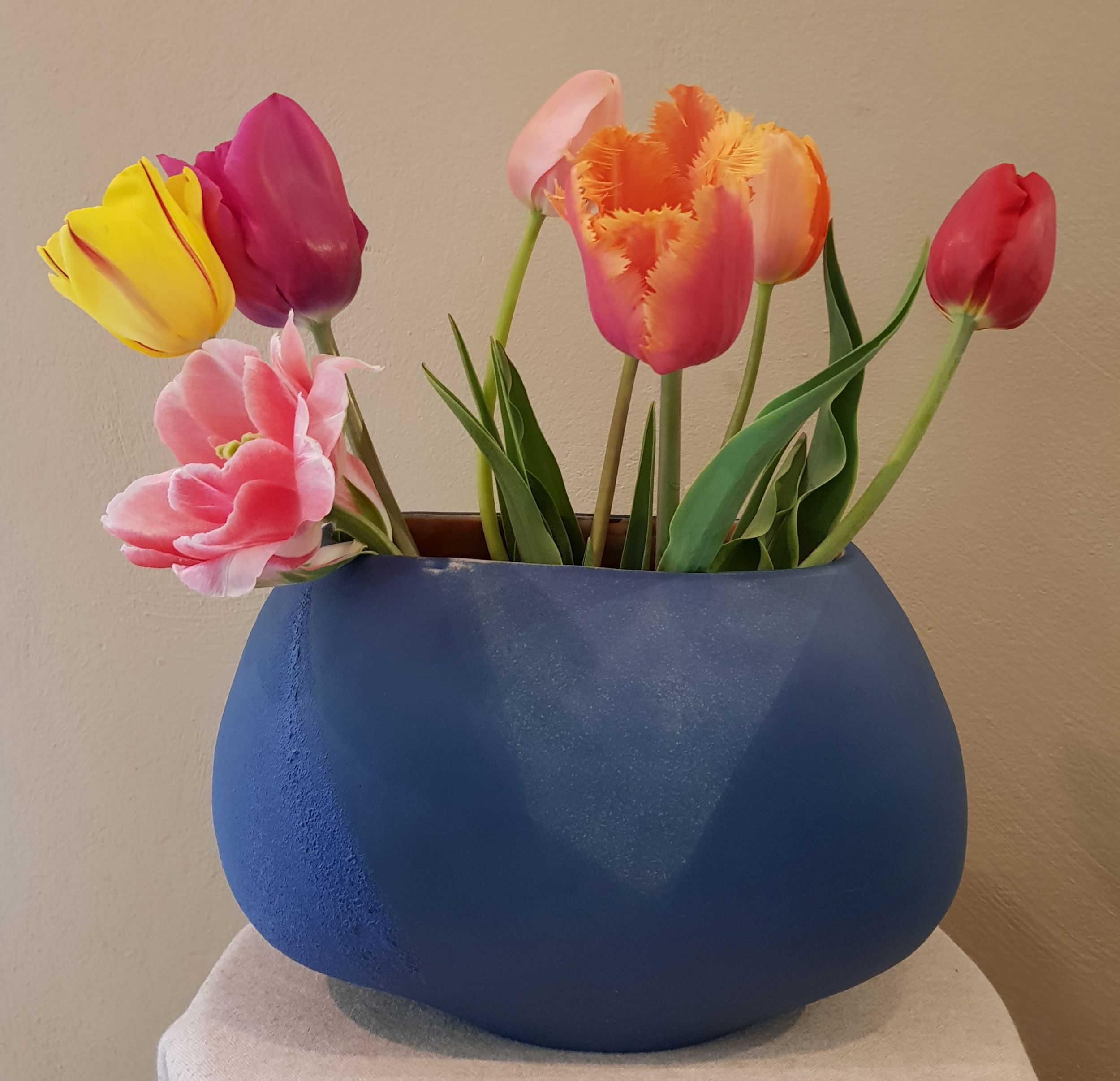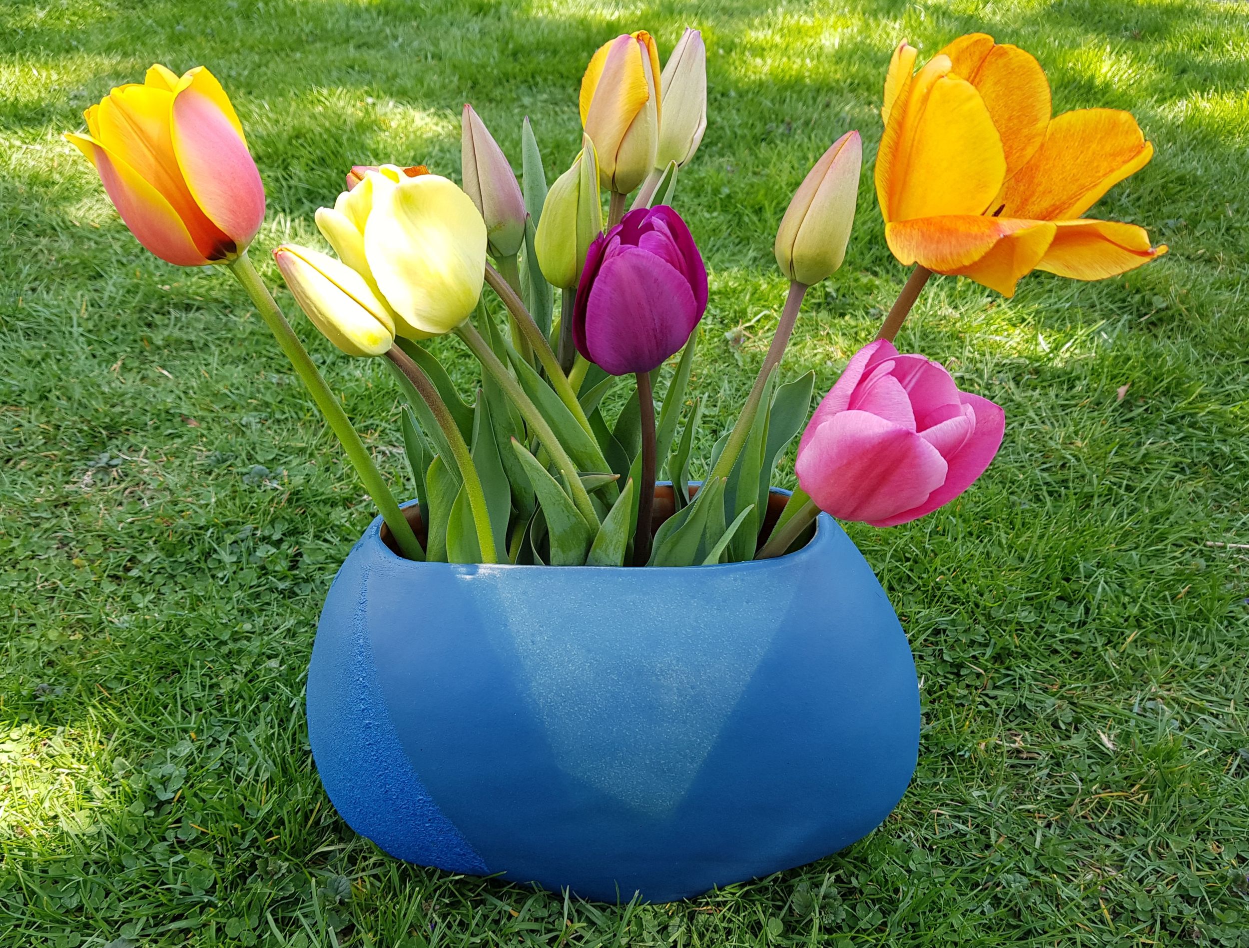 Vase Michael Michael habe ich in Aufbautechnik aus weißem, feinen Ton gefertigt. Außen habe ich ihn mit einer Mischung aus verschiedenen Engoben übergossen. Innen wurde er glasiert. Bei 1240 Grad wurde er zu Steinzeug gebrannt.