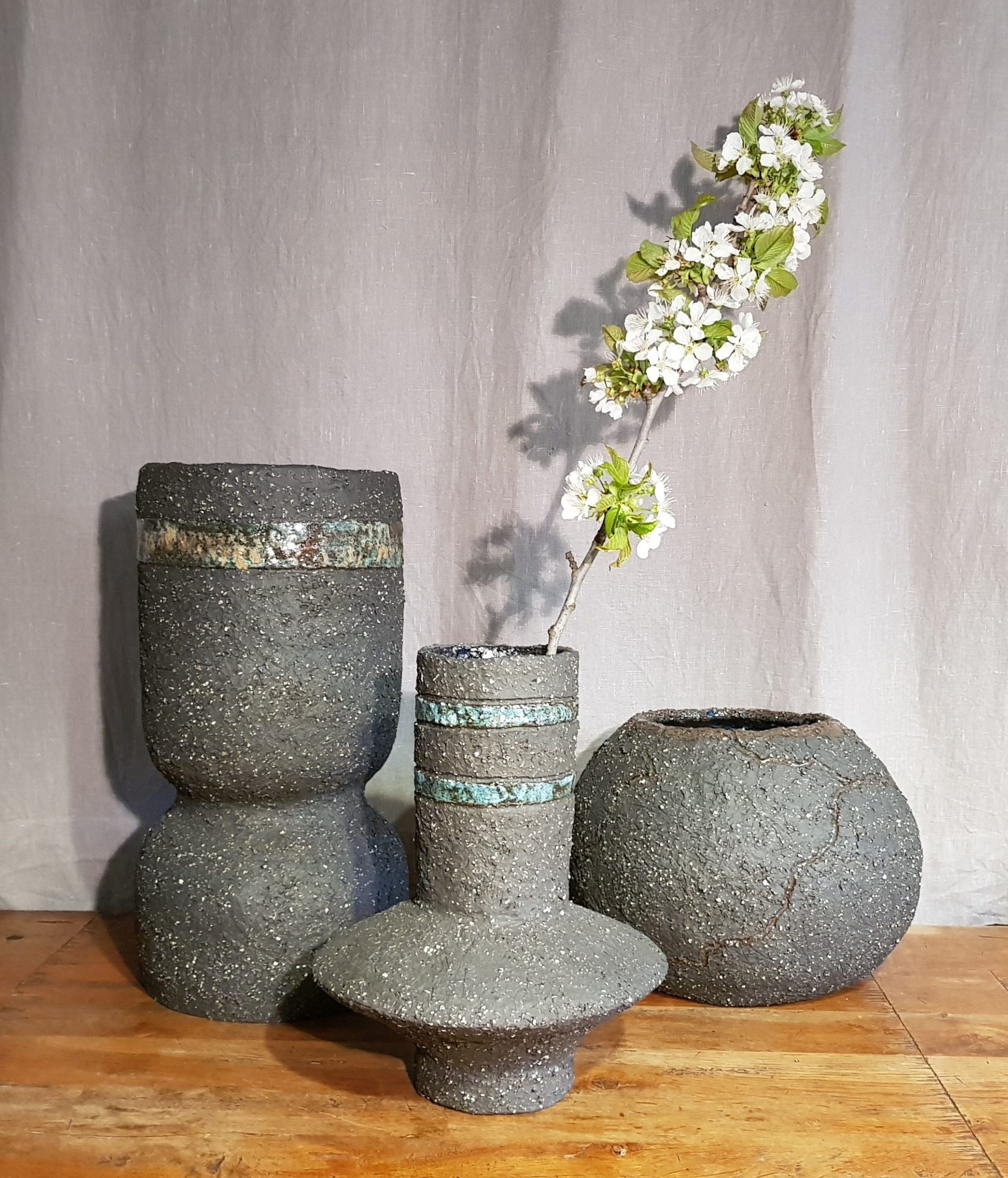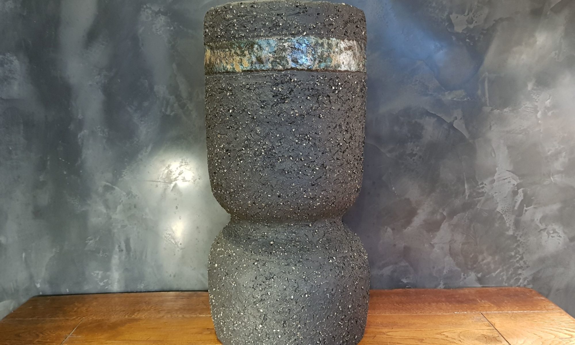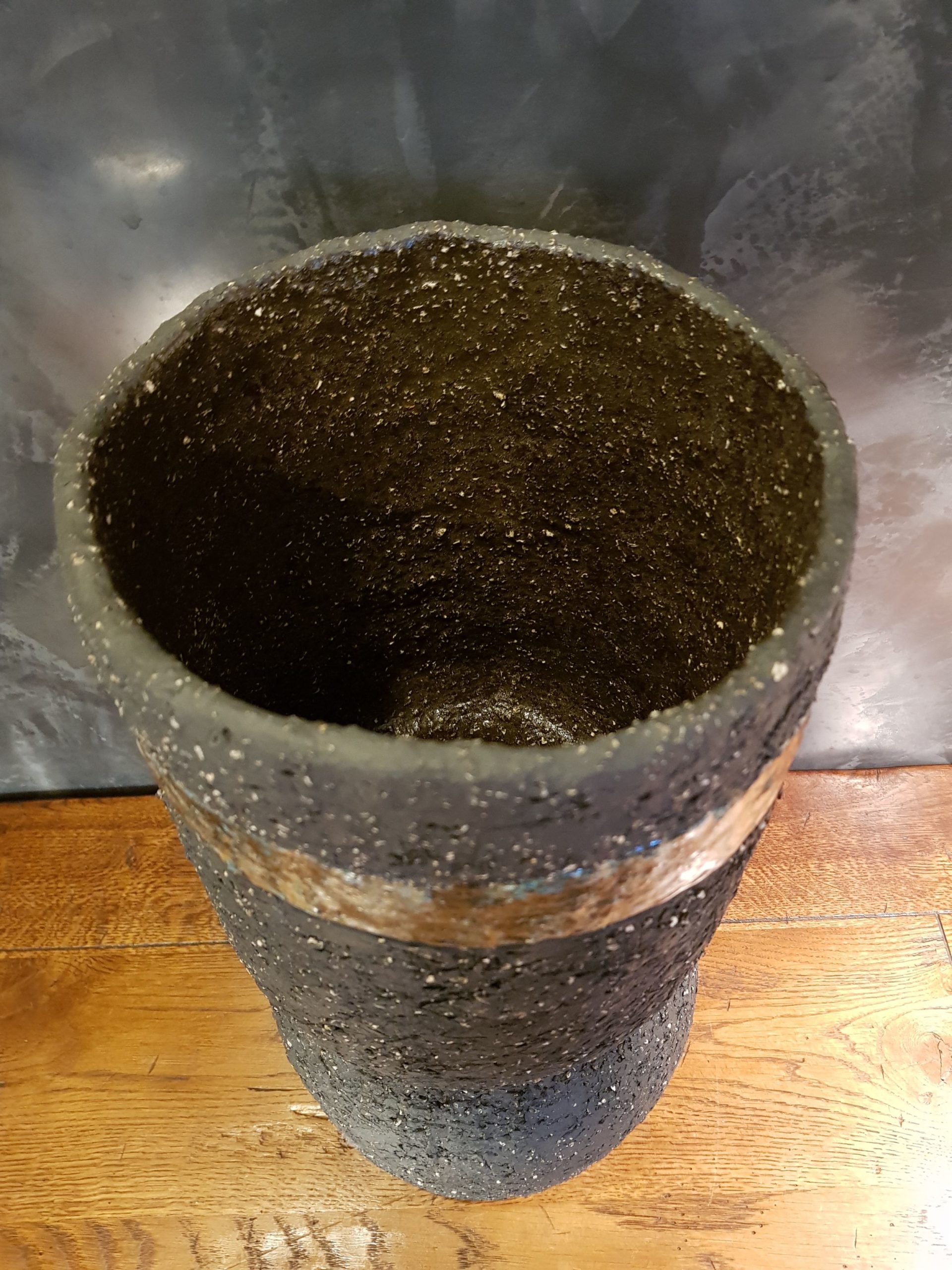 Vase Rupert habe ich aus sehr grob-schamottiertem schwarzem Bildhauerton in Aufbautechnik gefertigt. Da die Schamottkörnung bis zu 3 mm groß ist, kann der Ton beim Brennen nicht abdichten. Rupert ist daher NICHT WASSERDICHT! Er ist für Trockenblumen oder Zweige oder einfach als Dekoobjekt geeignet.