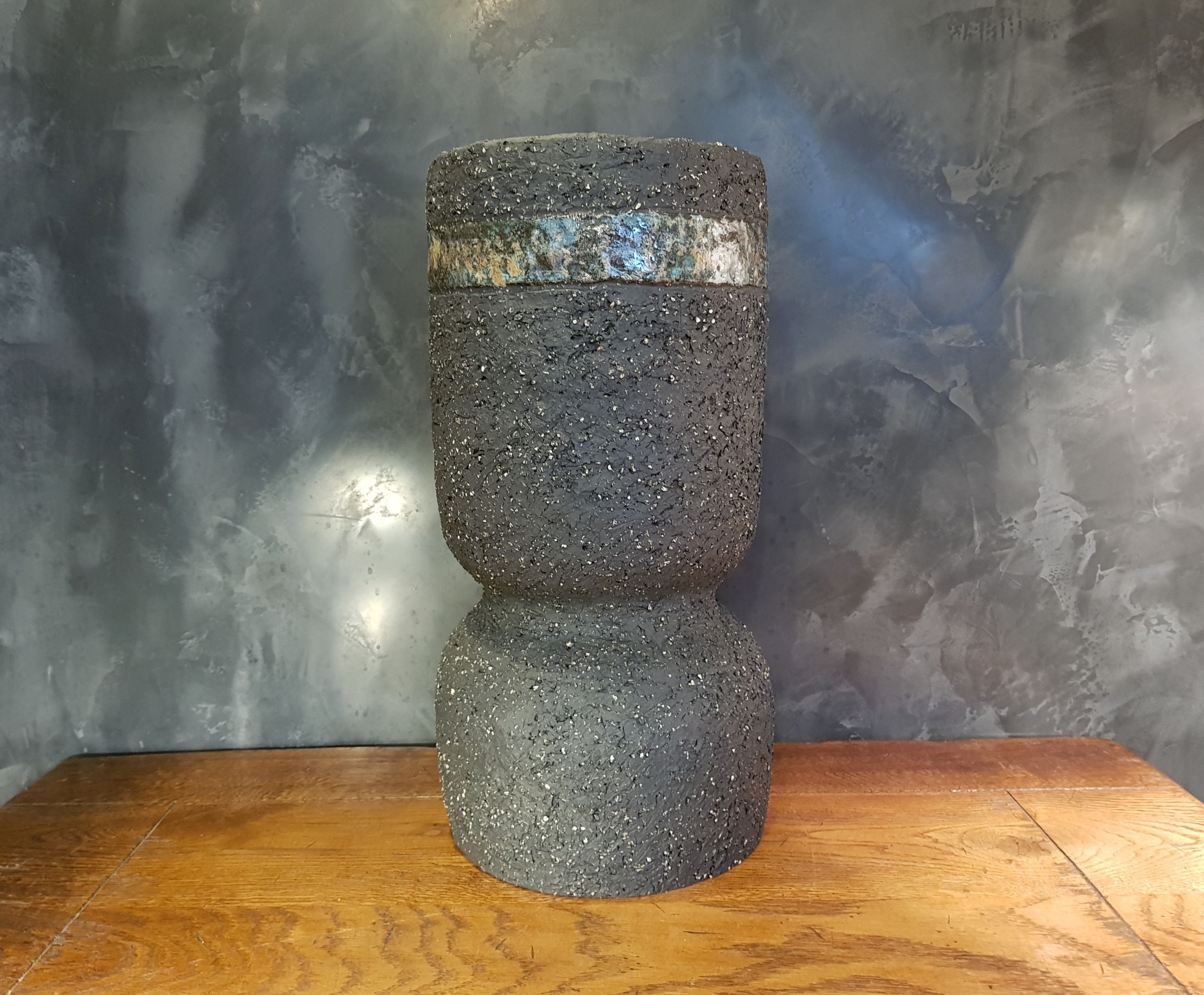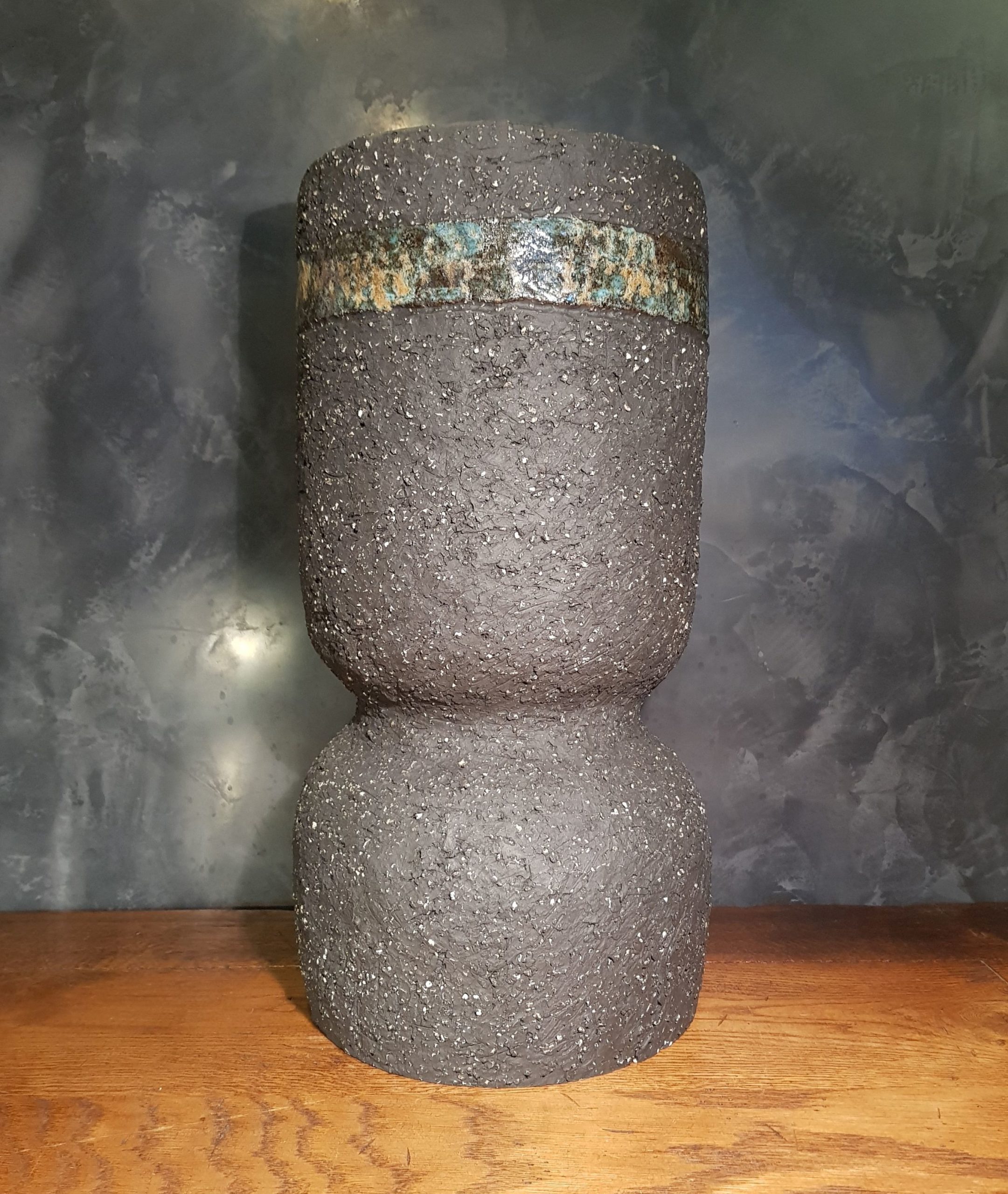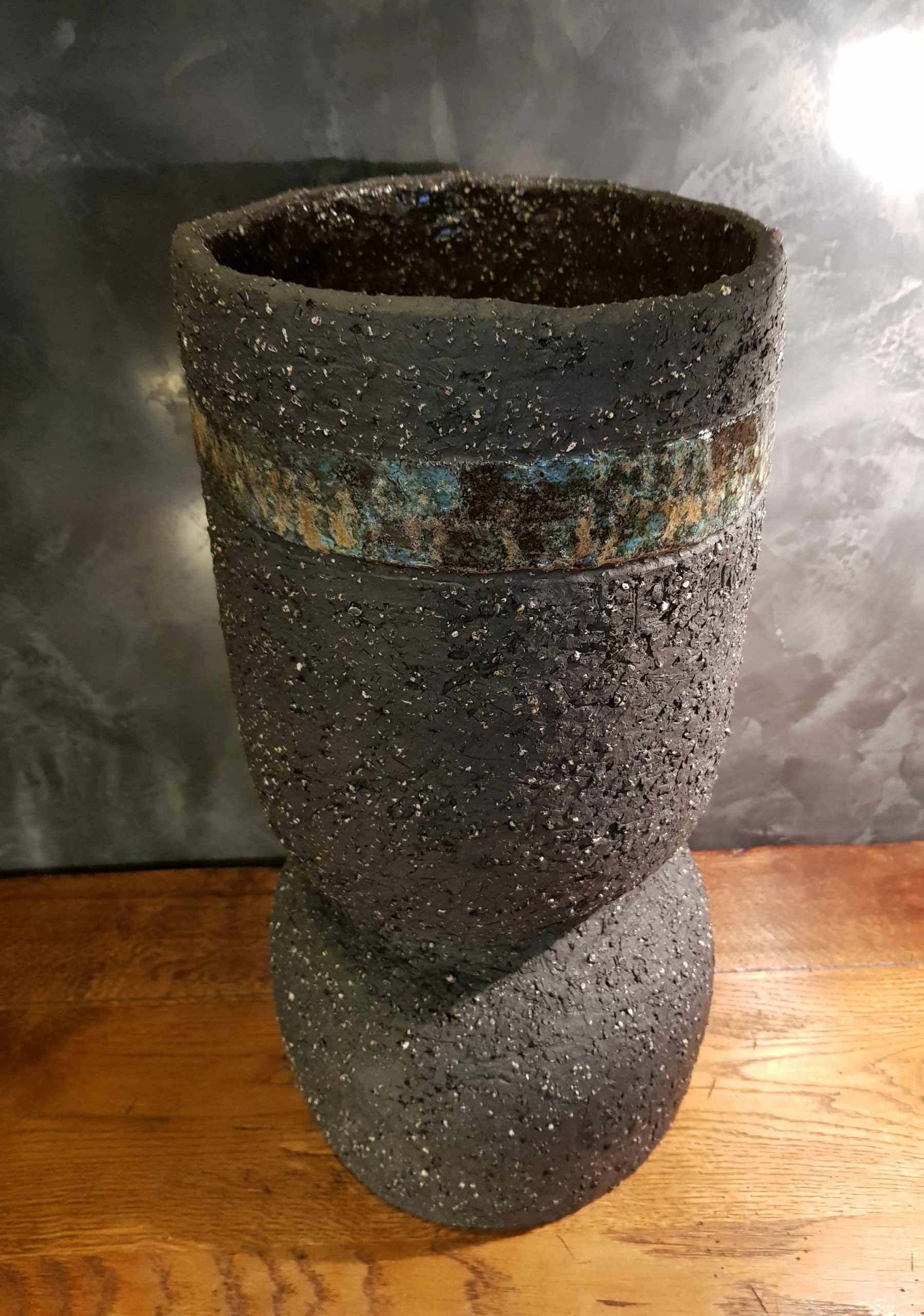 Vase Rupert habe ich aus sehr grob-schamottiertem schwarzem Bildhauerton in Aufbautechnik gefertigt. Da die Schamottkörnung bis zu 3 mm groß ist, kann der Ton beim Brennen nicht abdichten. Rupert ist daher NICHT WASSERDICHT! Er ist für Trockenblumen oder Zweige oder einfach als Dekoobjekt geeignet.