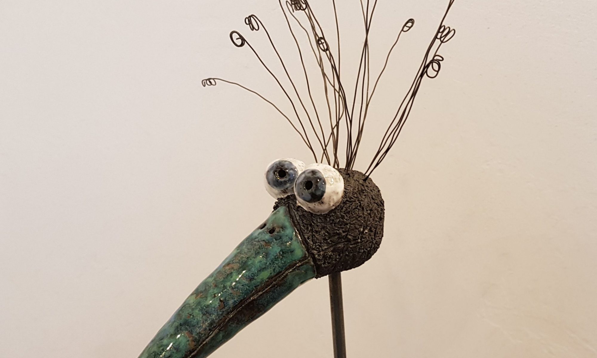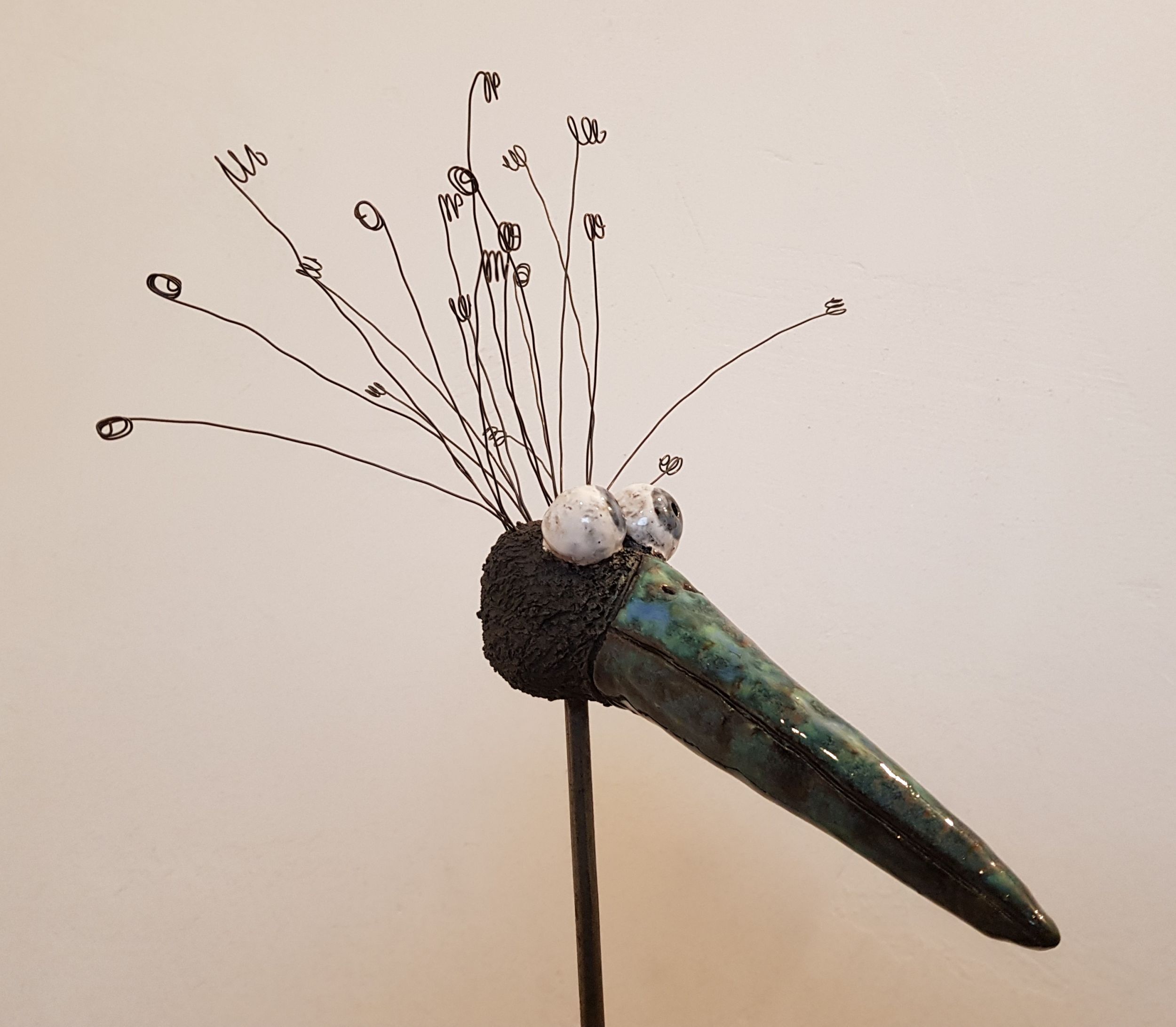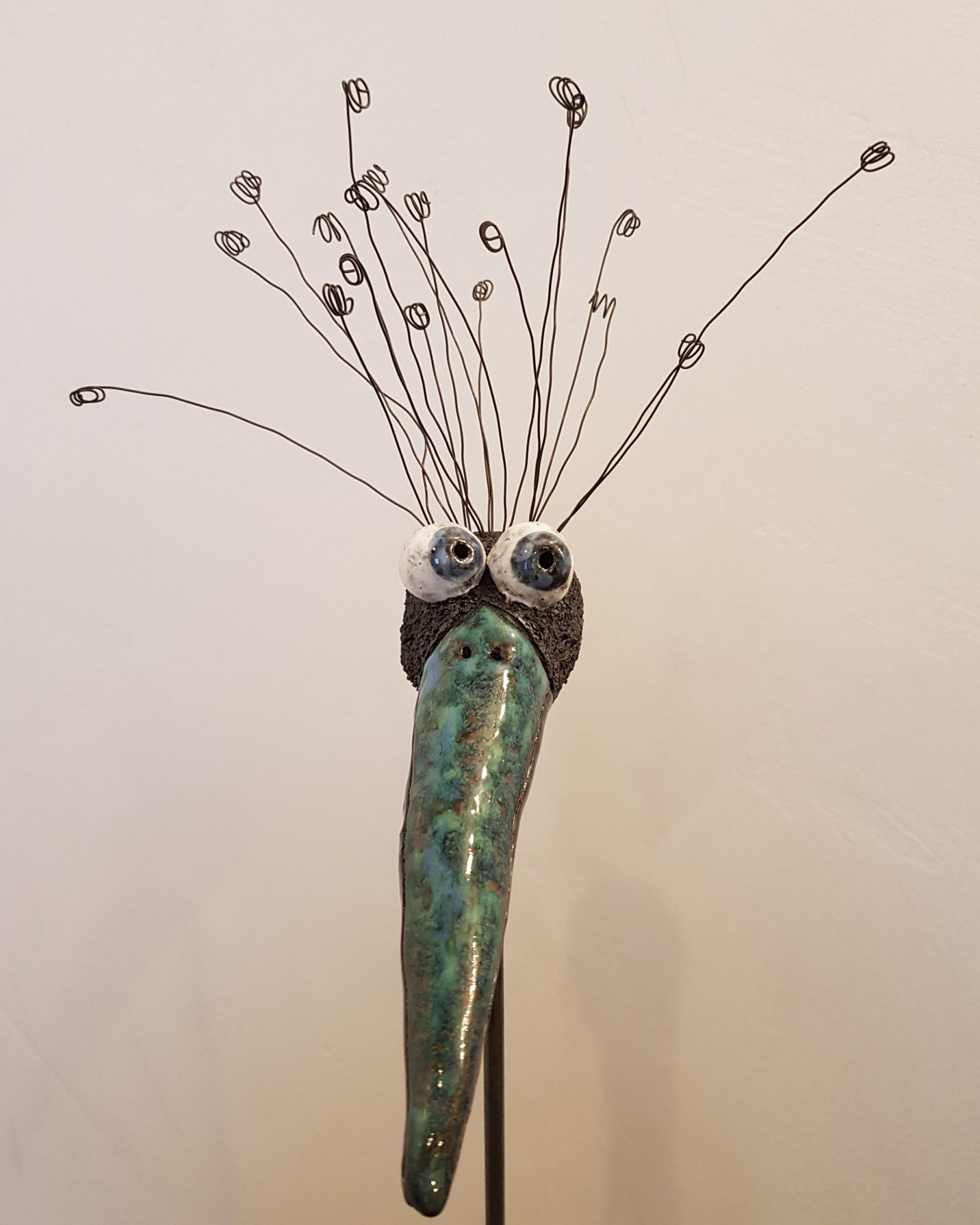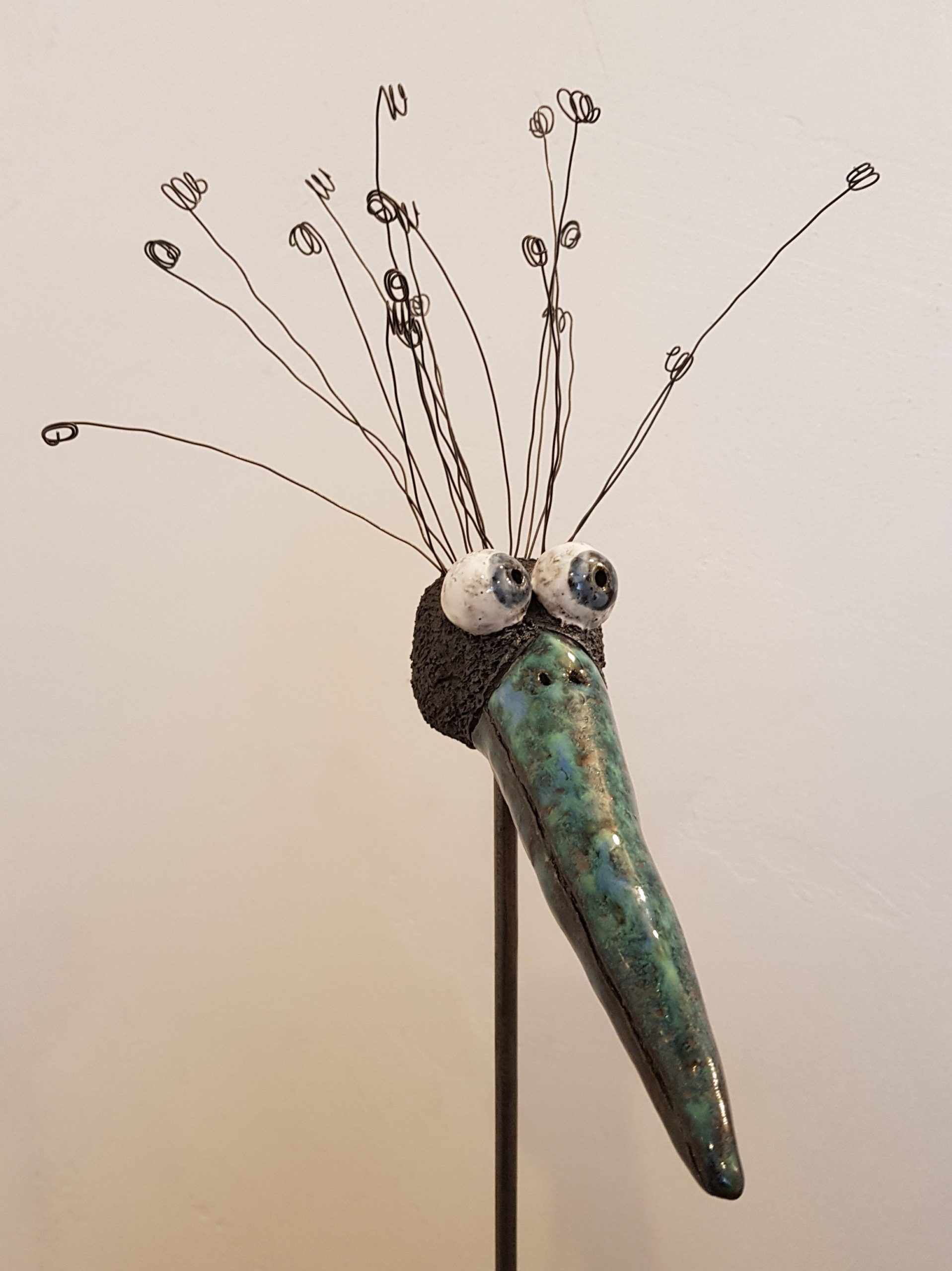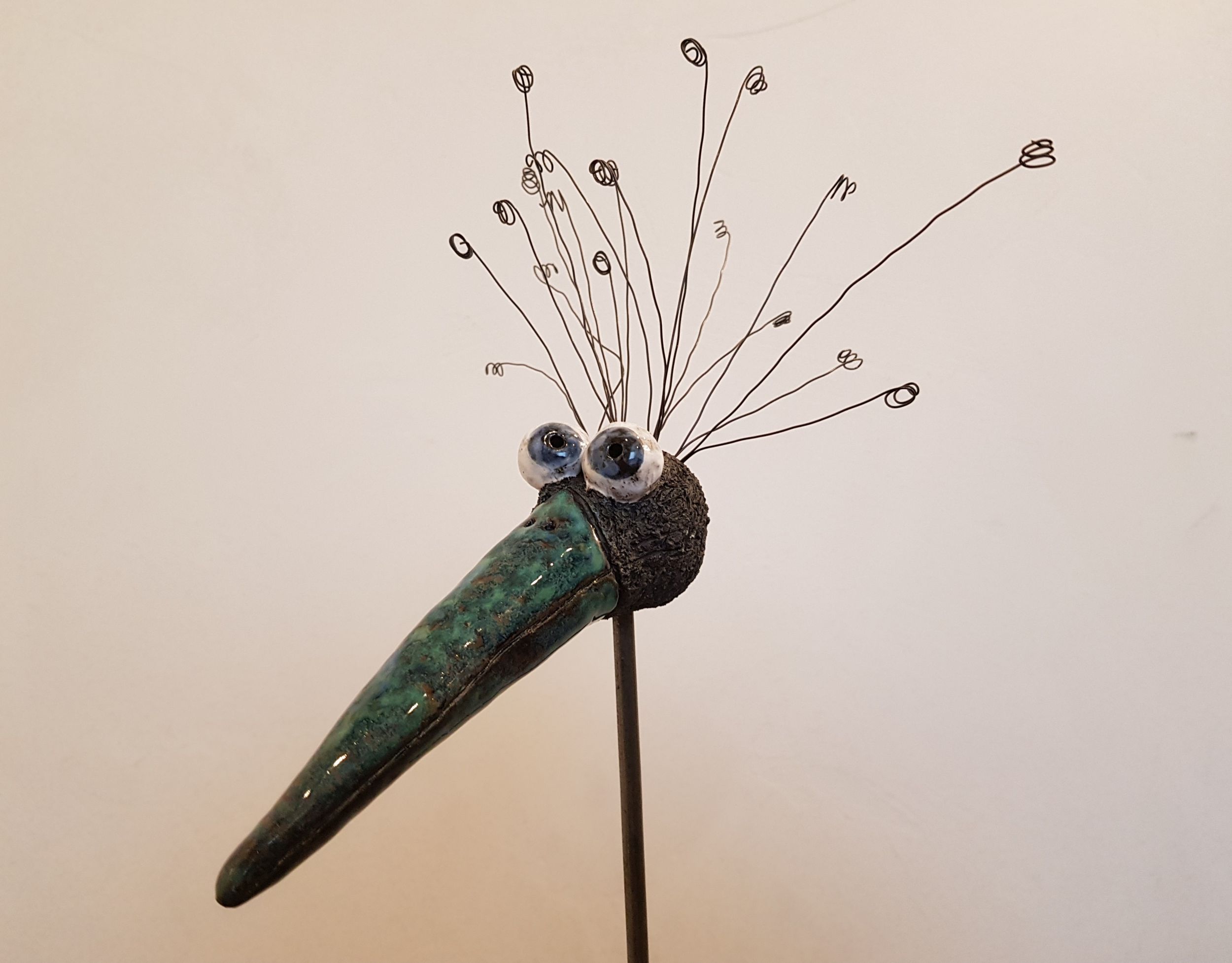 Am Oberkopf habe ich kleine Löcher gestochen, in die ich die Drahthaare lose gesteckt habe. Sie können jederzeit neu angeordnet und auch ersetzt werden, falls mal eins verloren geht. Für den Versand werden die Drahthaare gesondert verpackt. Wenn man den Vogelkopf im Garten aufstellt, rosten die Drahthaare, was sehr hübsch aussieht. Aber auch in einem größeren Pflanzentopf im Haus macht er sich gut!