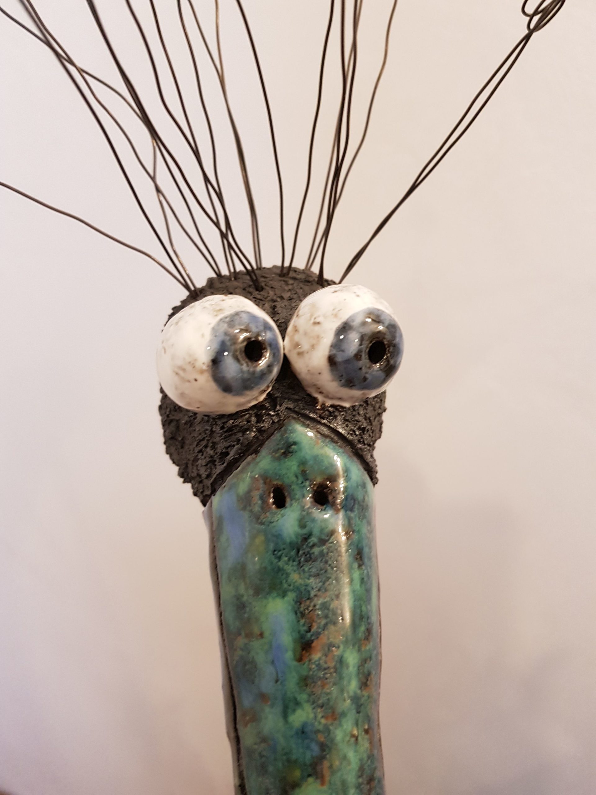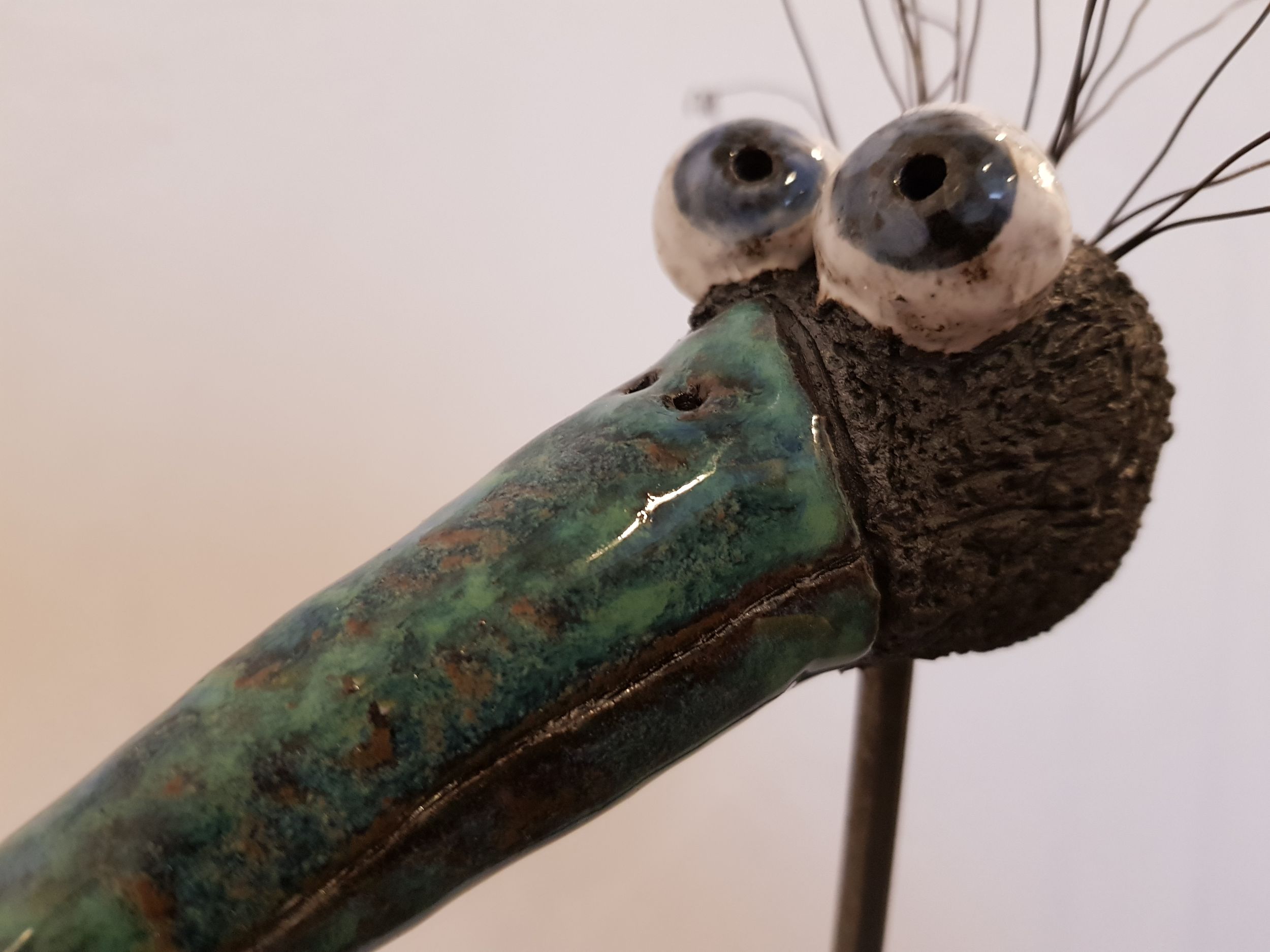 Den Vogelkopf Anton habe ich aus schwarzem Ton gefertigt. Nach dem ersten Brand wurden der Schnabel und die Augen mit weißem Ton überzogen und ein zweites Mal gebrannt. Hierdurch wird sichergestellt, dass sich die Farbe des schwarzen Tons bei den hohen Temperaturen nicht mit der Glasur vermischt. Der Schnabel und die Augen habe ich dann mit je drei Schichten verschiedener Glasuren überzogen, die beim anschließenden Glasurbrand einen wunderschönen, hochglänzenden Verlauf bildeten.